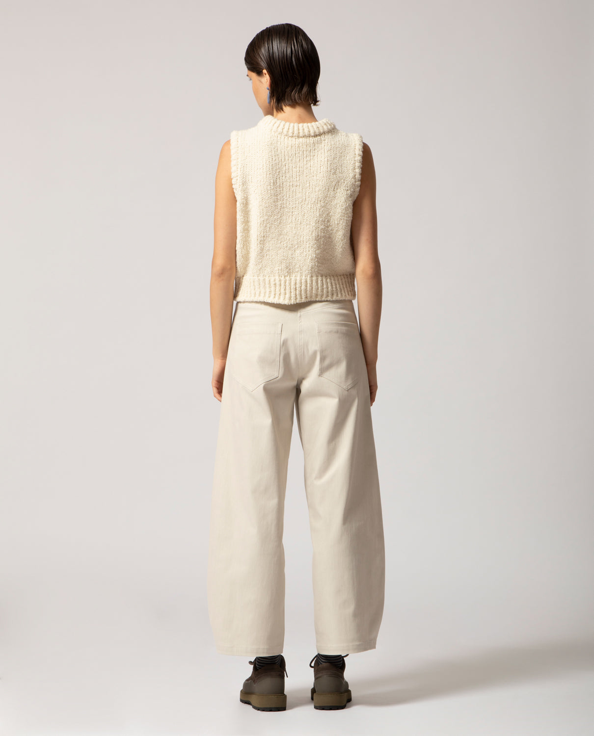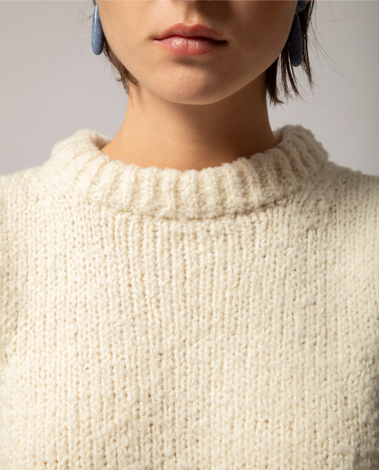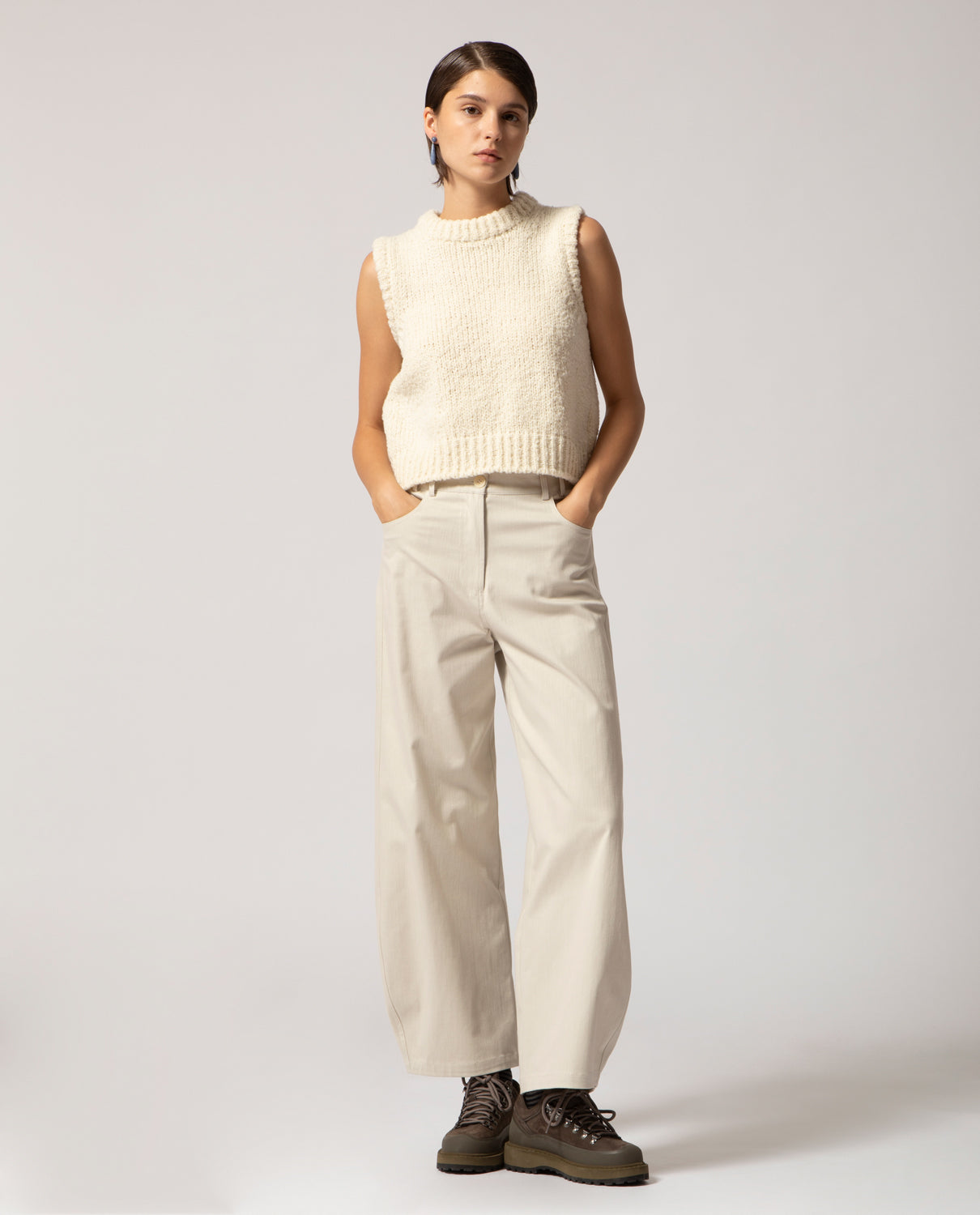 A warm gilet handcrafted from pure merino wool yarn, specially worked to create a voluminous, cloud-like texture.