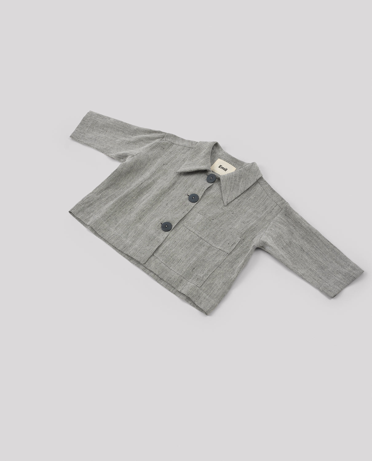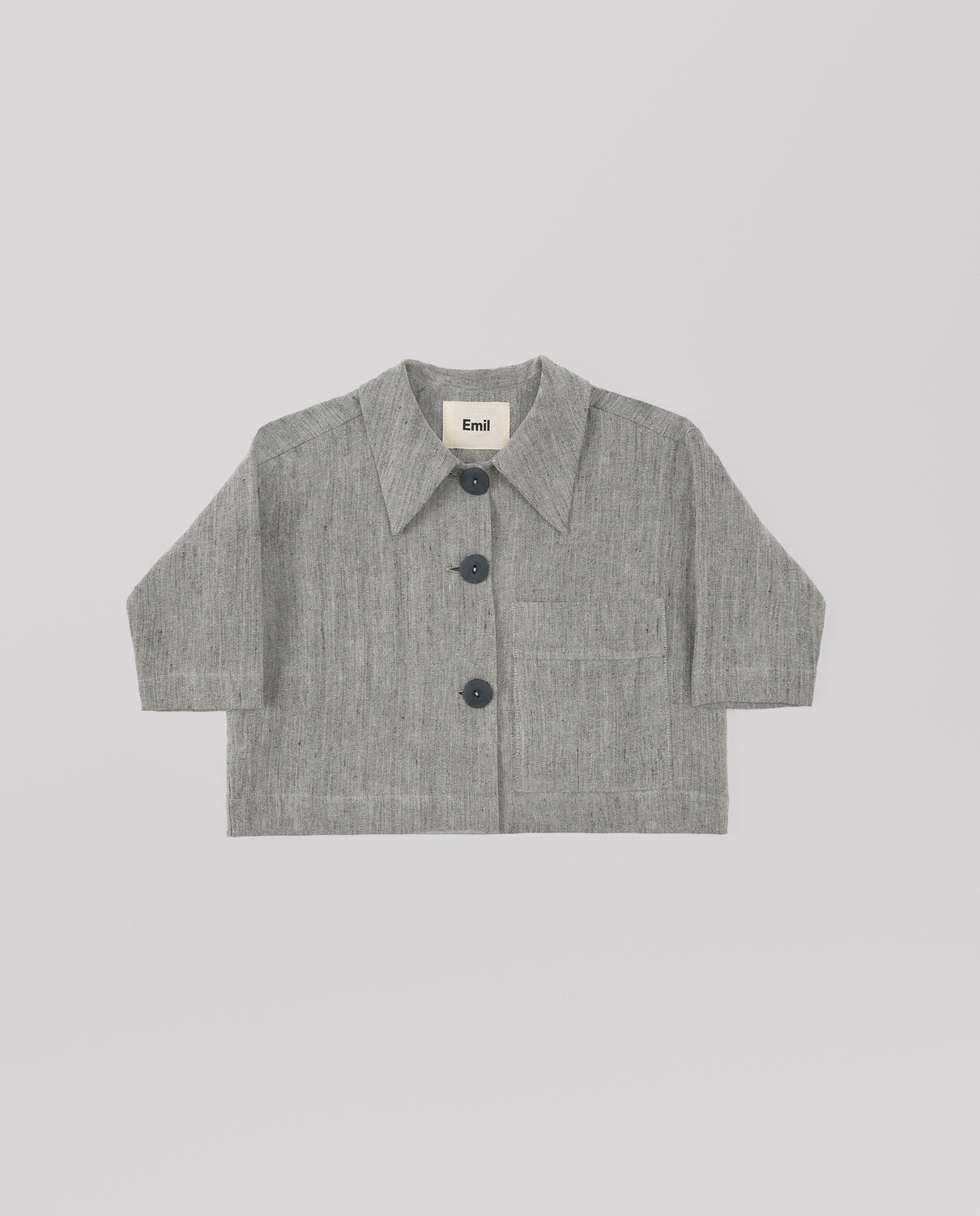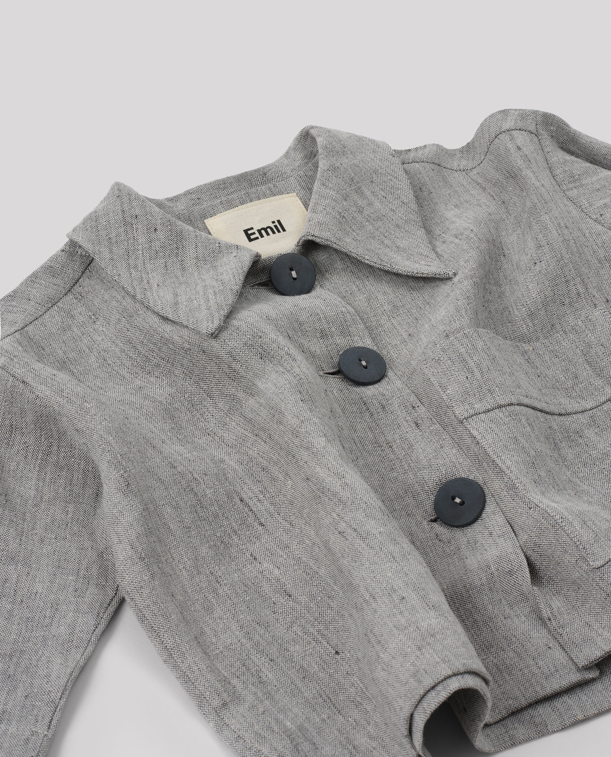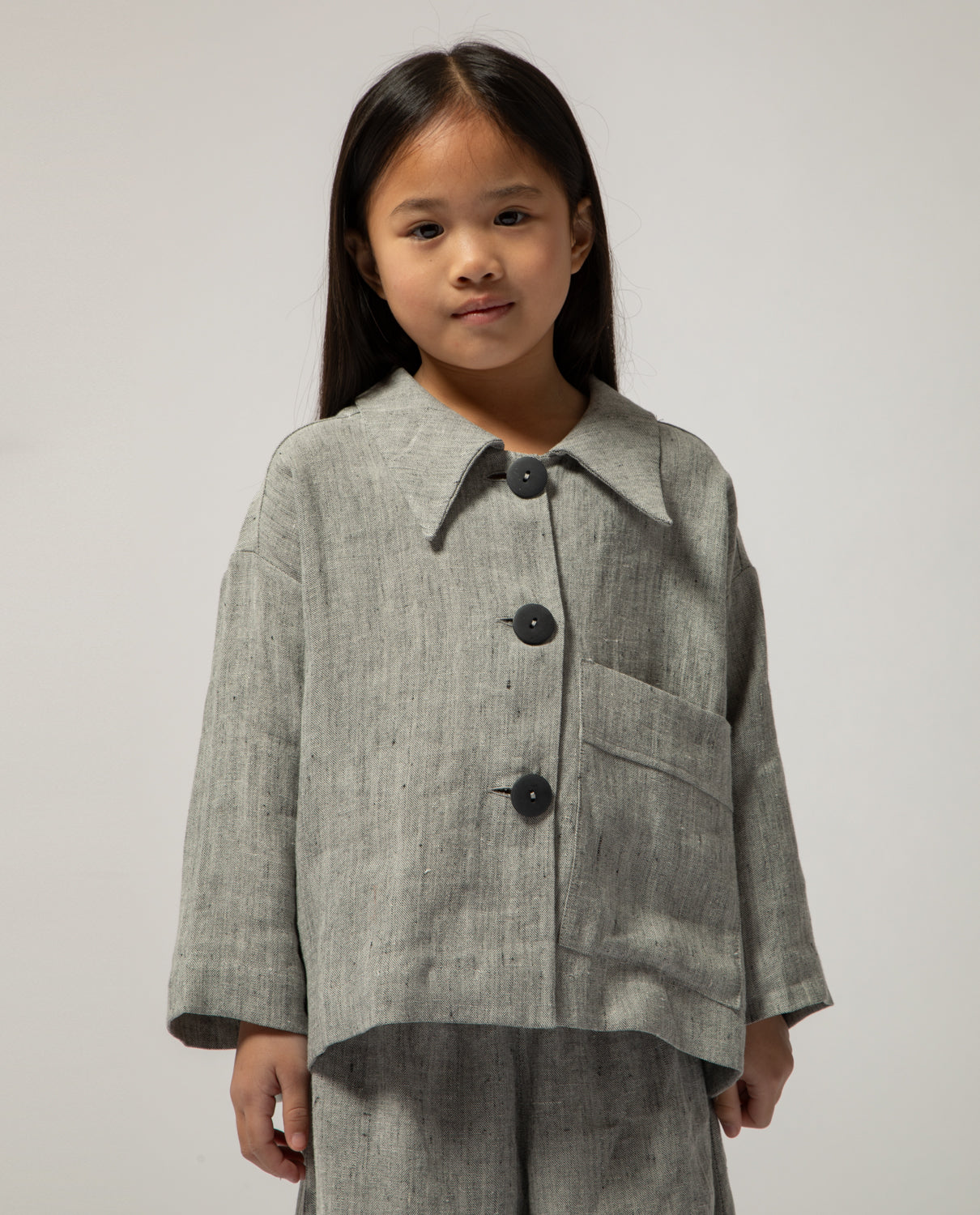 Box jacket in natural linen with 70s-inspired collar and front pocket.