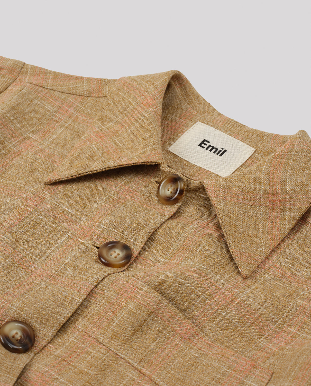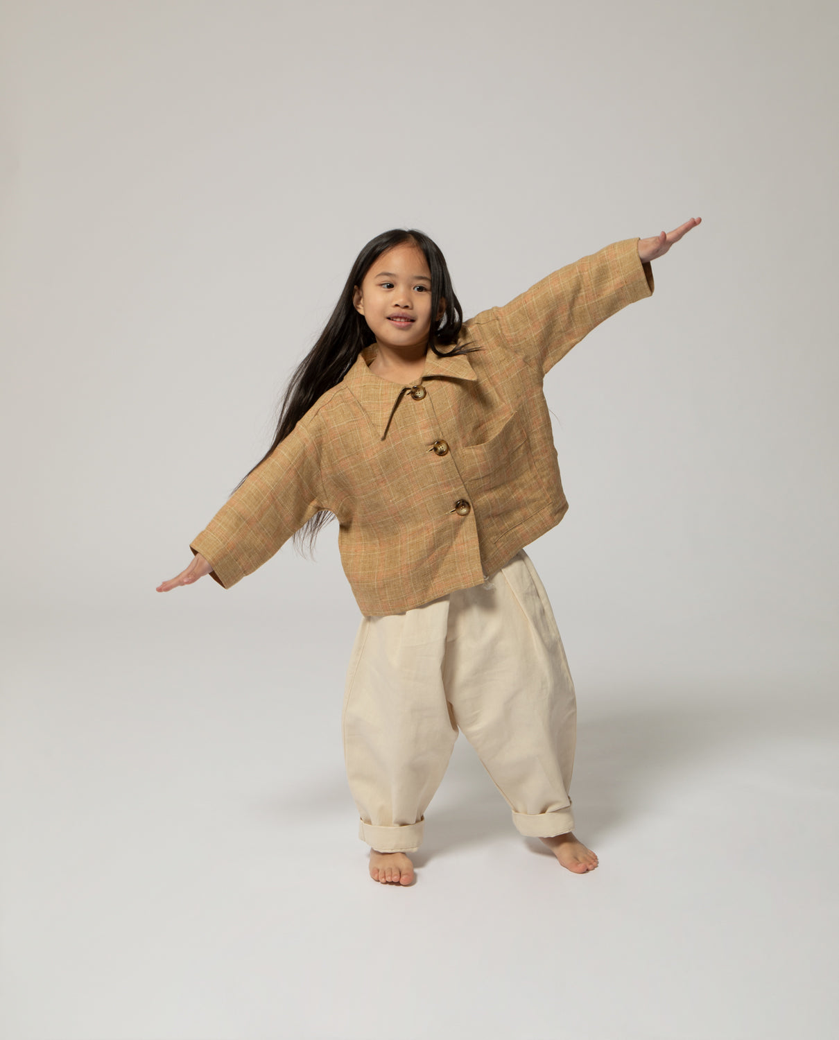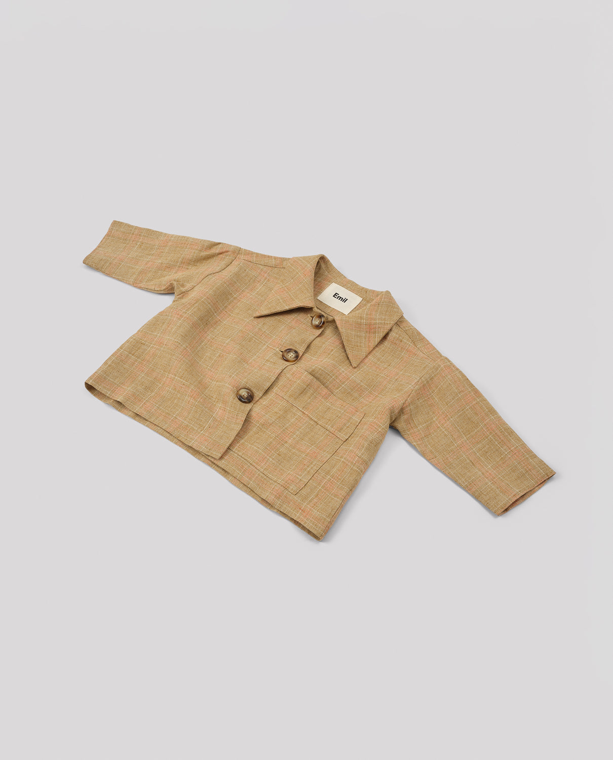 Box jacket in natural linen with 70s-inspired collar and front pocket.