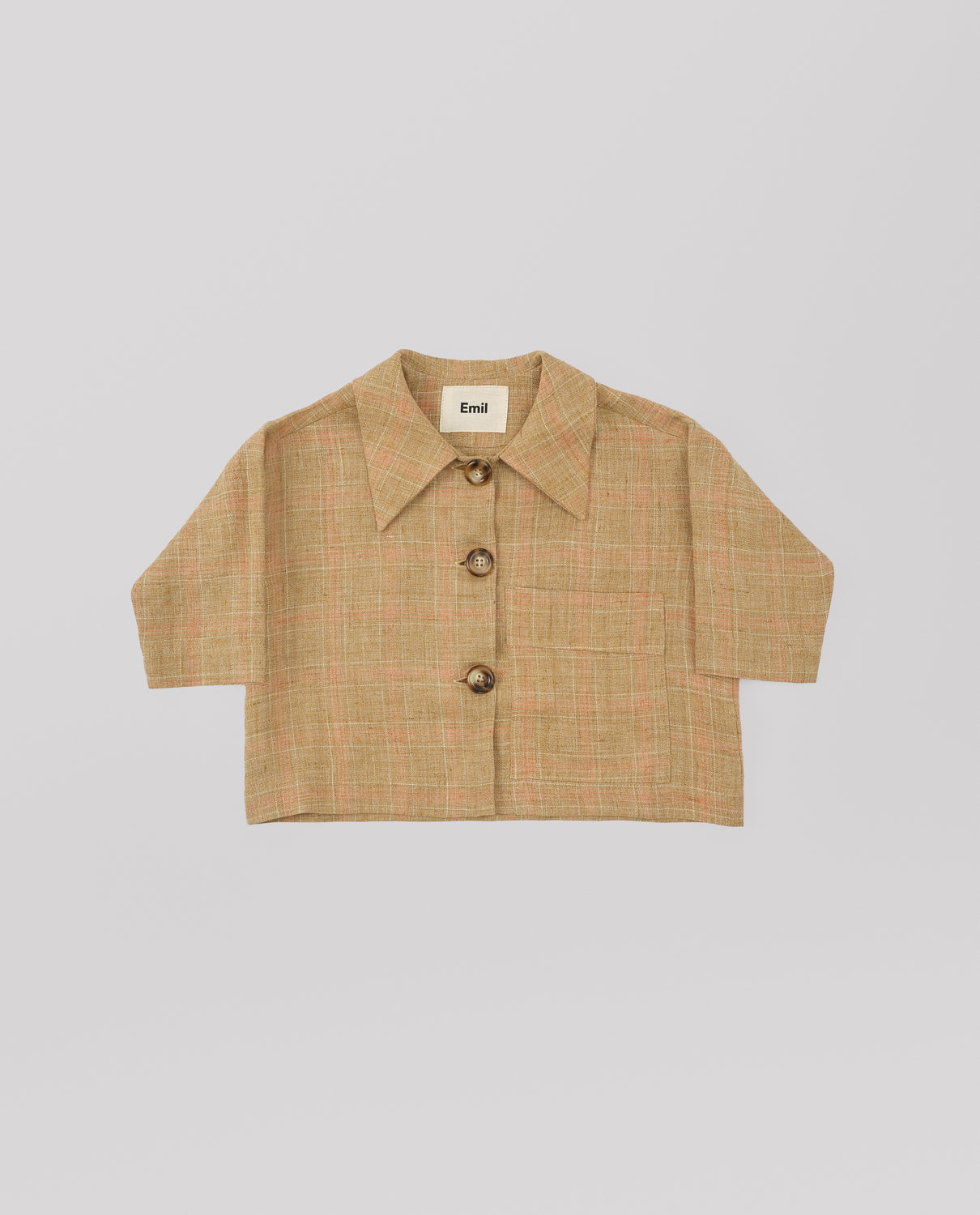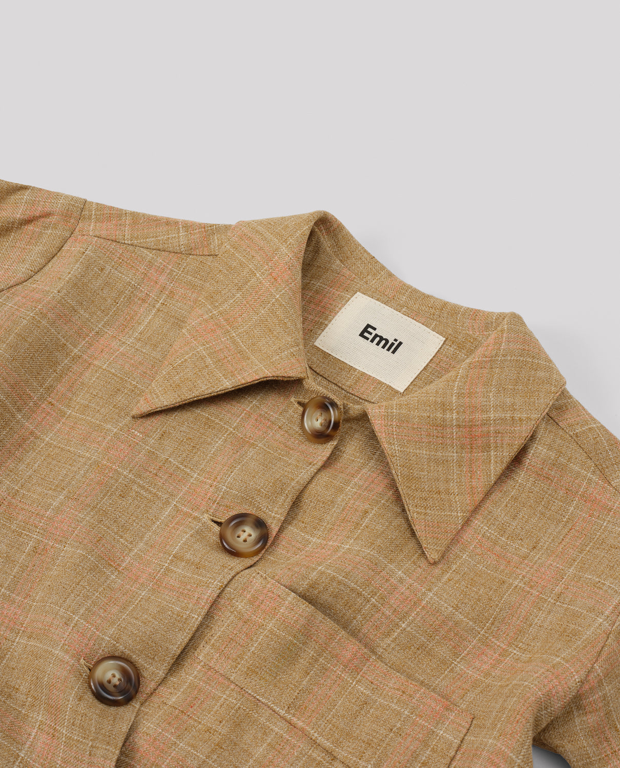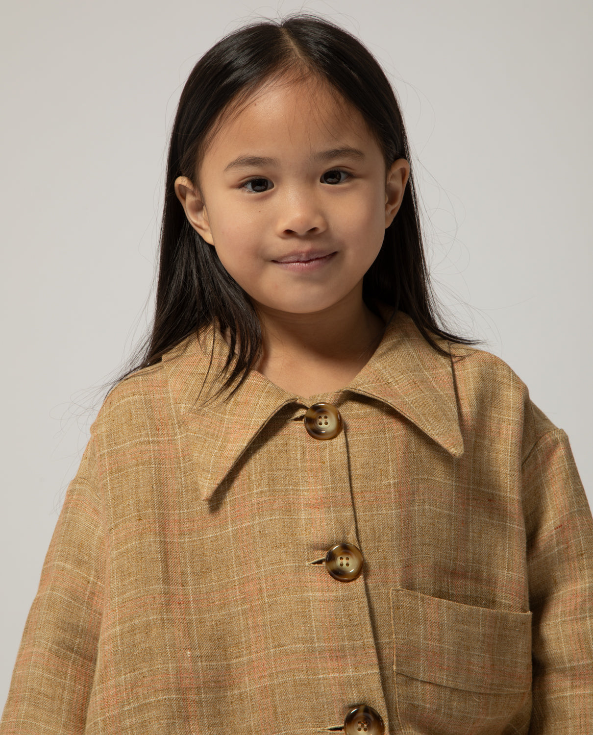 Box jacket in natural linen with 70s-inspired collar and front pocket.