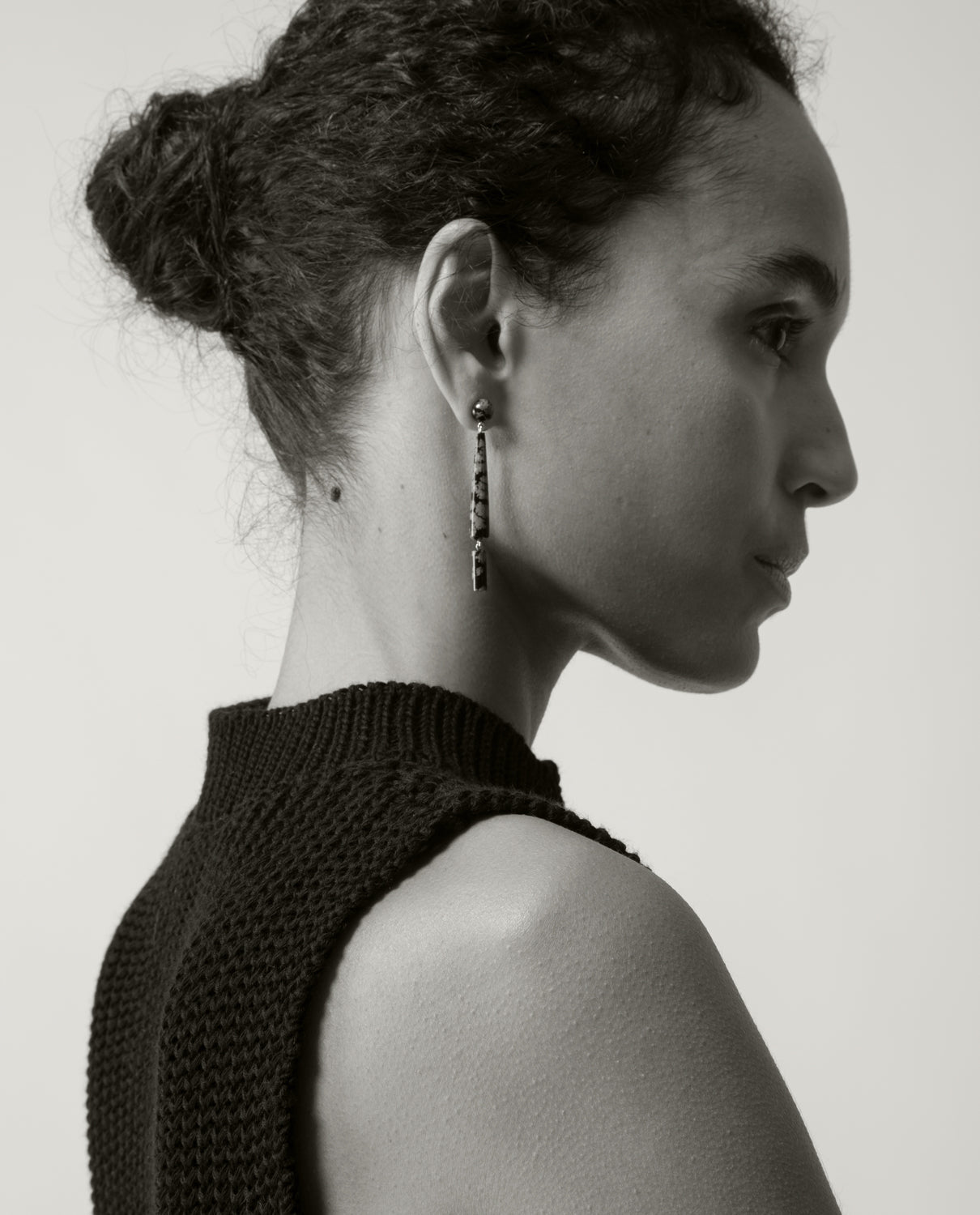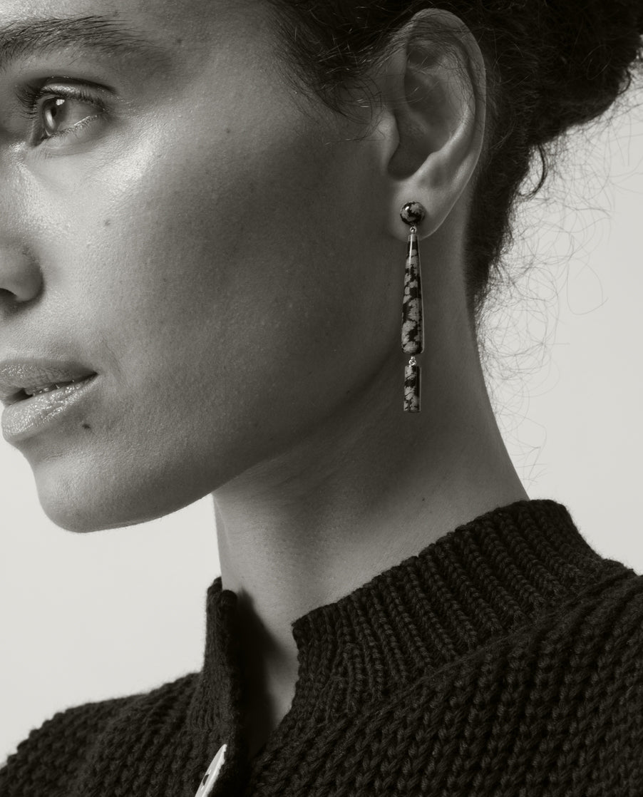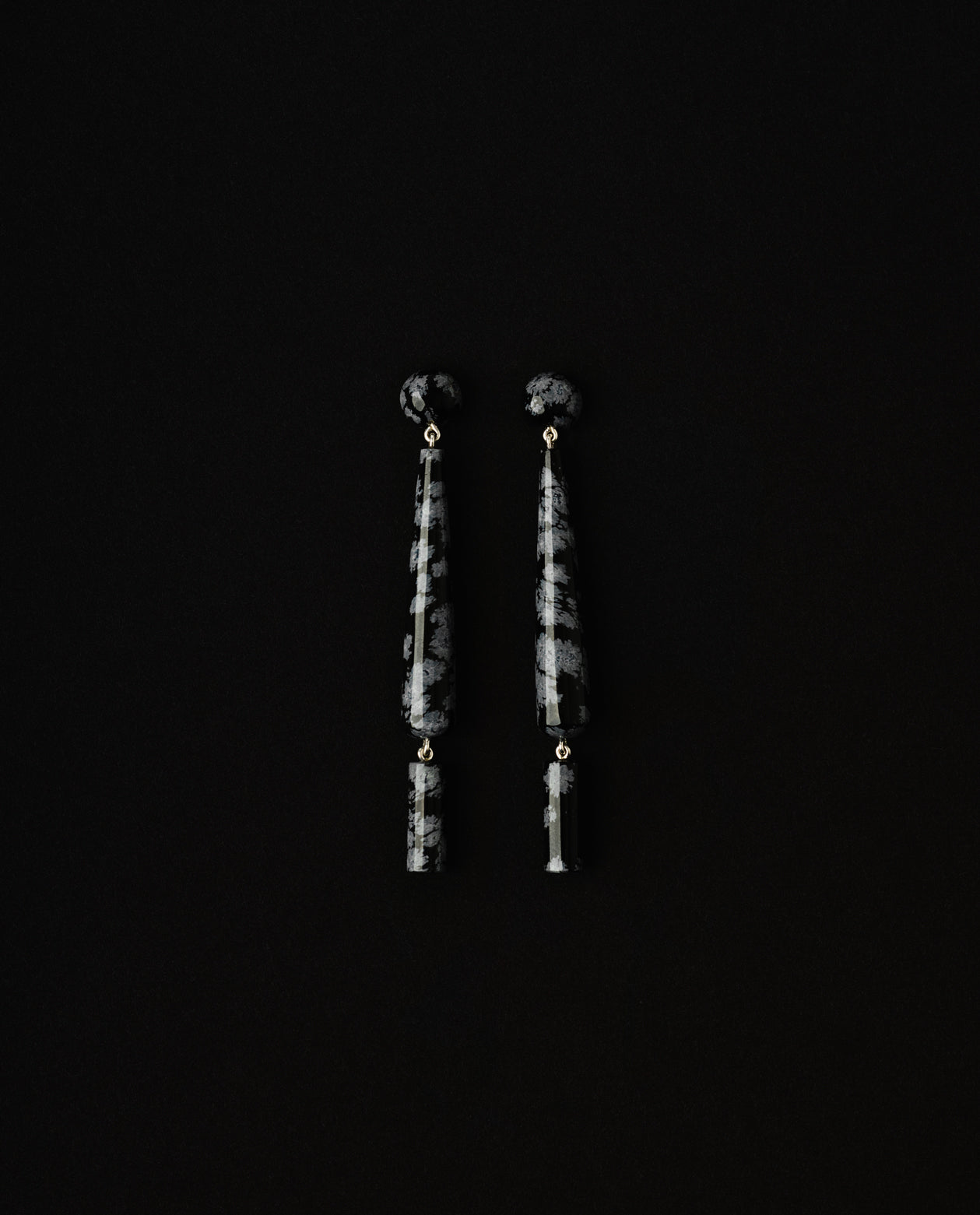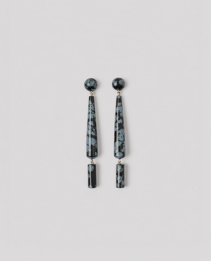 Sculptural handcarved earrings in snowflake obsidian. As this material is naturally sourced, its colours and shades may exhibit slight variations— a quiet reminder of its unique origin.