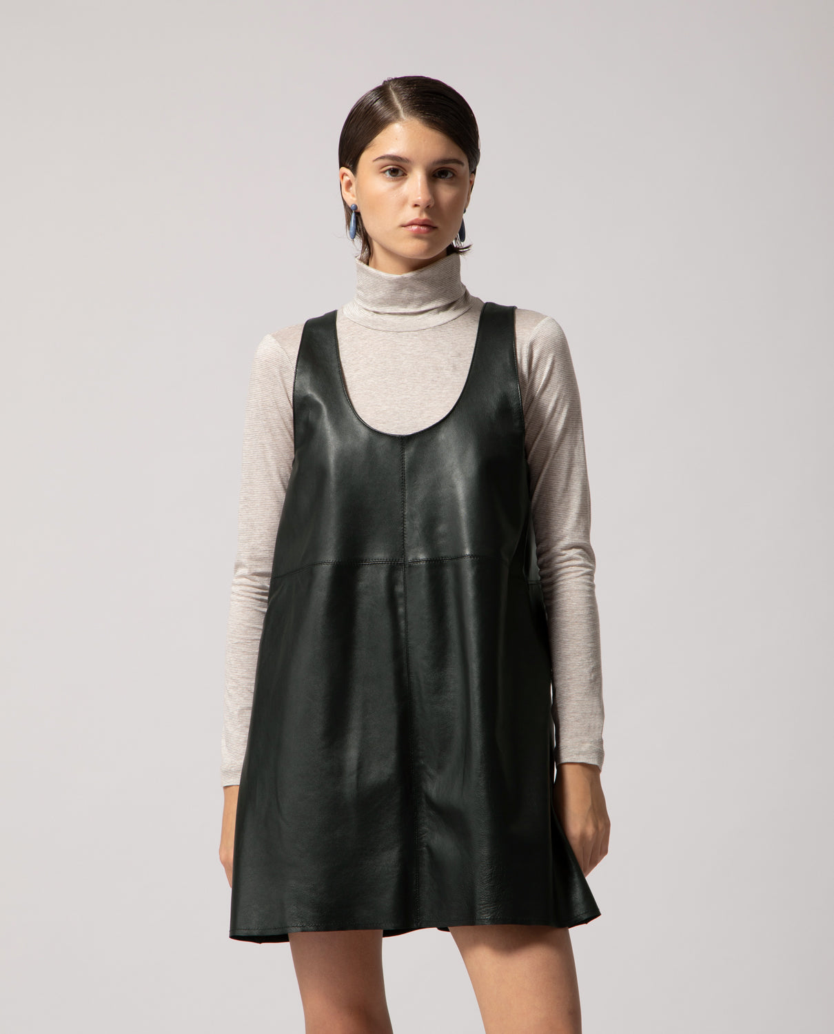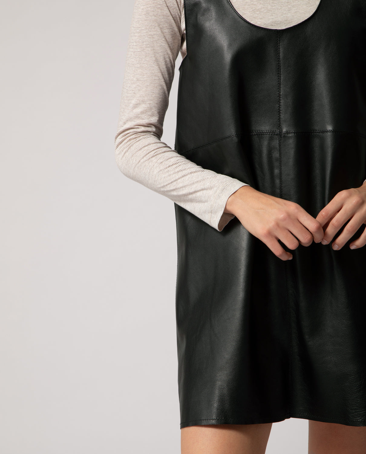 A short leather dress finished with double topstitching, cut to an oversized silhouette designed to comfortably fit sizes S to L.