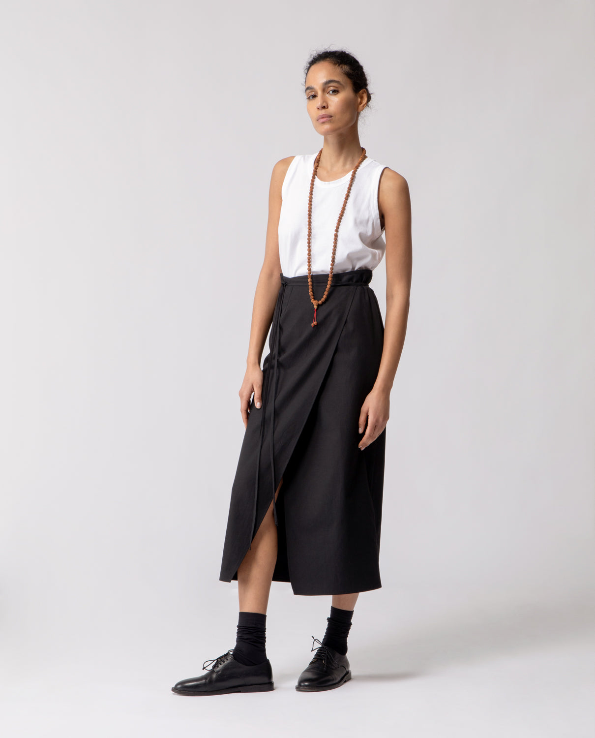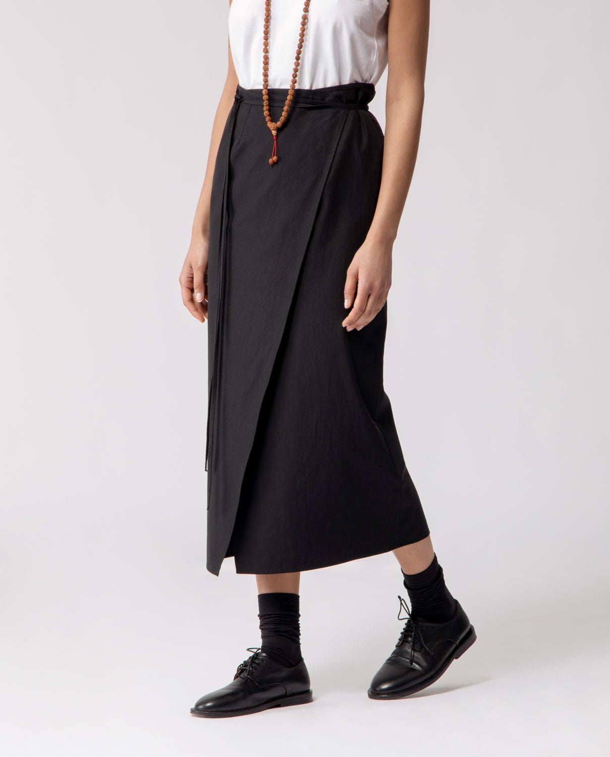 Wrap linen skirt with a slim, pencil silhouette, designed with a long tie fastening at the waist for an adjustable fit.