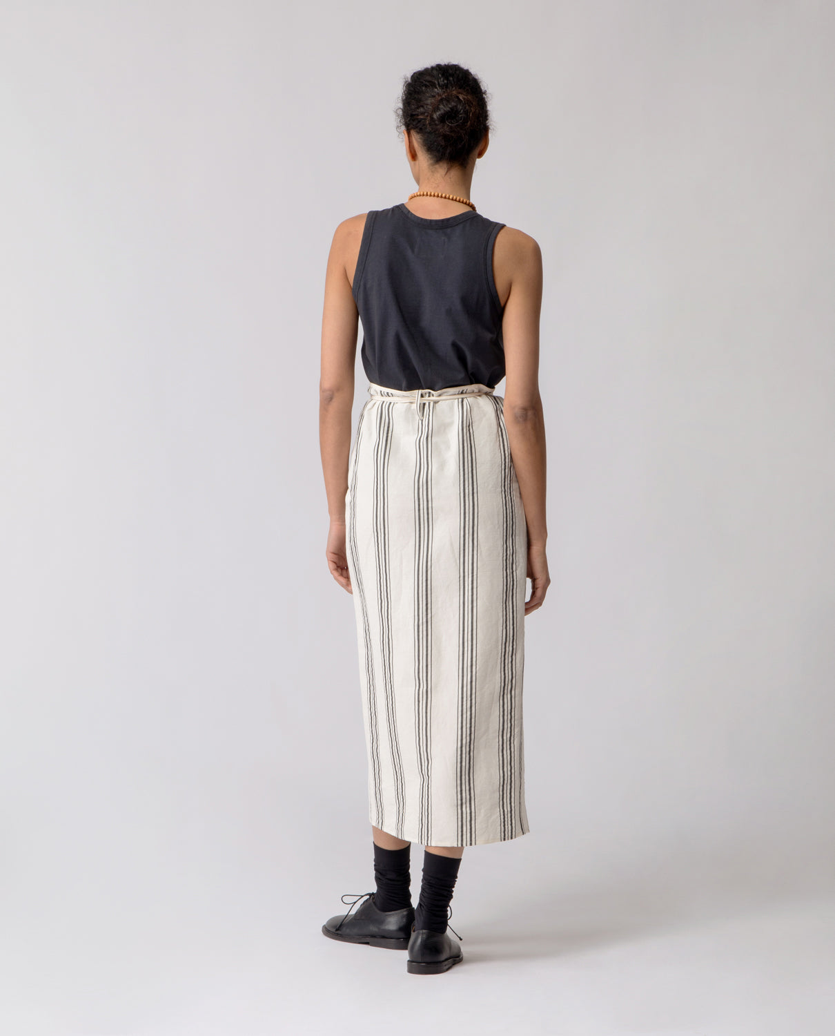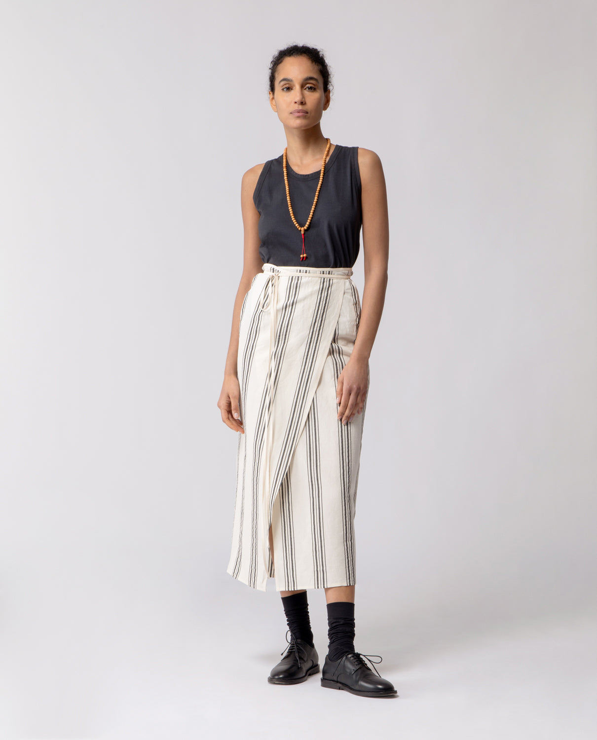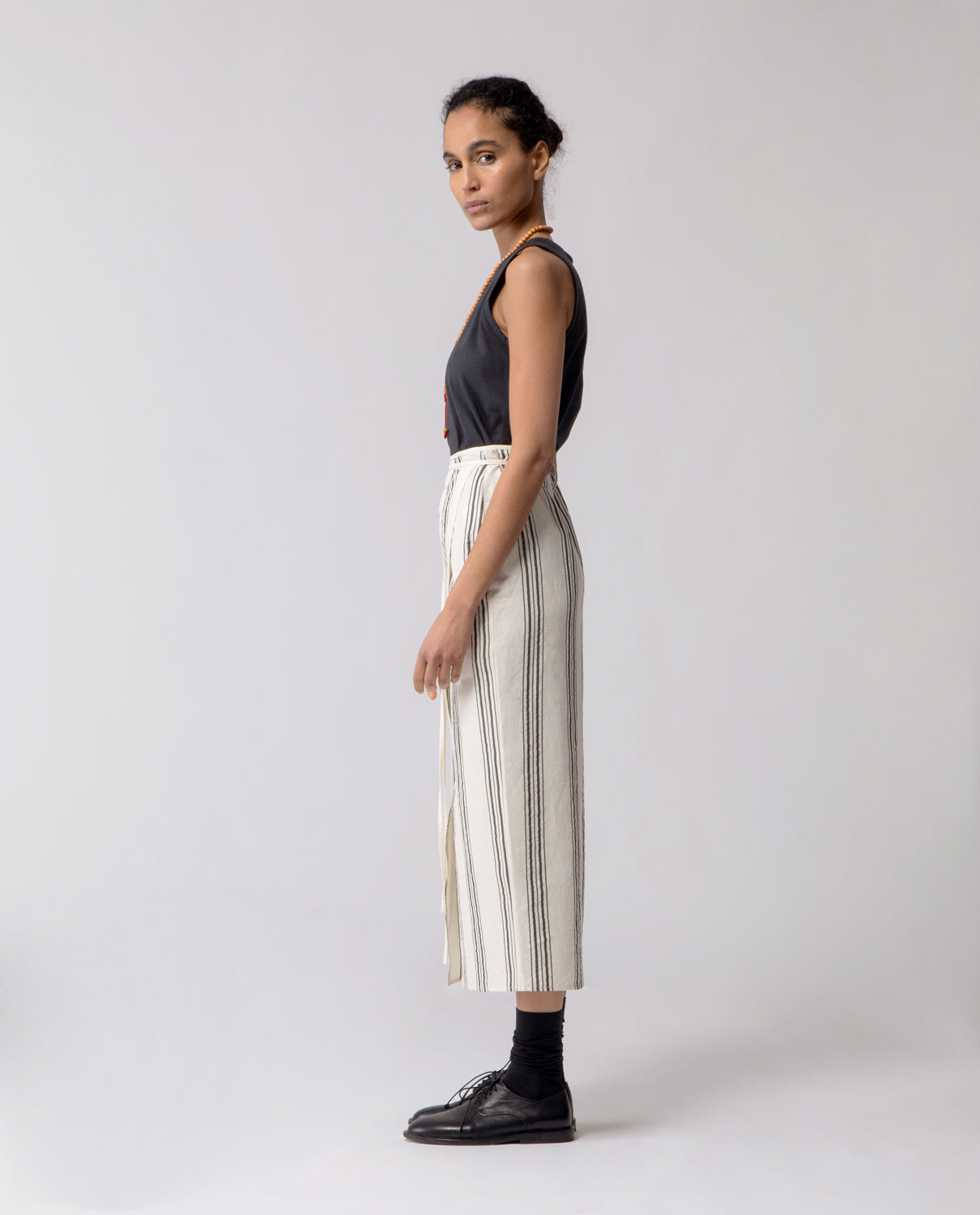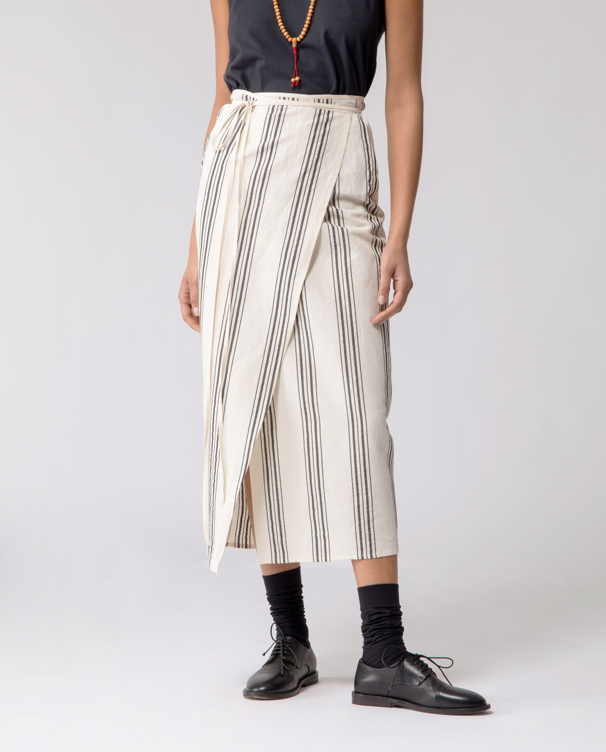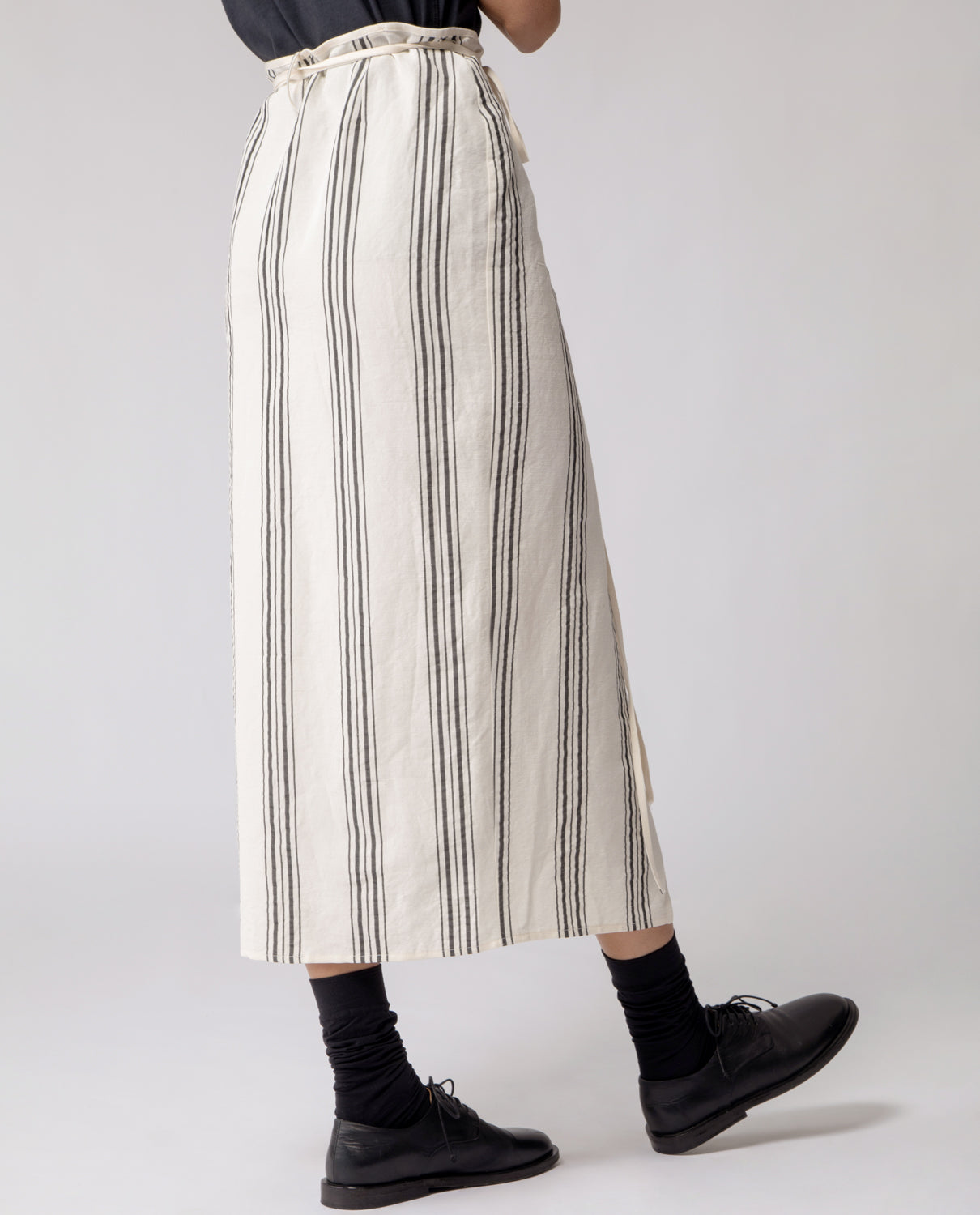 Wrap skirt with a slim, pencil silhouette, designed with a long tie fastening at the waist for an adjustable fit.