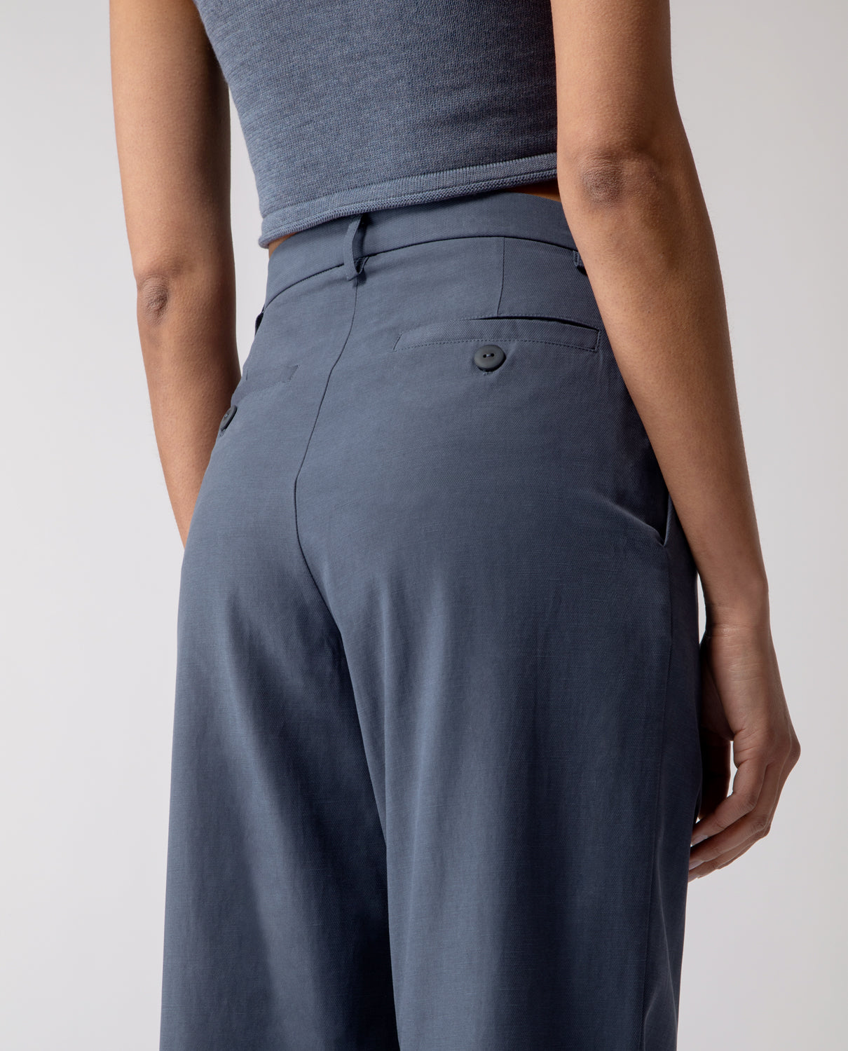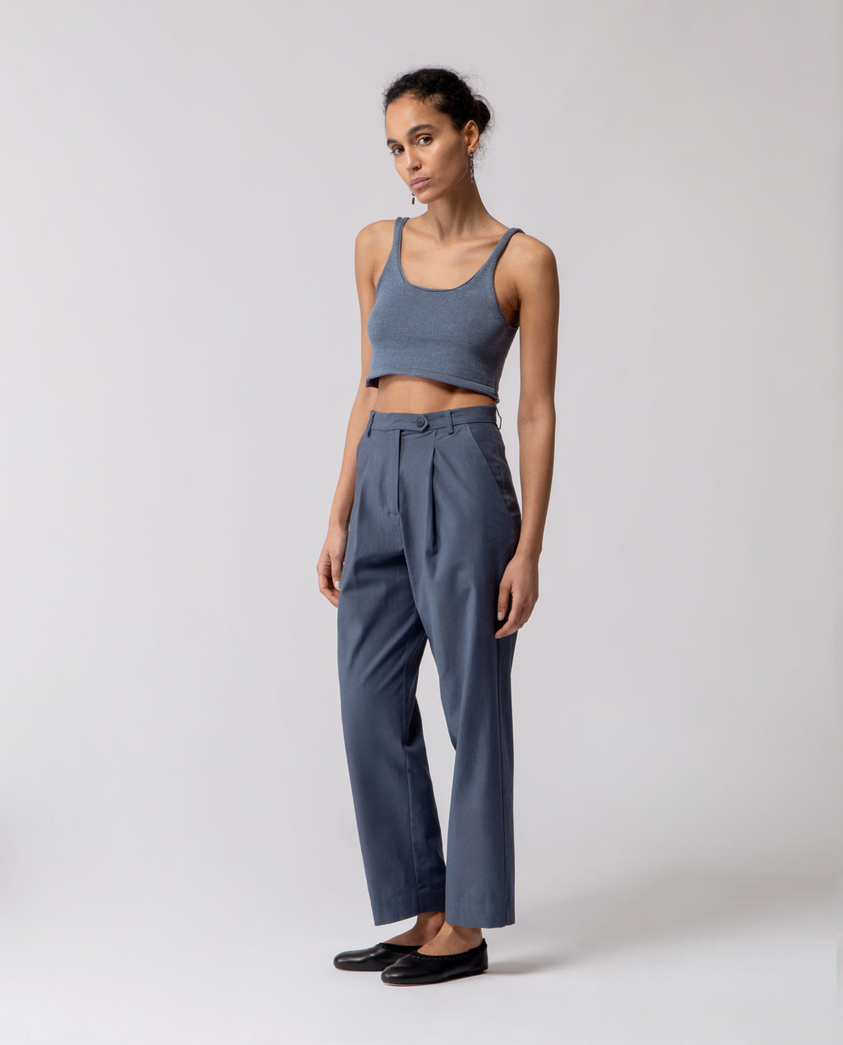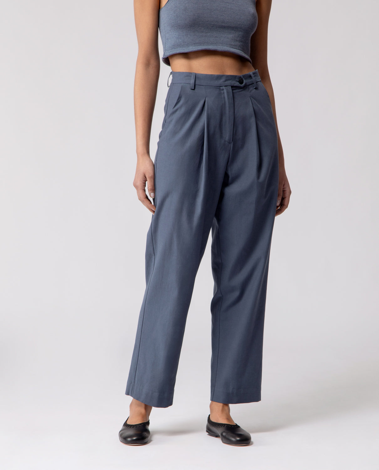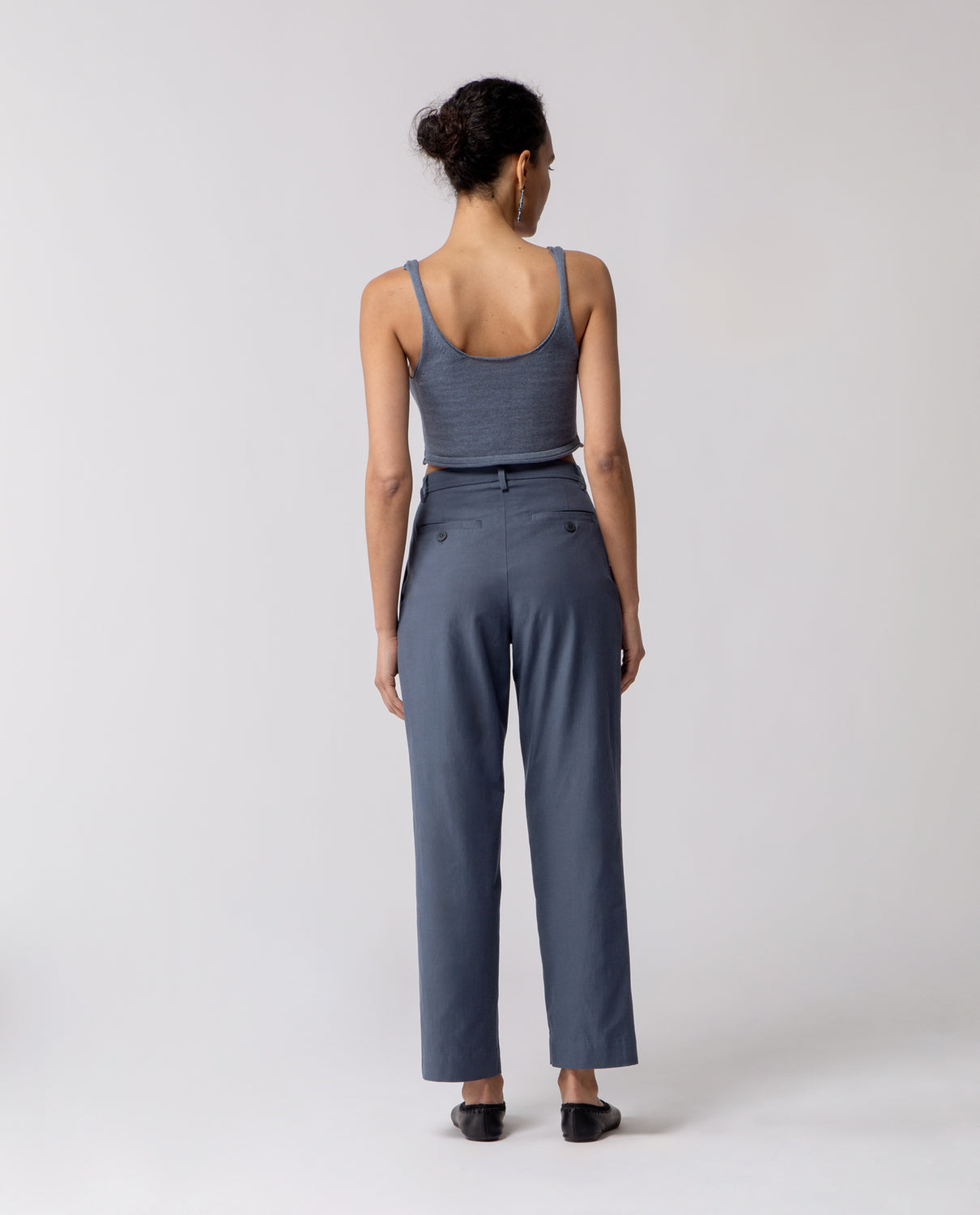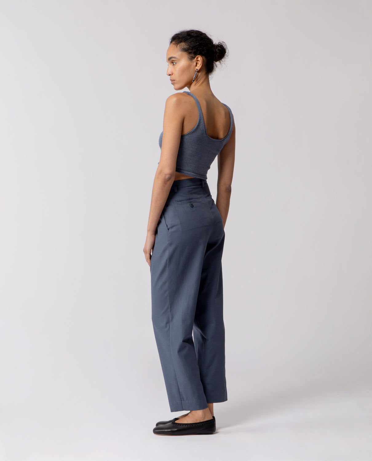 Cigarette trousers featuring an overlapped fly and clean welt pockets. Crease panels extend from the waistband, subtly defining and elongating the natural line of the leg.