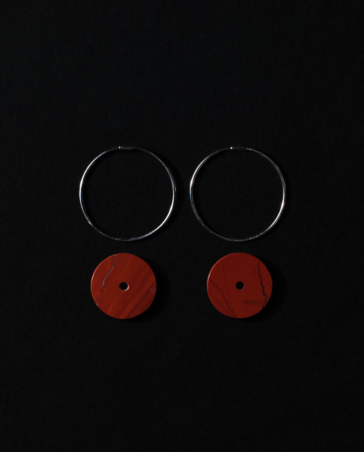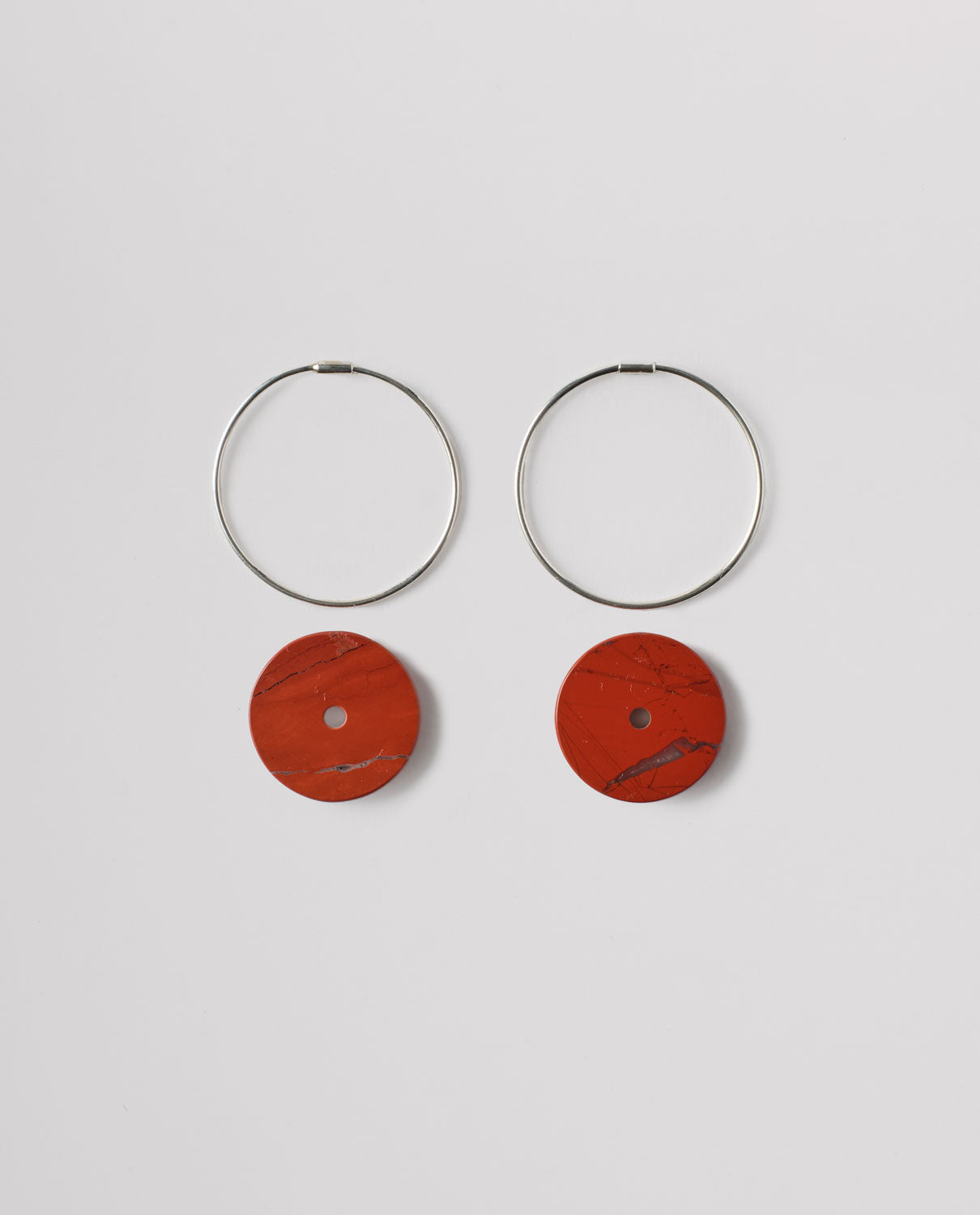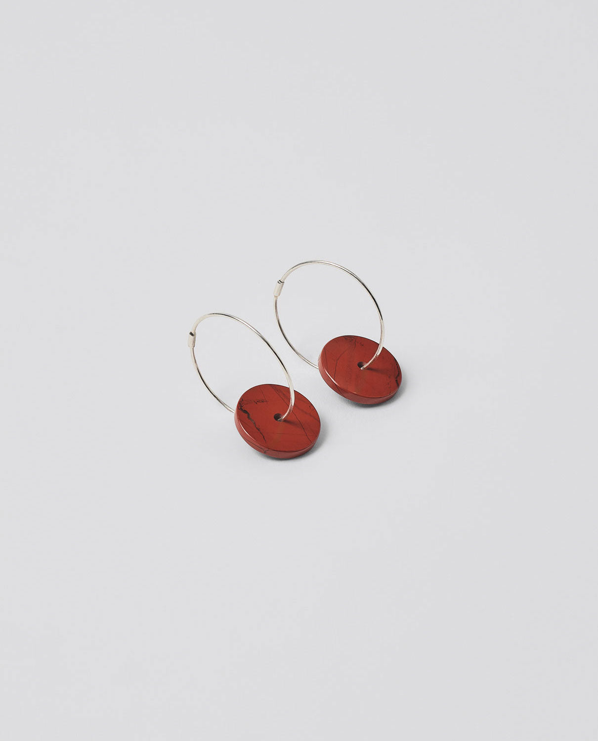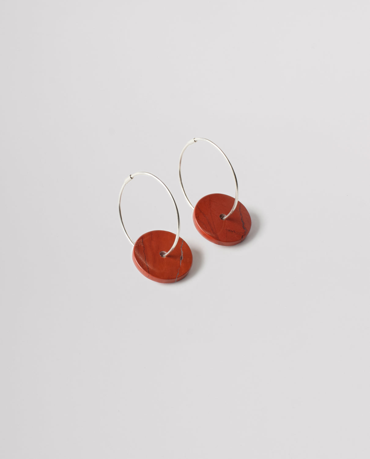 Sterling silver hoops with hand-carved disc pendants in red jasper.