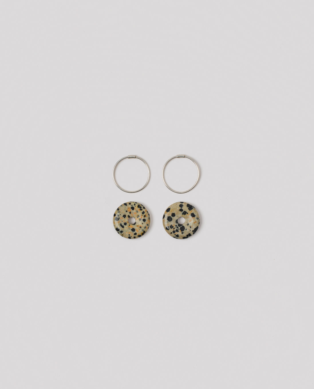 Sterling silver hoops with hand-carved disc pendants in dalmatian jasper.
