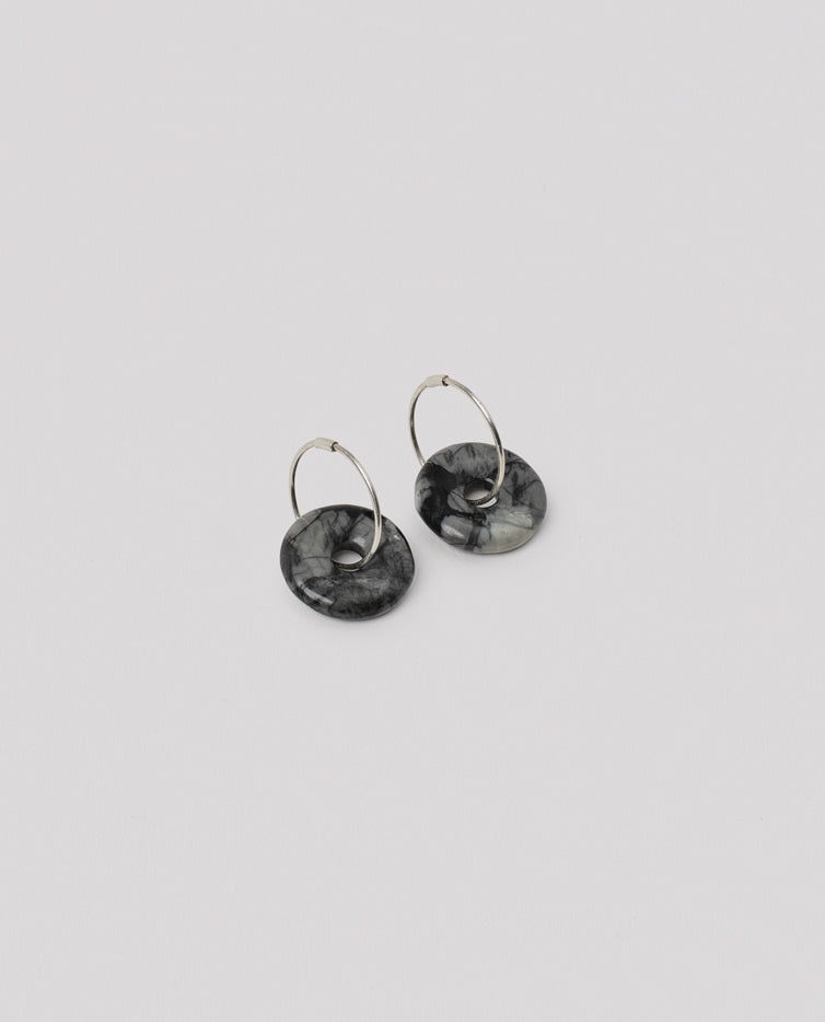 Sterling silver hoops with hand-carved disc pendants in picasso jasper.