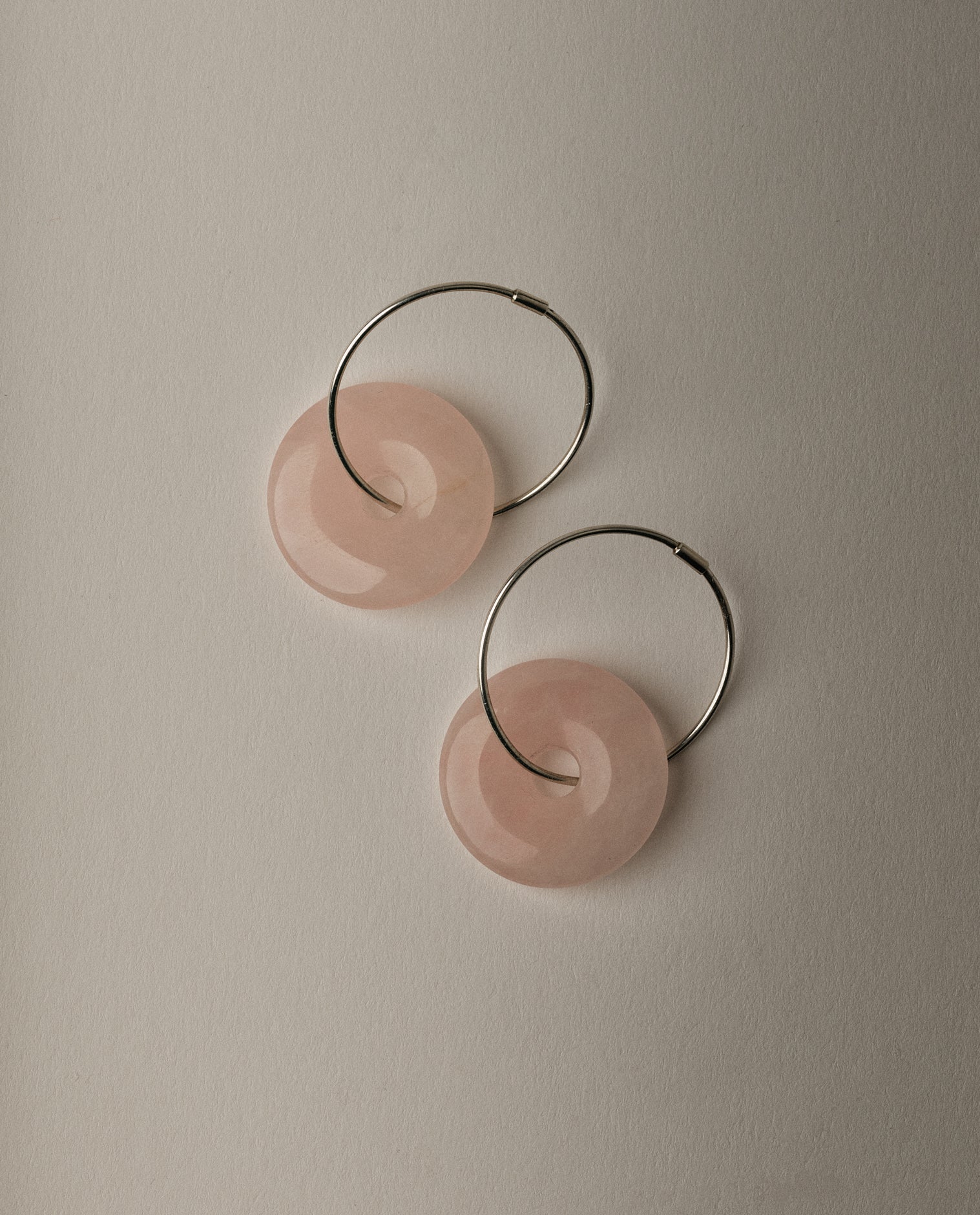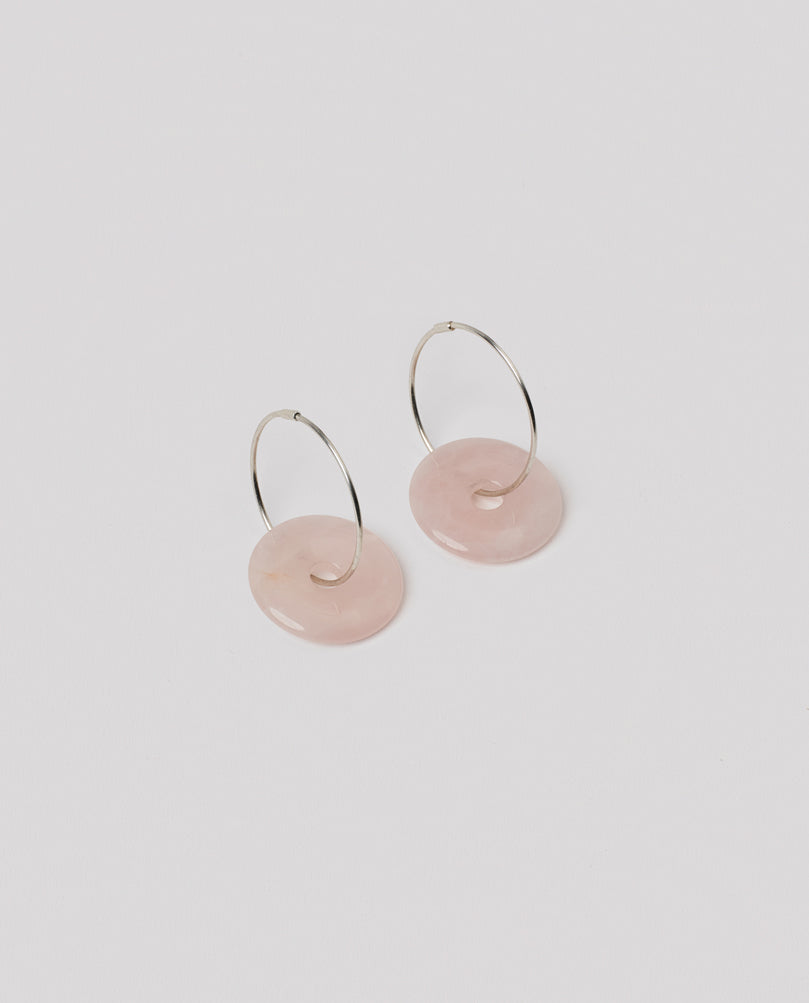 Sterling silver hoops with hand-carved disc pendants in rose quartz.