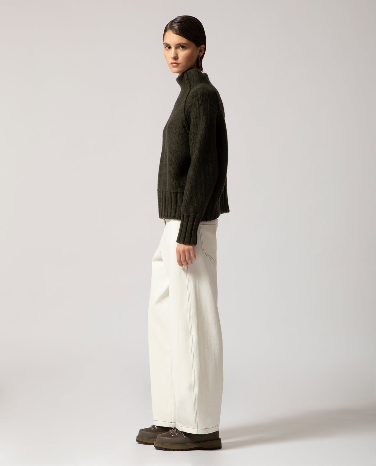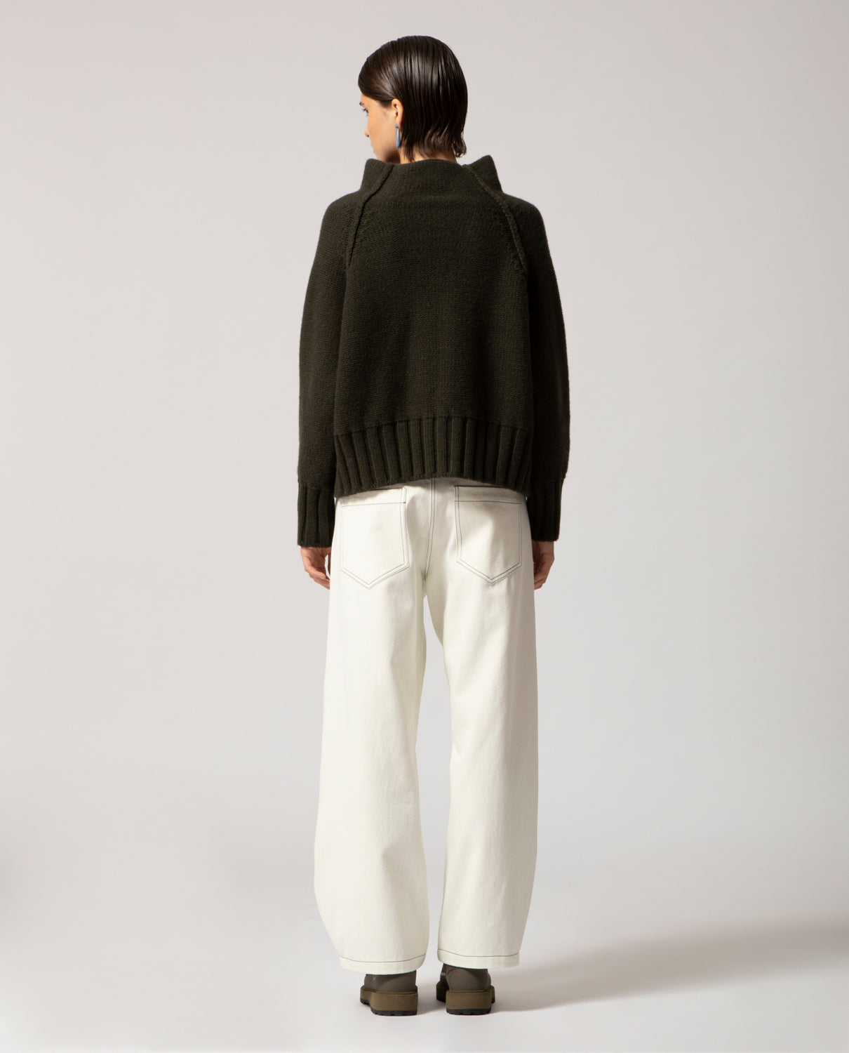 One-size, oversized sweater featuring a wide high neck, raglan sleeves, and raised seam details. Its heavy and structured knit gives it a bold, architectural presence while remaining comfortable in wear.