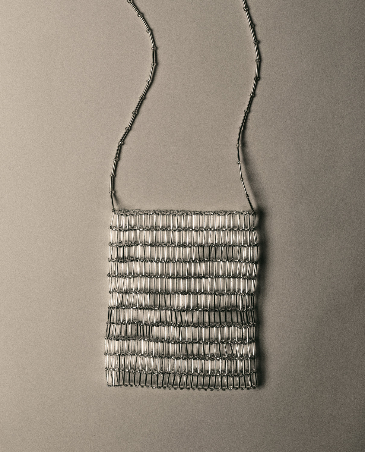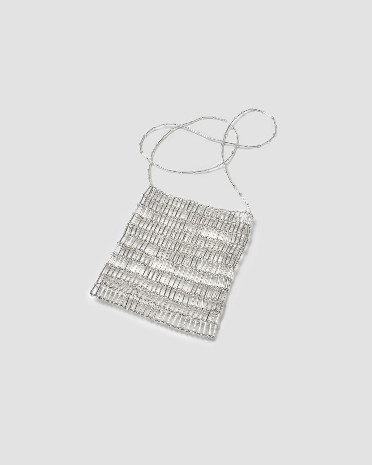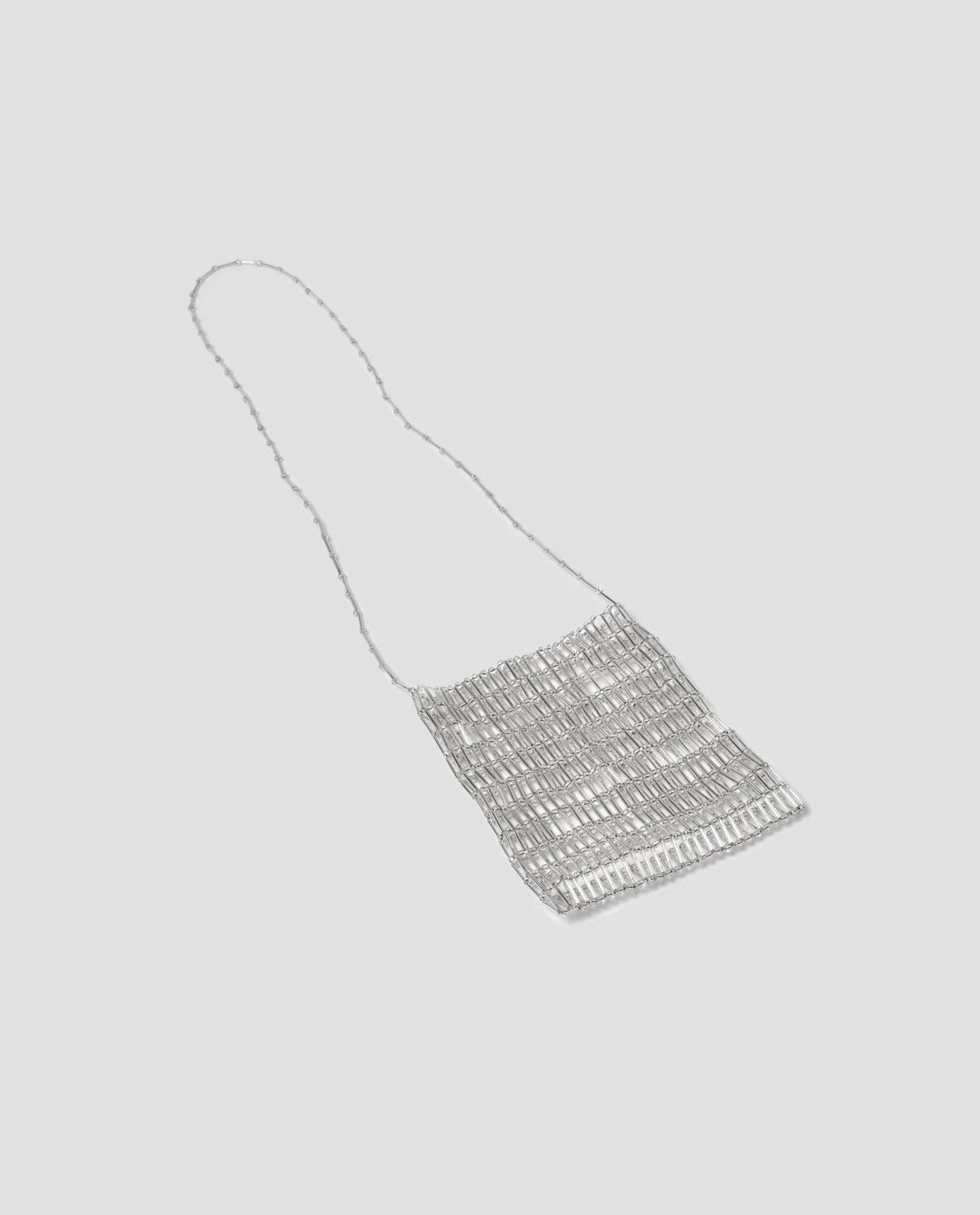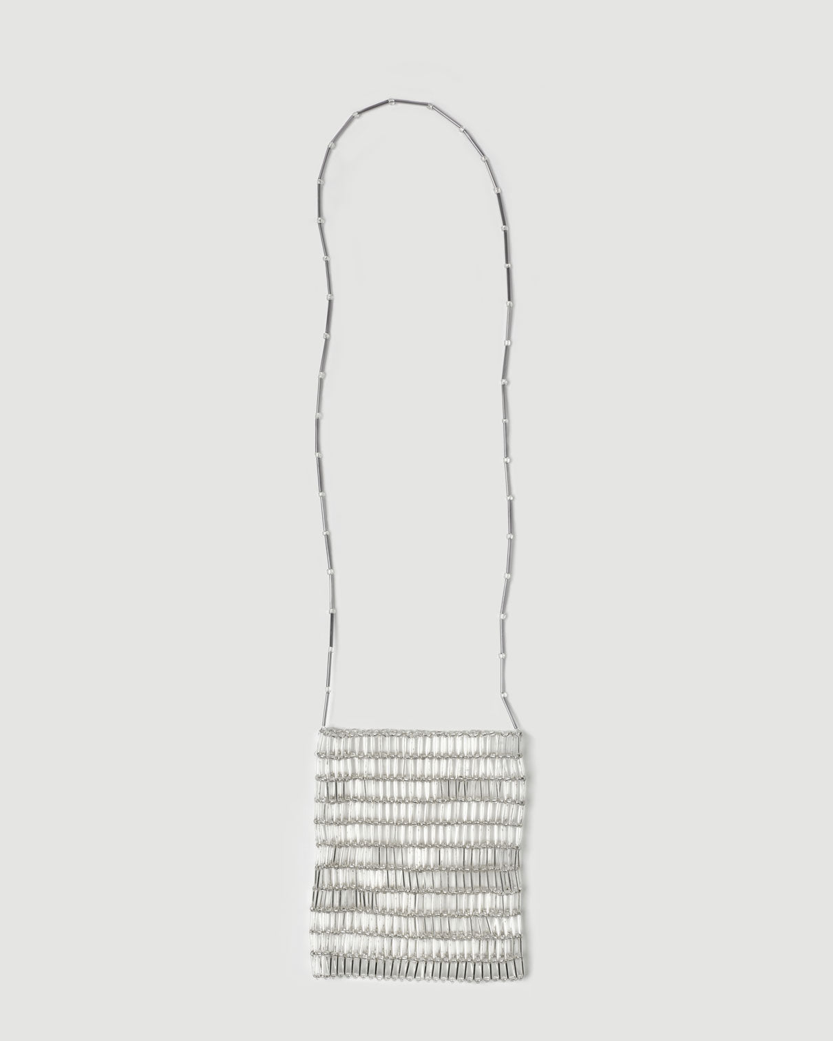 Jewel bag crafted by our skilled local artisans. It features tubular and spherical glass beads threaded onto metal wires.