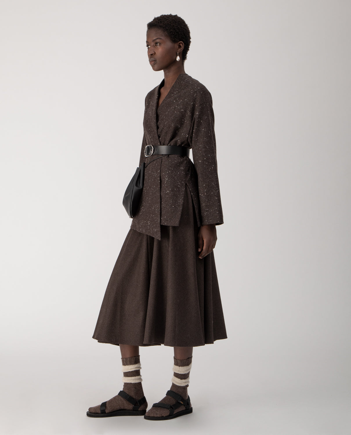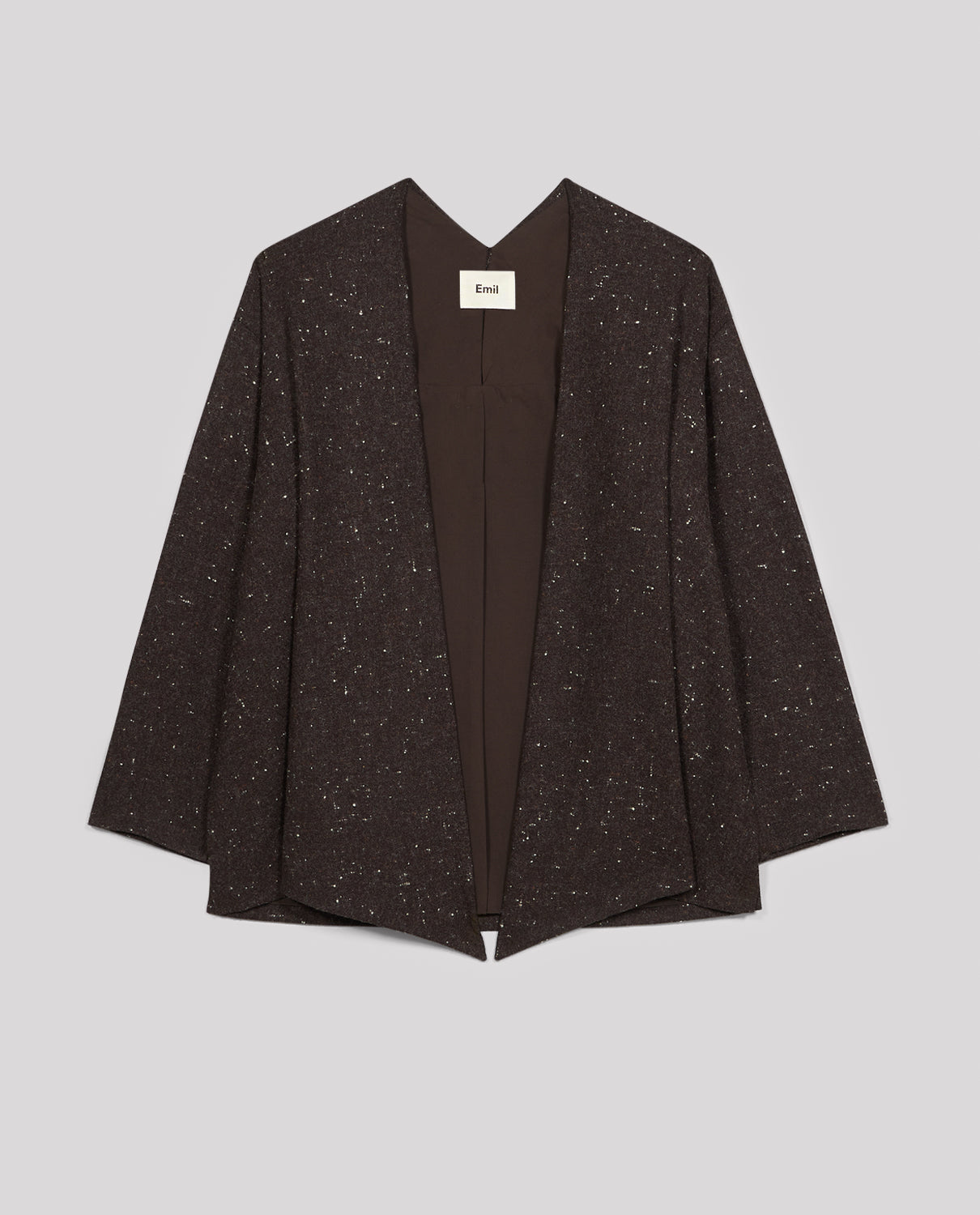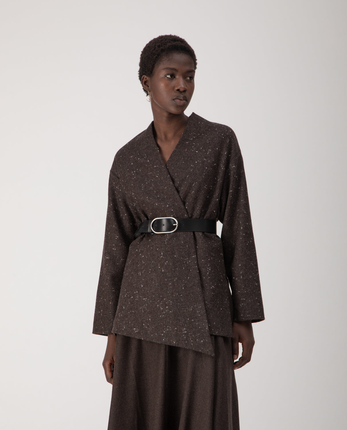 Open blazer with wrap-around fronts and wide sleeves. wear it open or with oval or everyday belt.