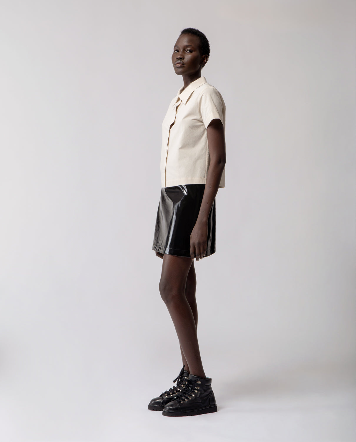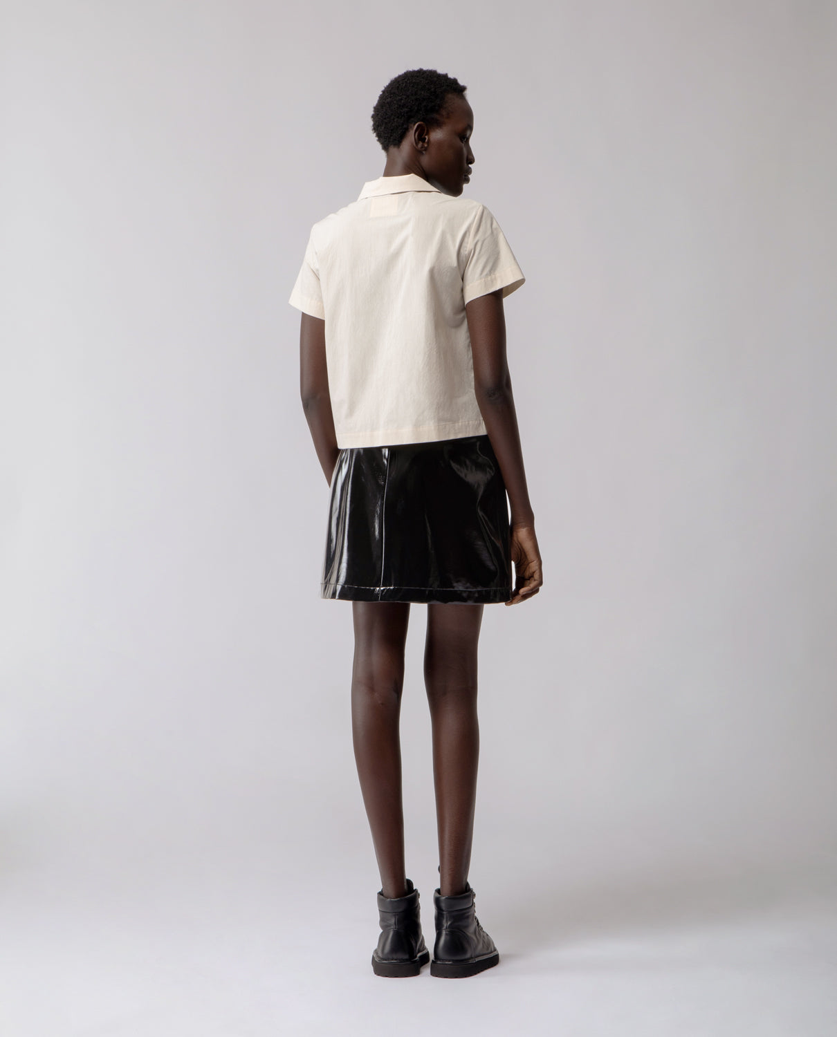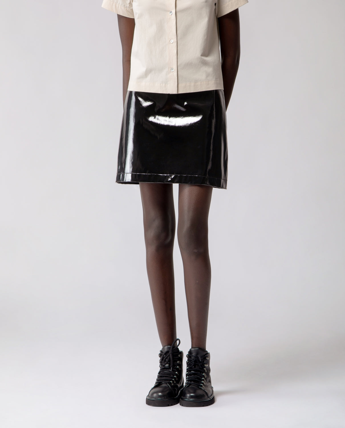 A short A-line skirt crafted in glossy cotton with a subtle lacquered effect, offering a structured yet fluid silhouette.