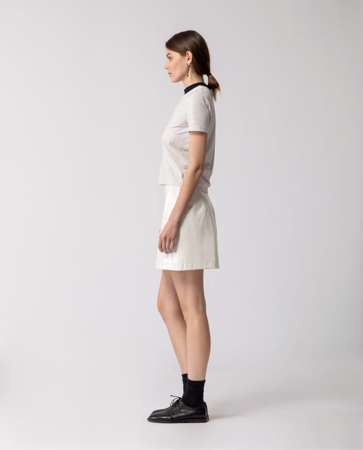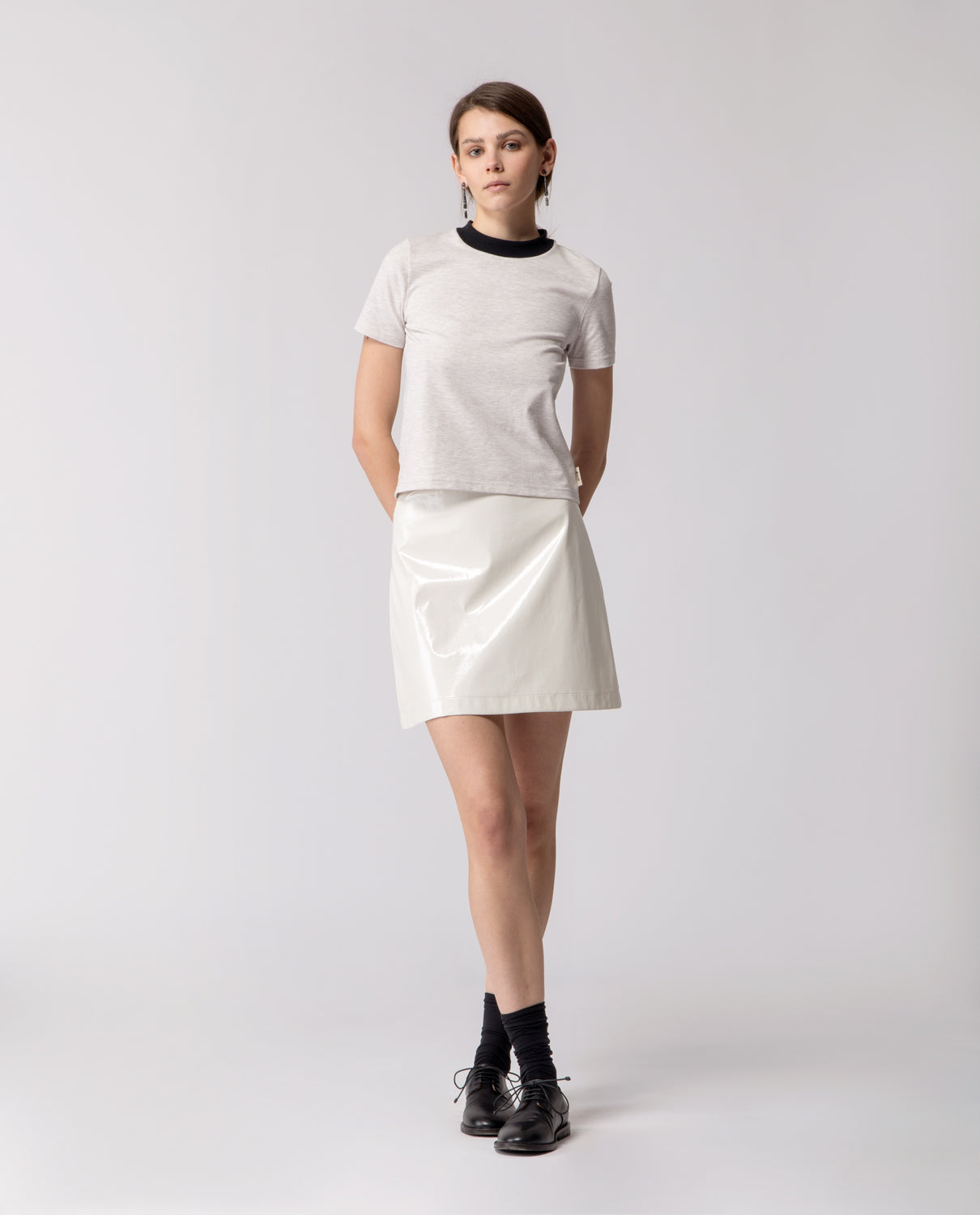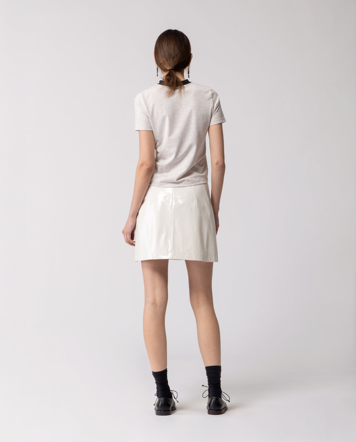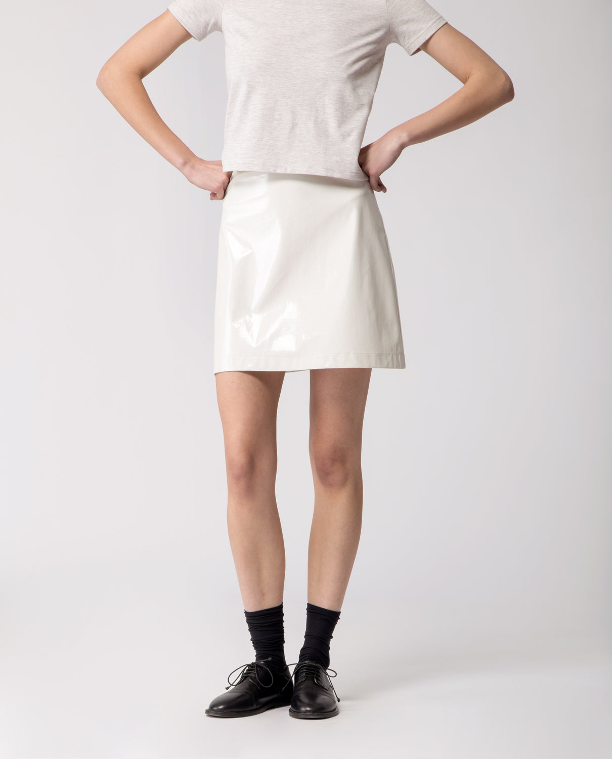 A short A-line skirt crafted in glossy cotton with a subtle lacquered effect, offering a structured yet fluid silhouette.