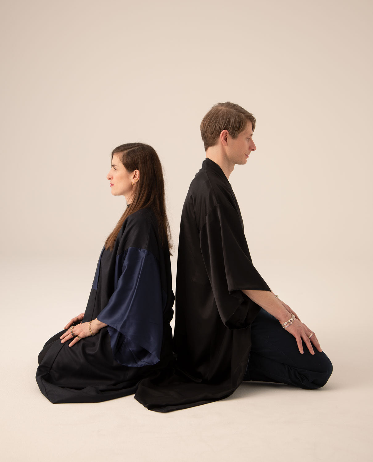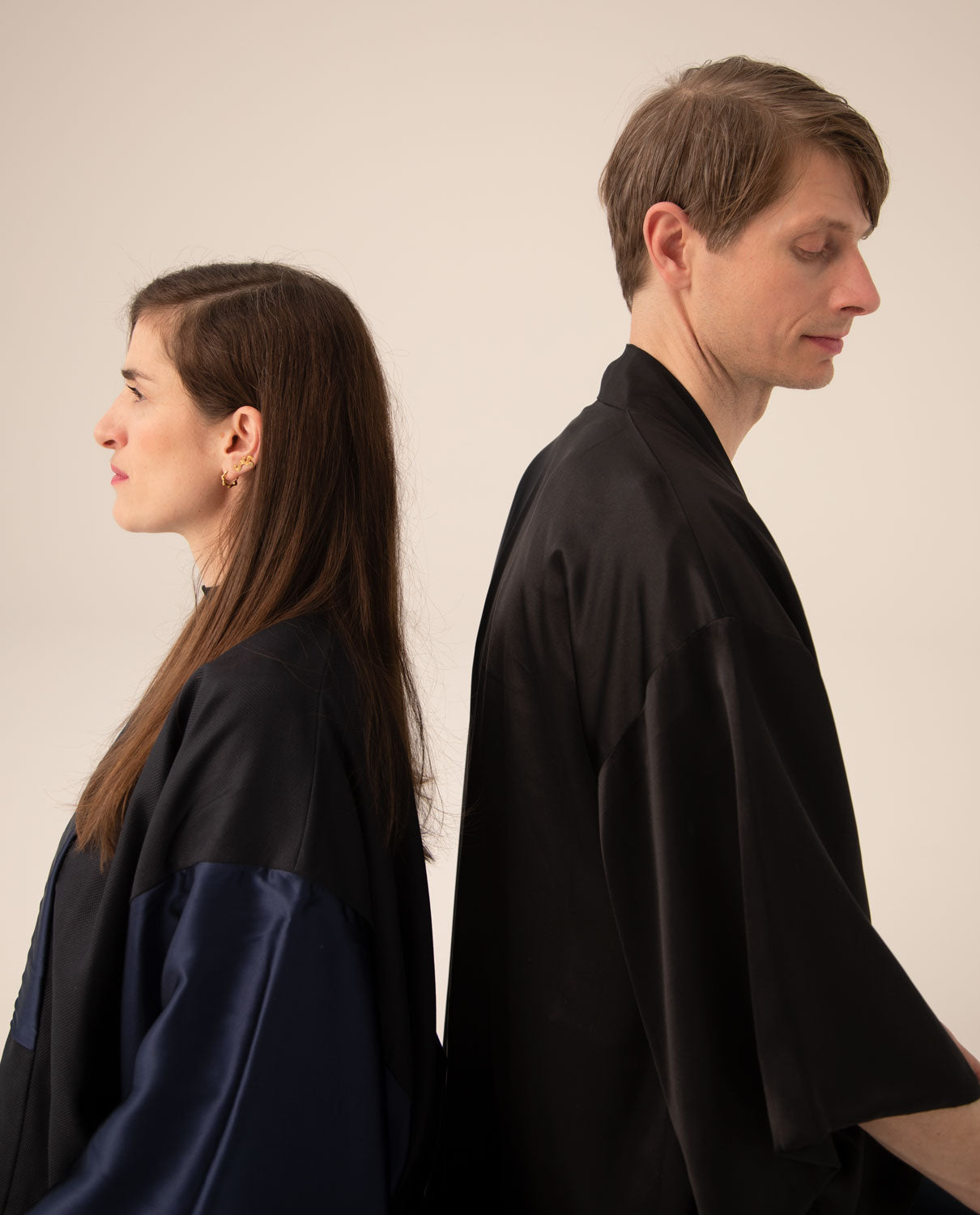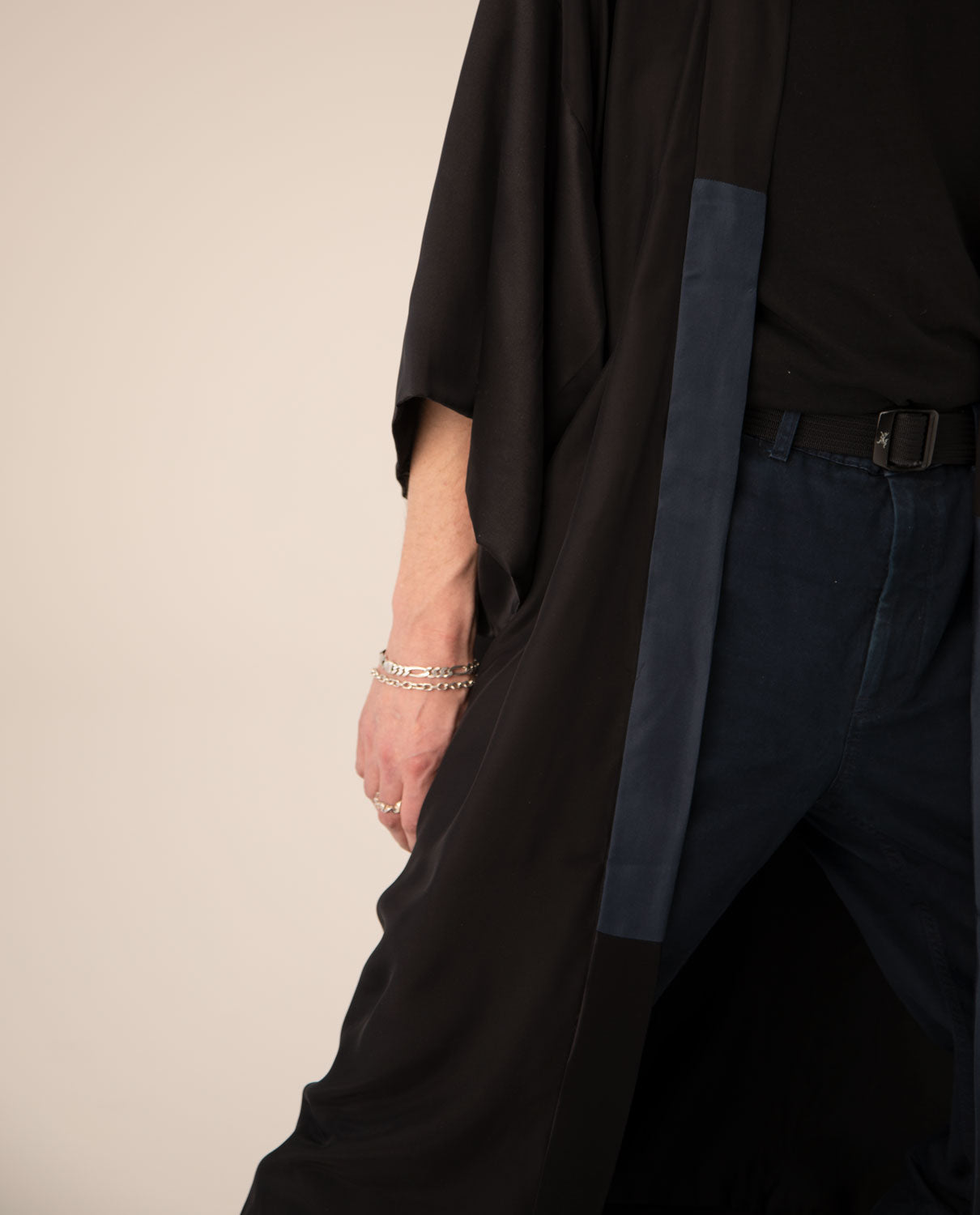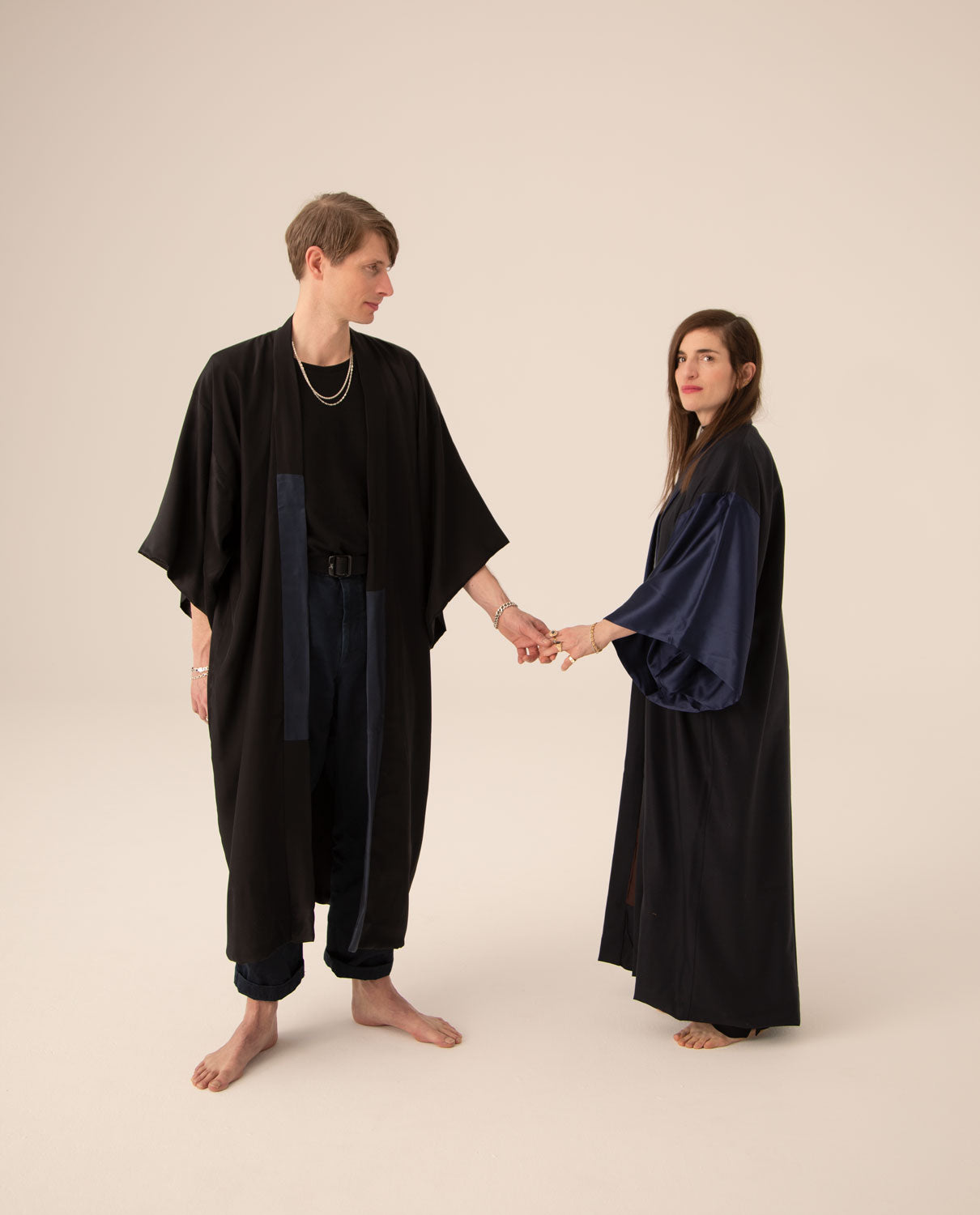 One-of-a-kind long robe from the sustainable collaborative collection conceived with fie paarup studio aimed to celebrate clothing and fabric reuse in conjunction with colour and texture relations. unique piece.