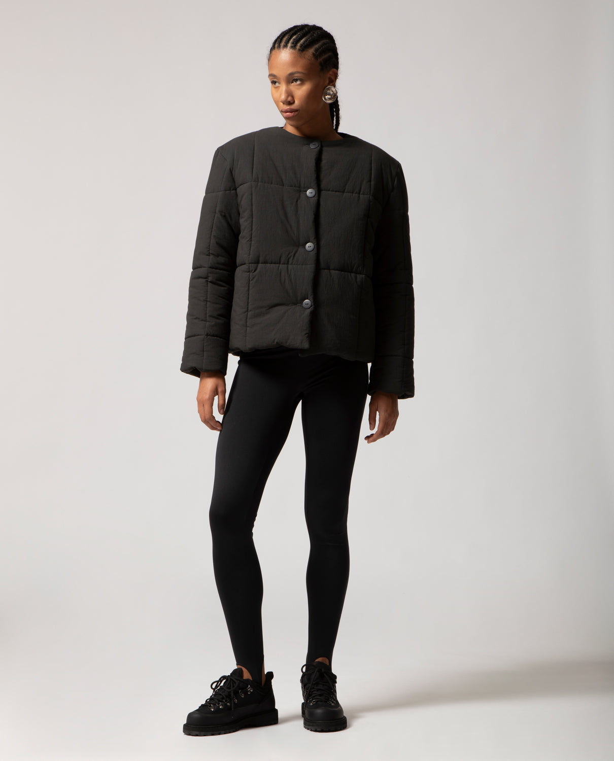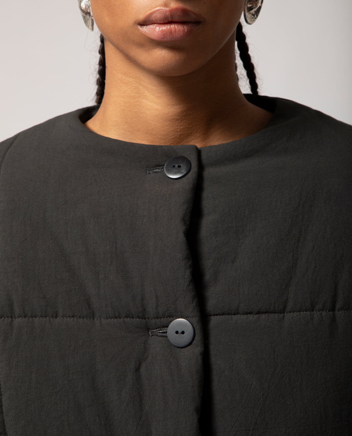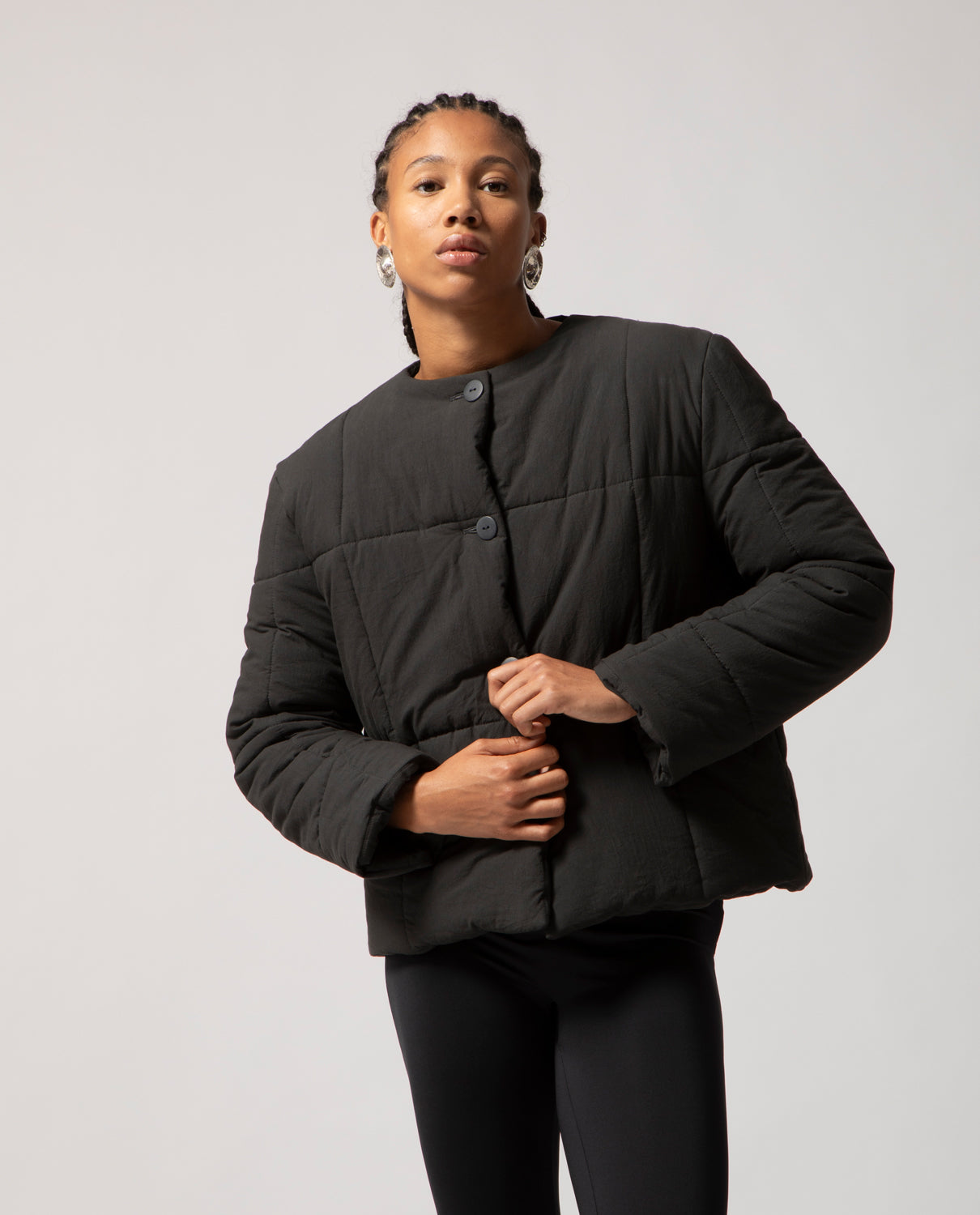 Padded box jacket with a clean, structured silhouette. This piece is detailed with front buttons and filled with soft, warm padding for comfort and ease on the coldest days.