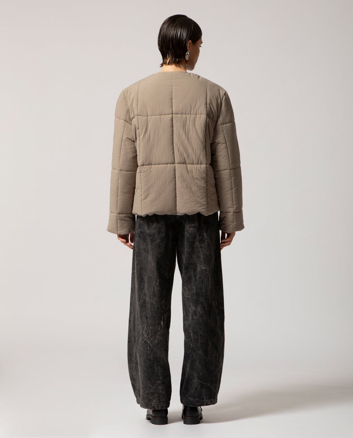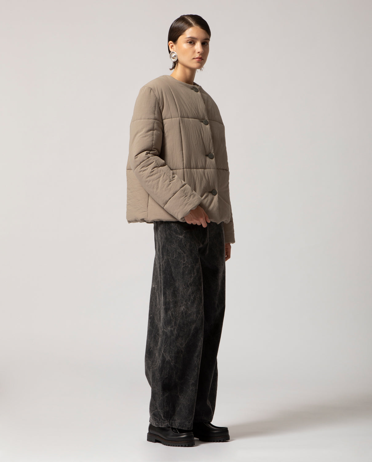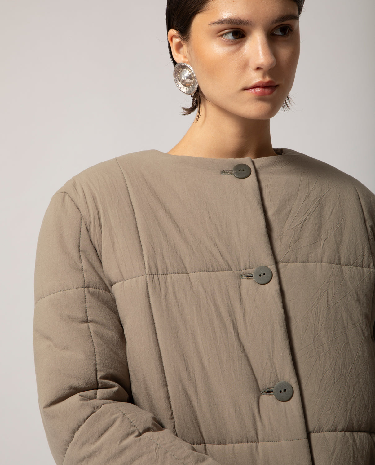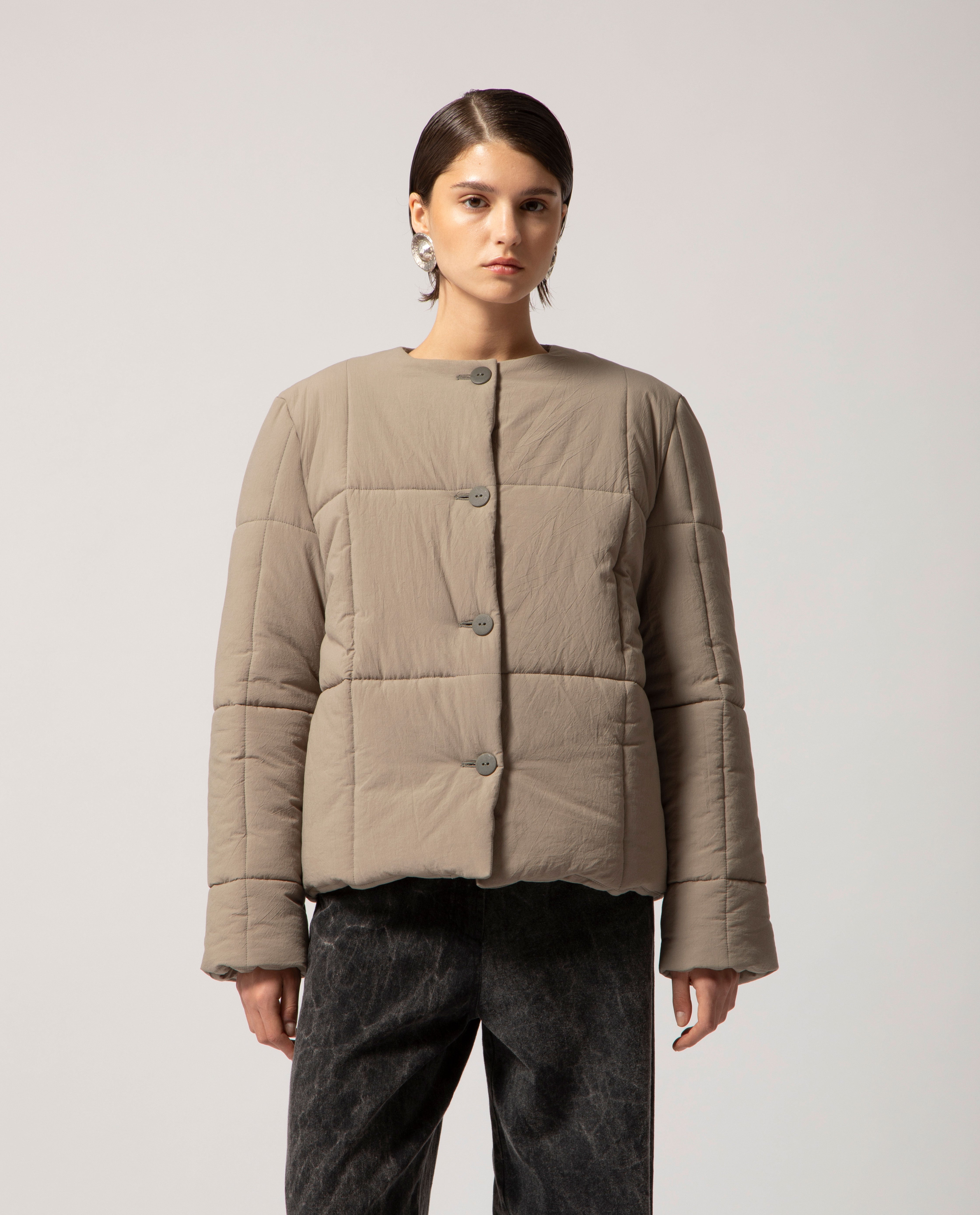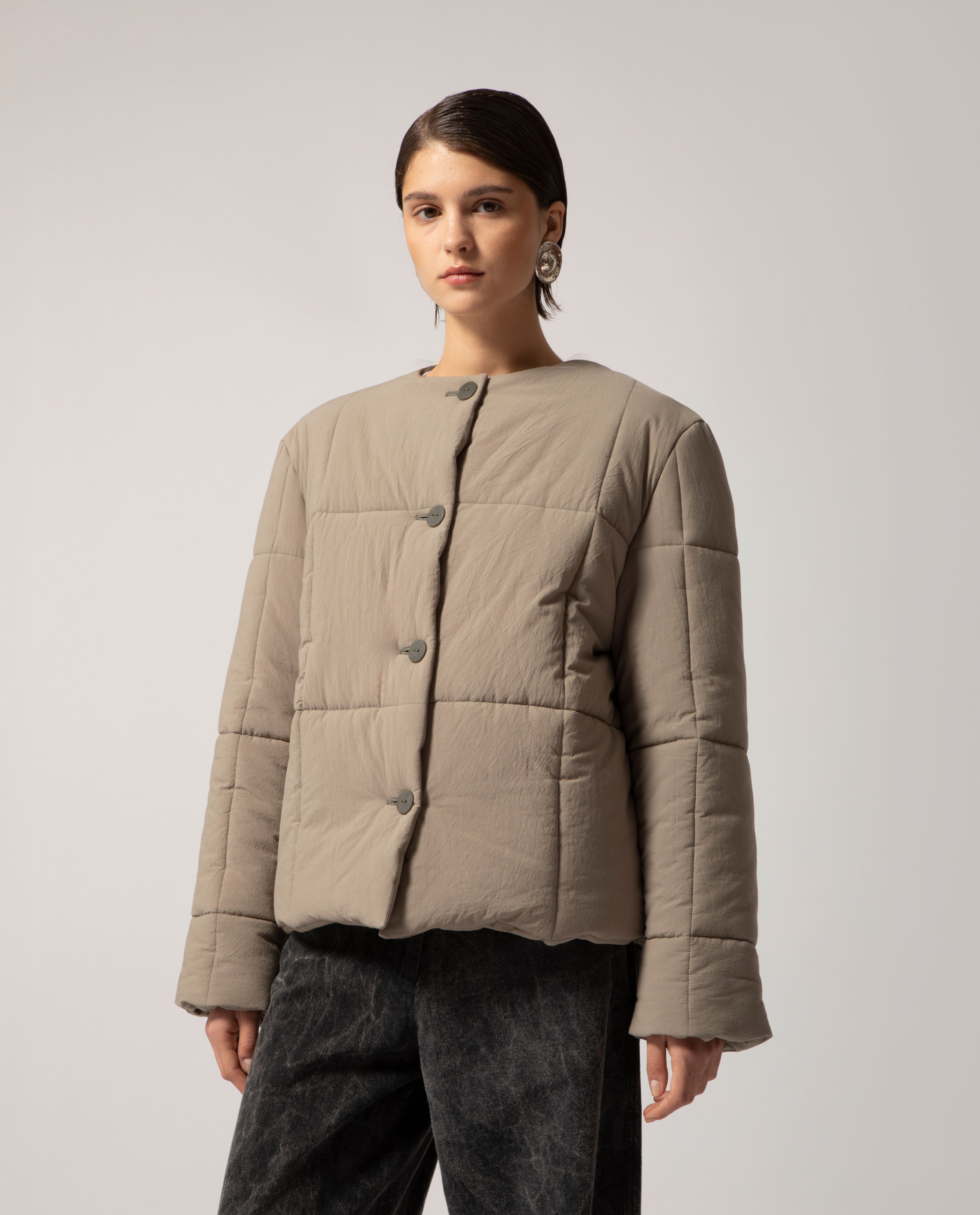 Padded box jacket with a clean, structured silhouette. This piece is detailed with front buttons and filled with soft, warm padding for comfort and ease on the coldest days.