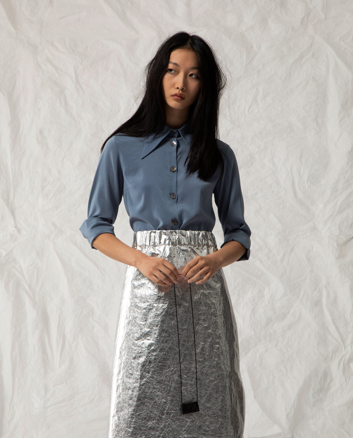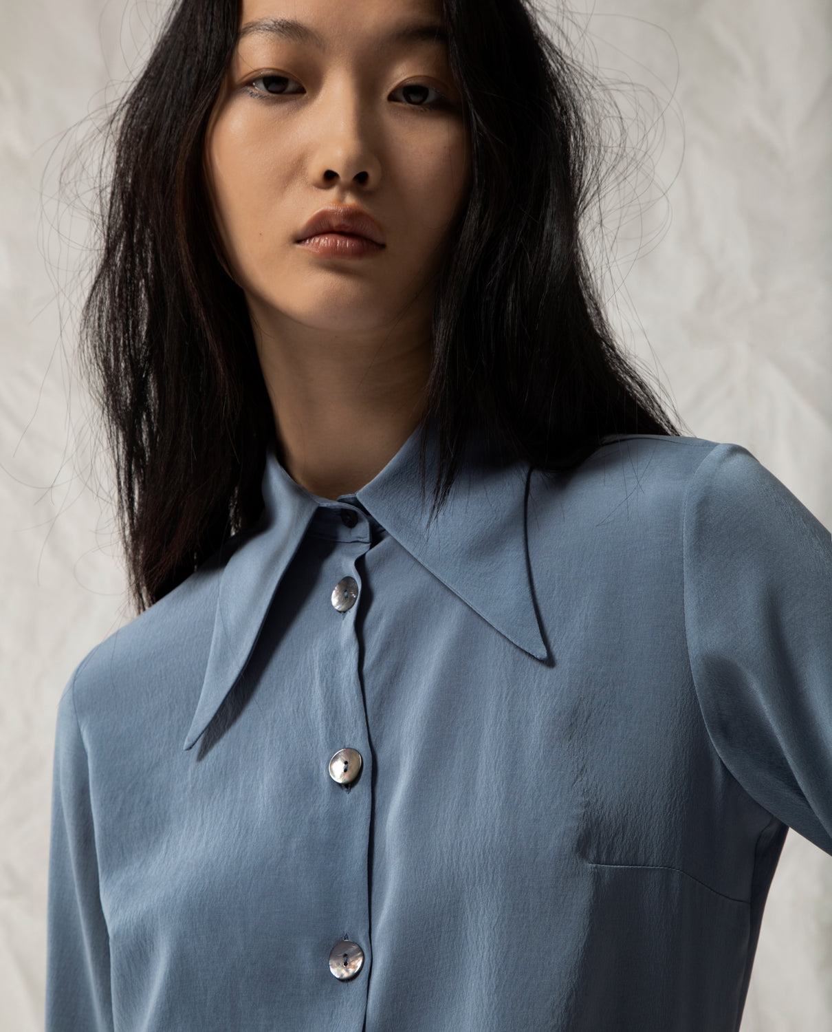 Fitted silk shirt with a wide and pointed collar and smoky nacre buttons on front and cuffs.