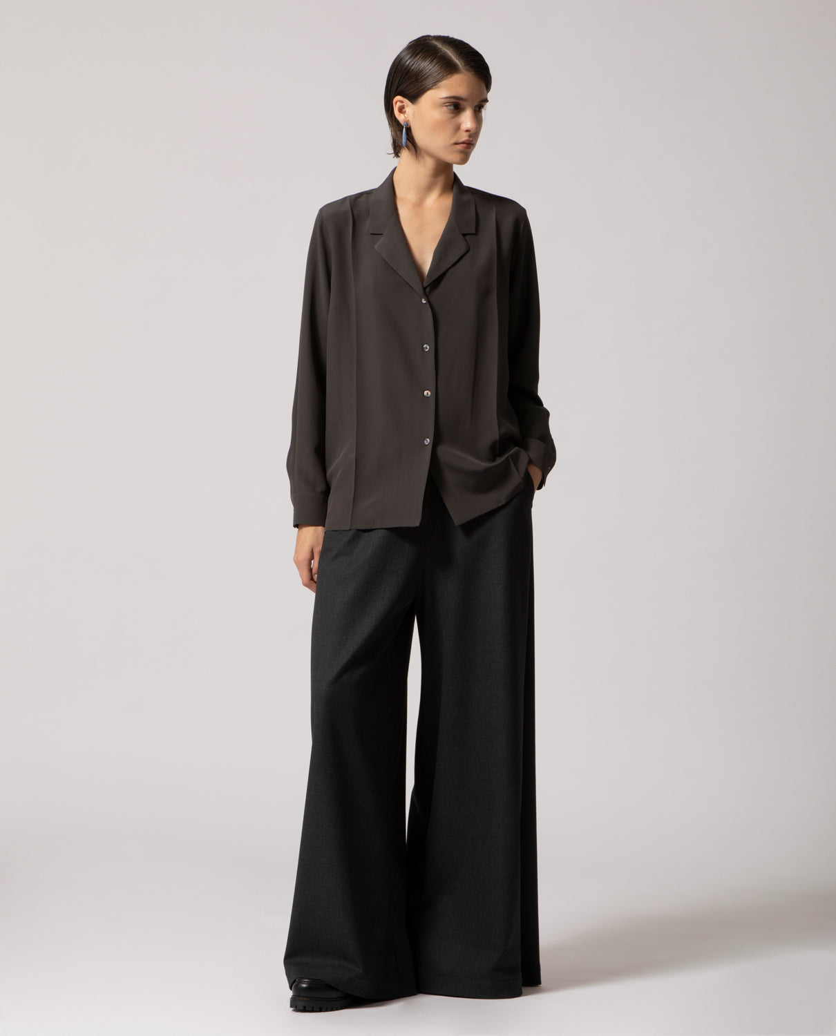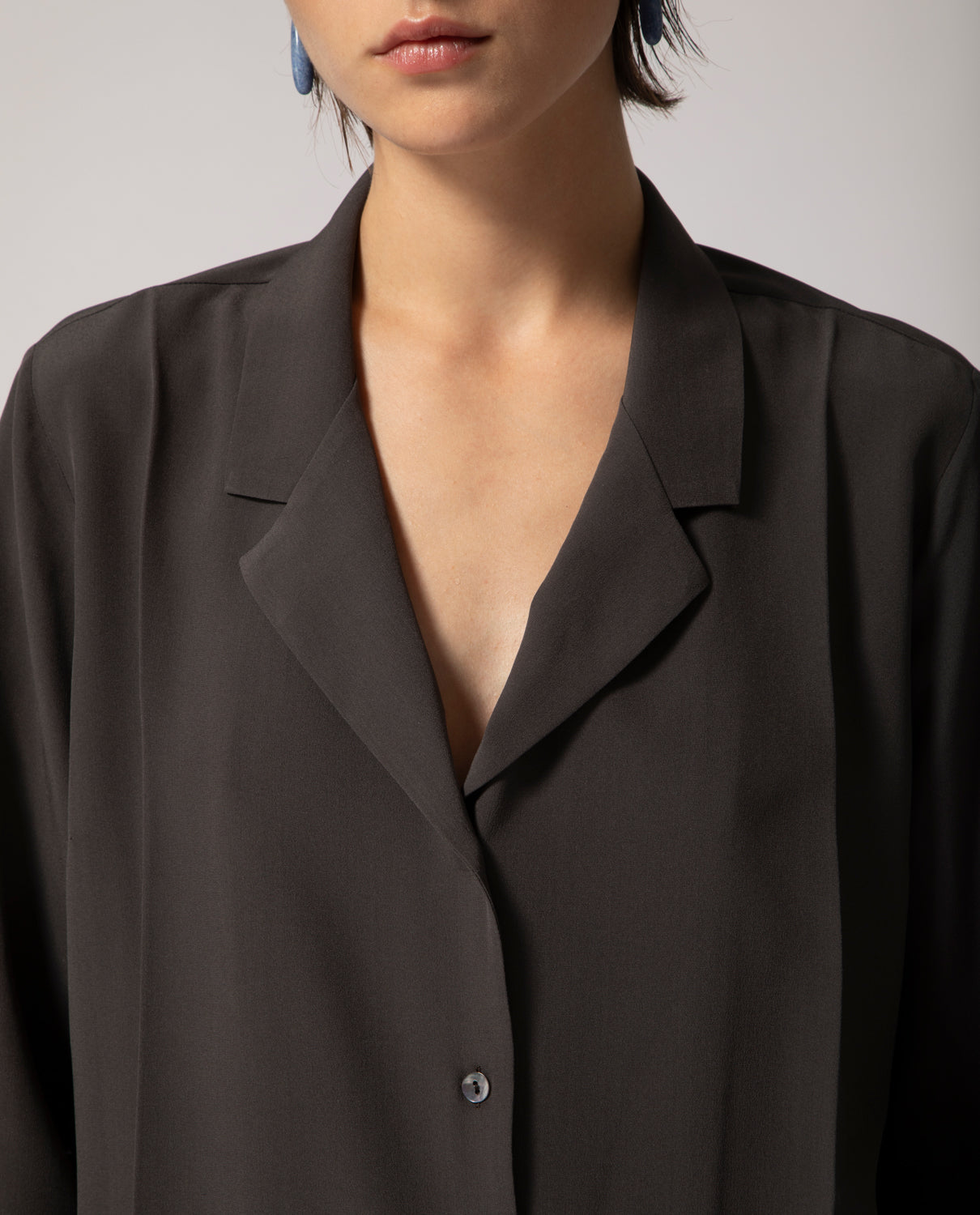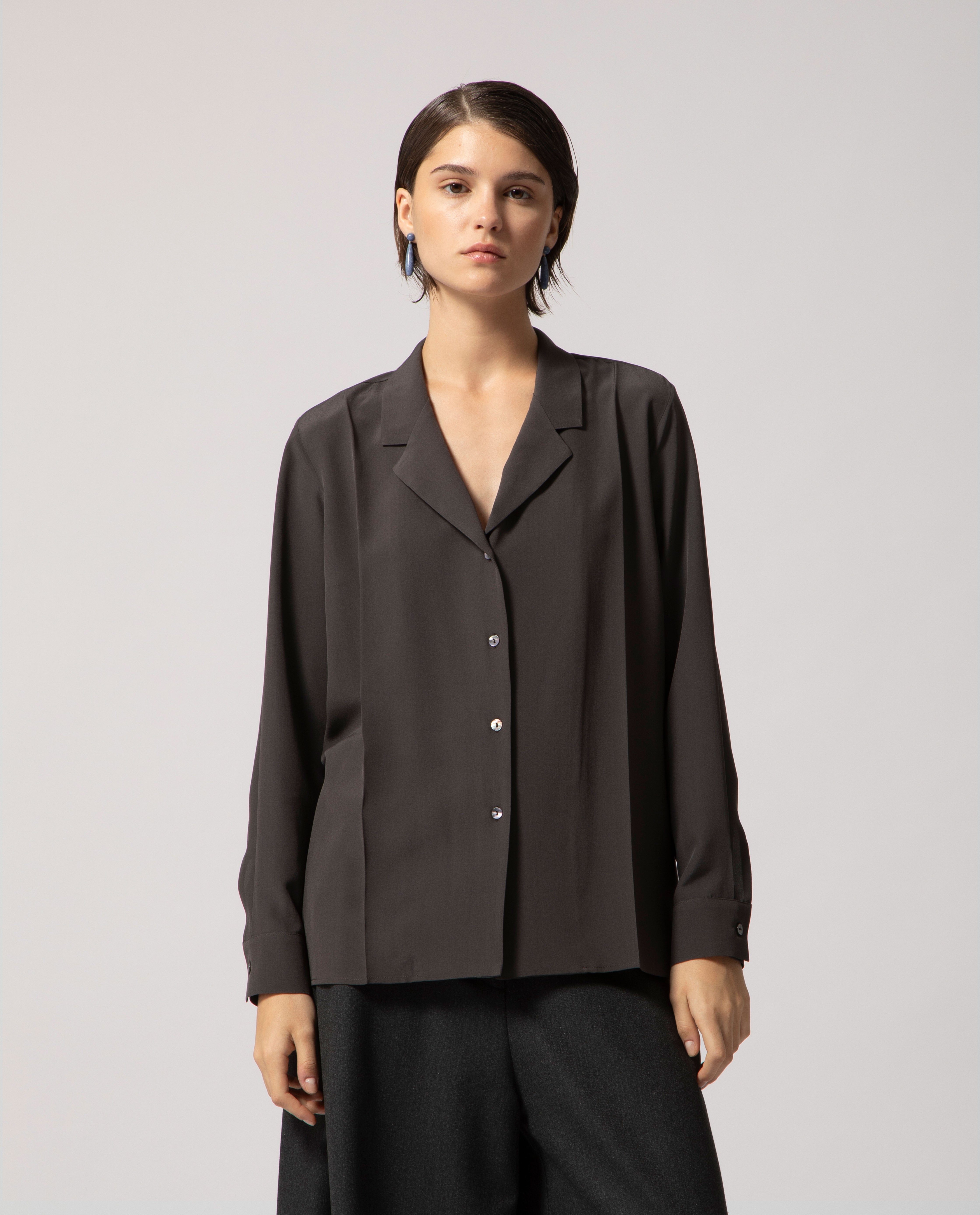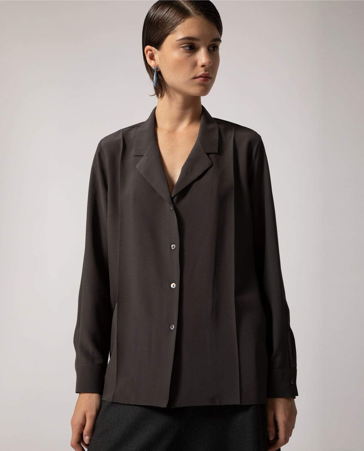 A soft shirt designed with a revere collar and finished with small mother-of-pearl buttons along the front placket and cuffs.