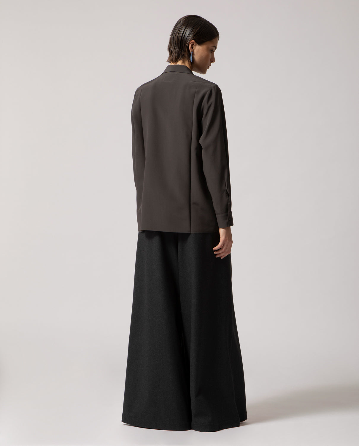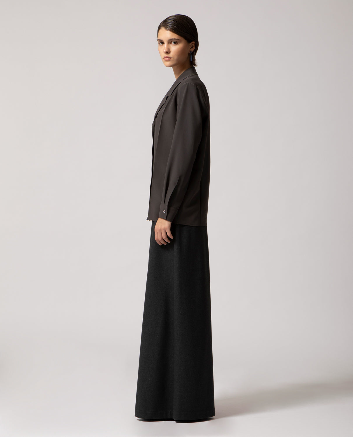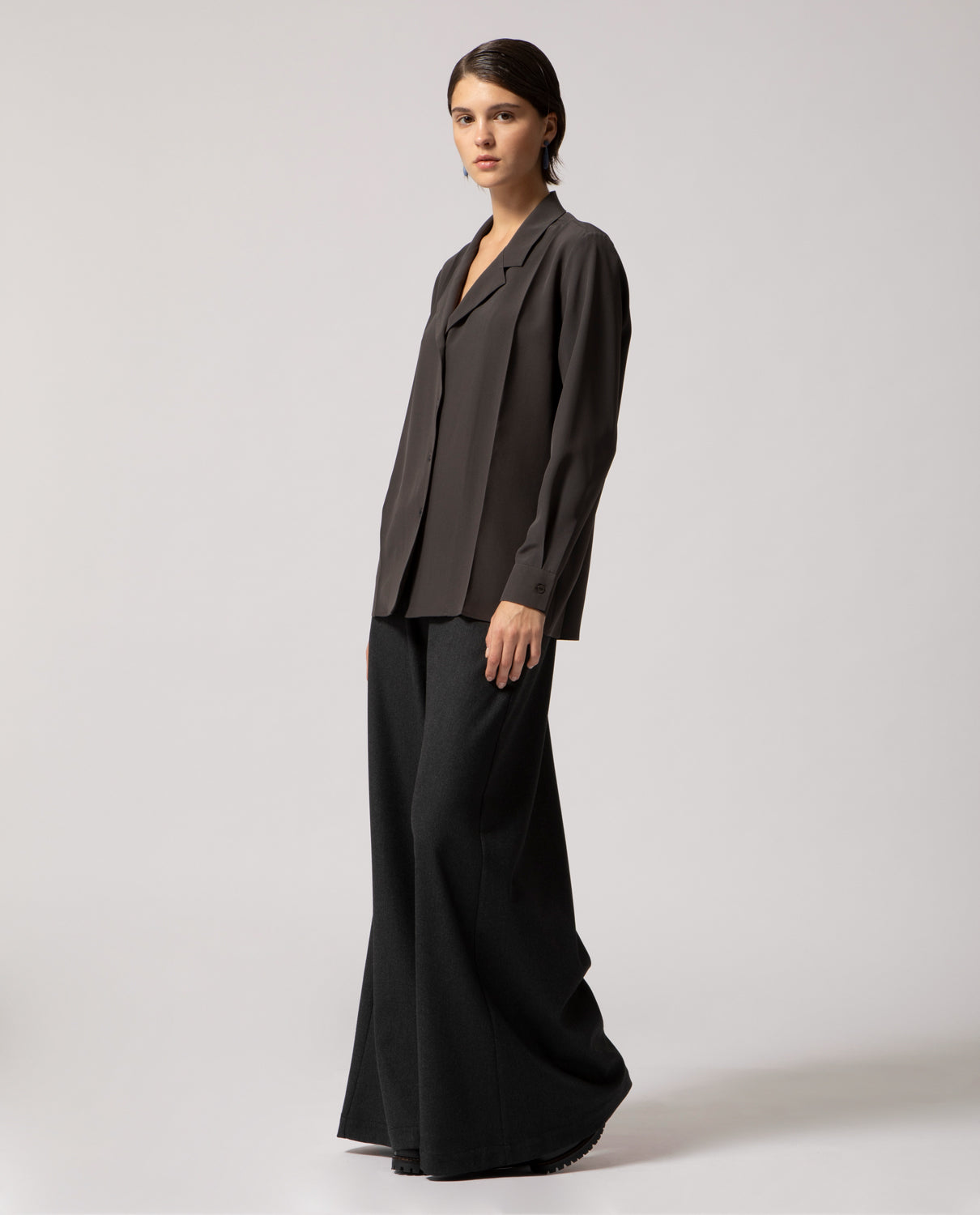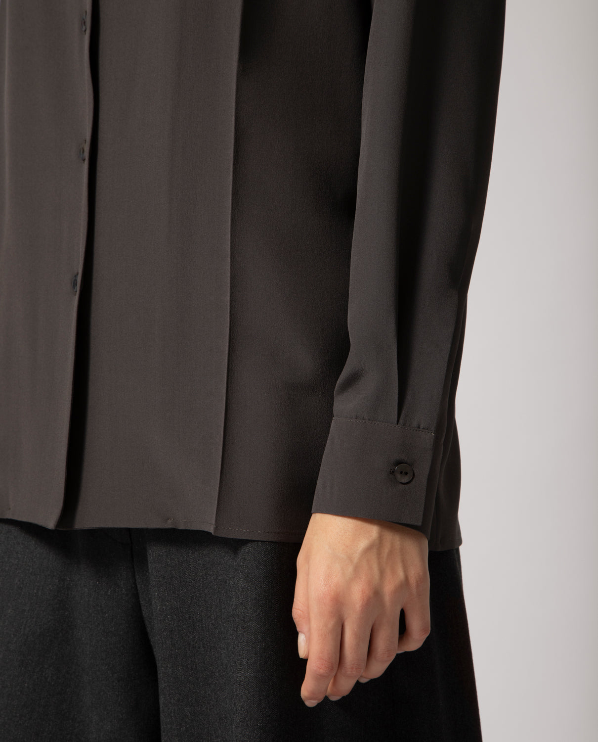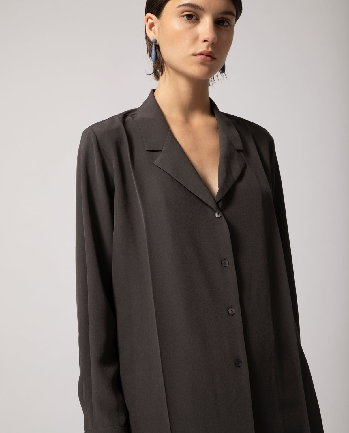 A soft shirt designed with a revere collar and finished with small mother-of-pearl buttons along the front placket and cuffs.