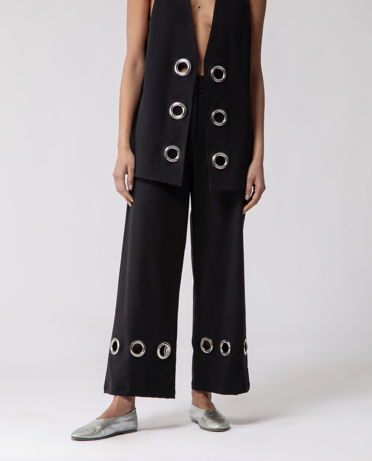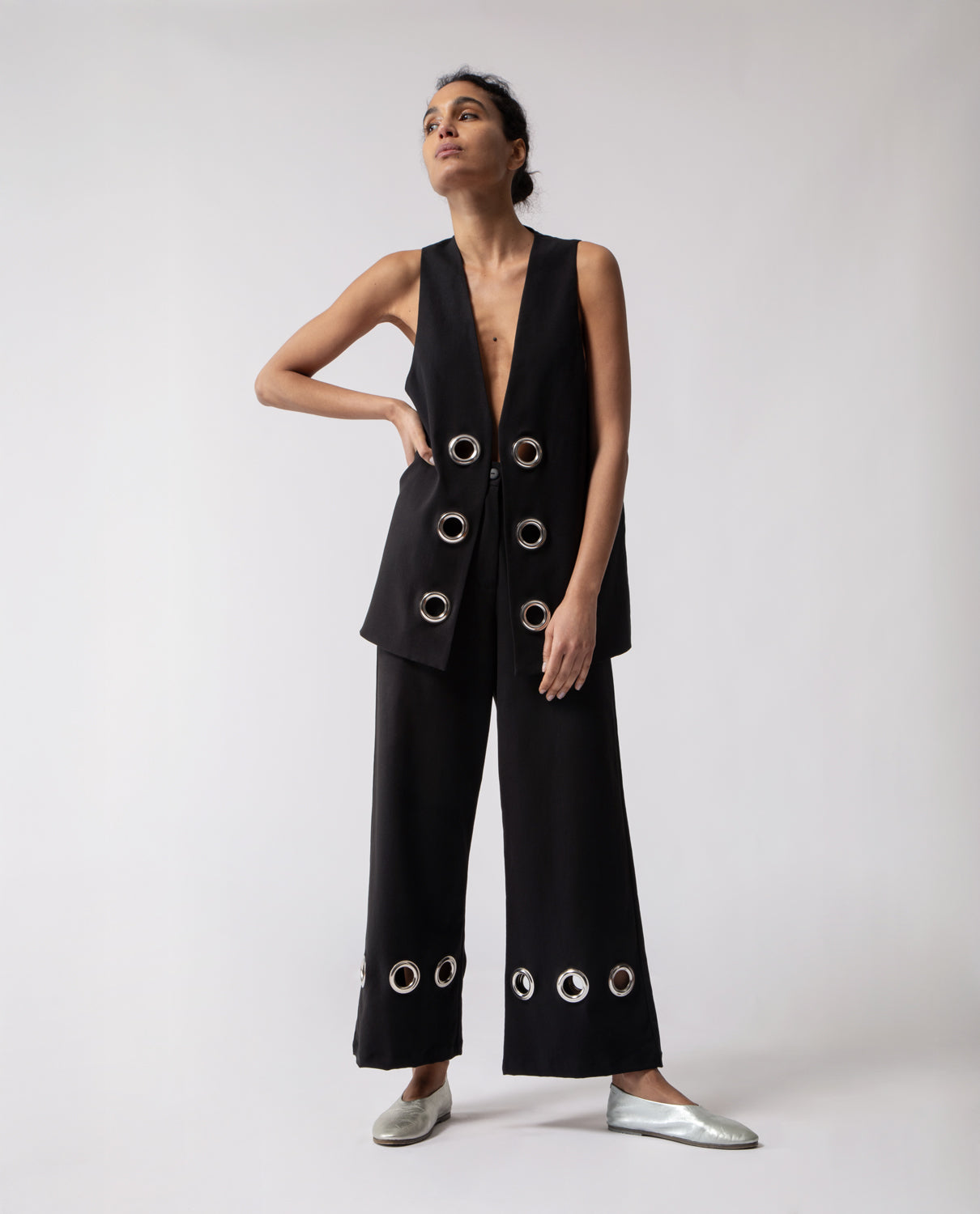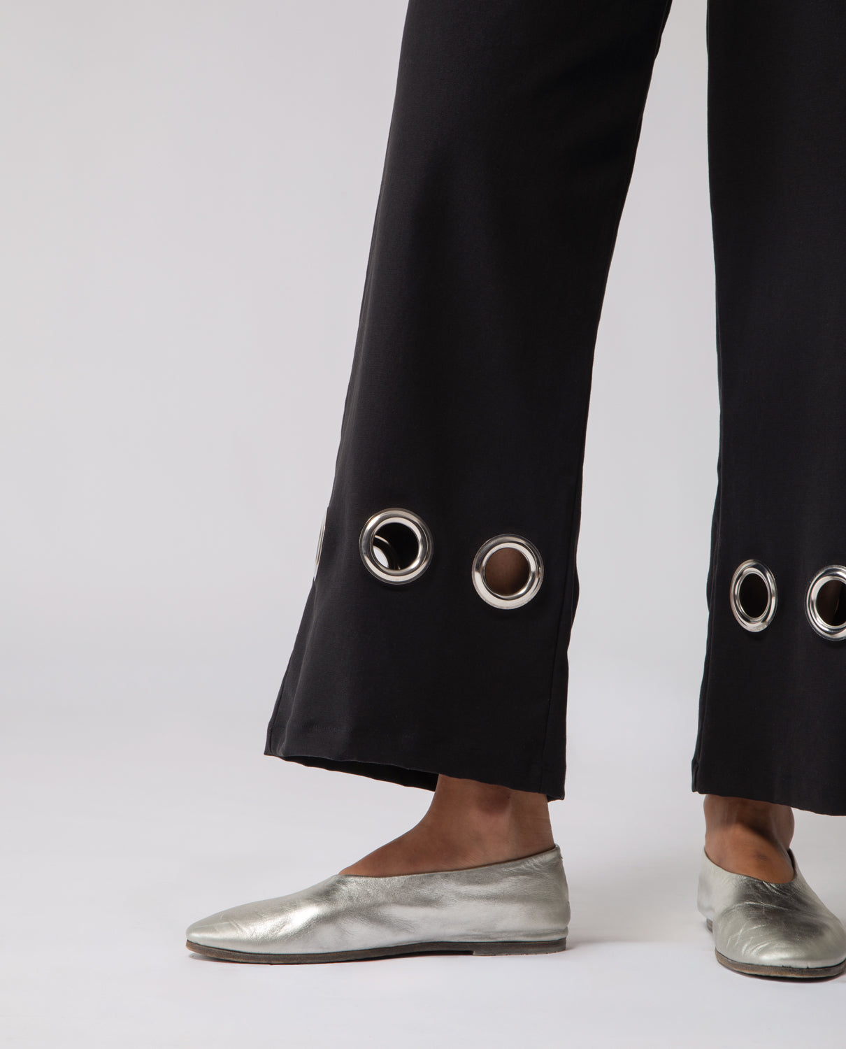 Trousers with a subtle flare beginning at the knee, featuring softly rounded pockets. They are accented with 1970s-inspired metal rings — a nod to the decade’s experimental approach to hardware, when functional elements evolved into decorative statements reflecting a spirit of freedom and modernity.