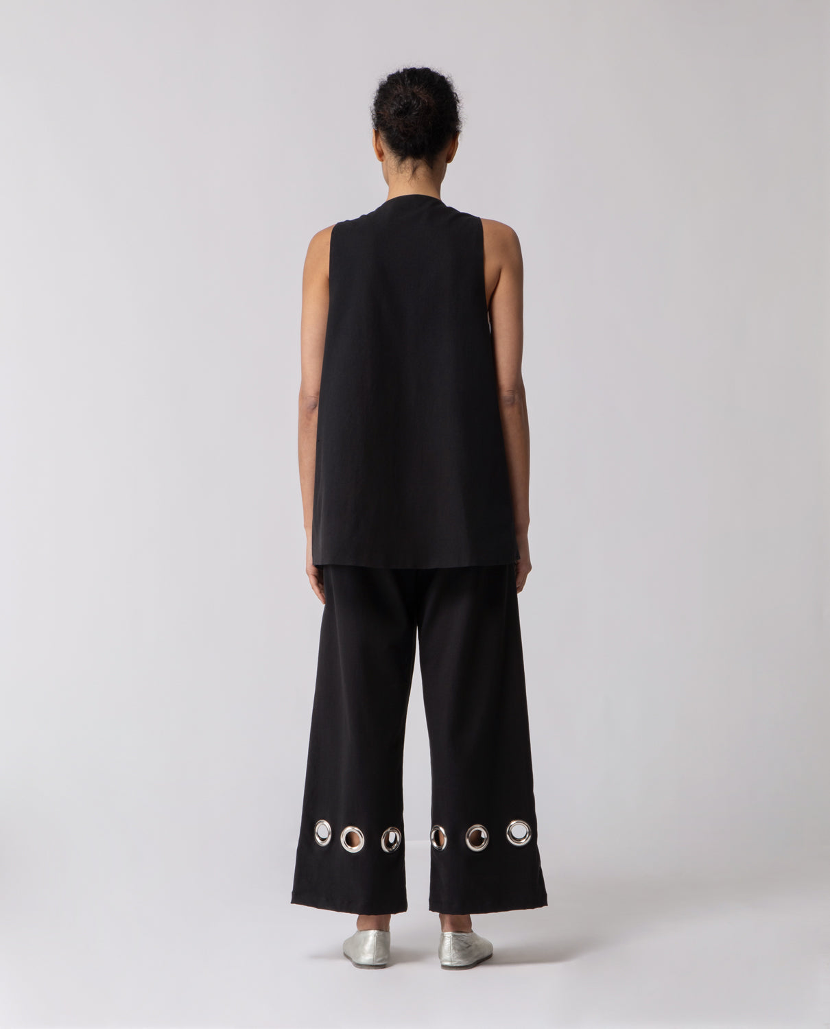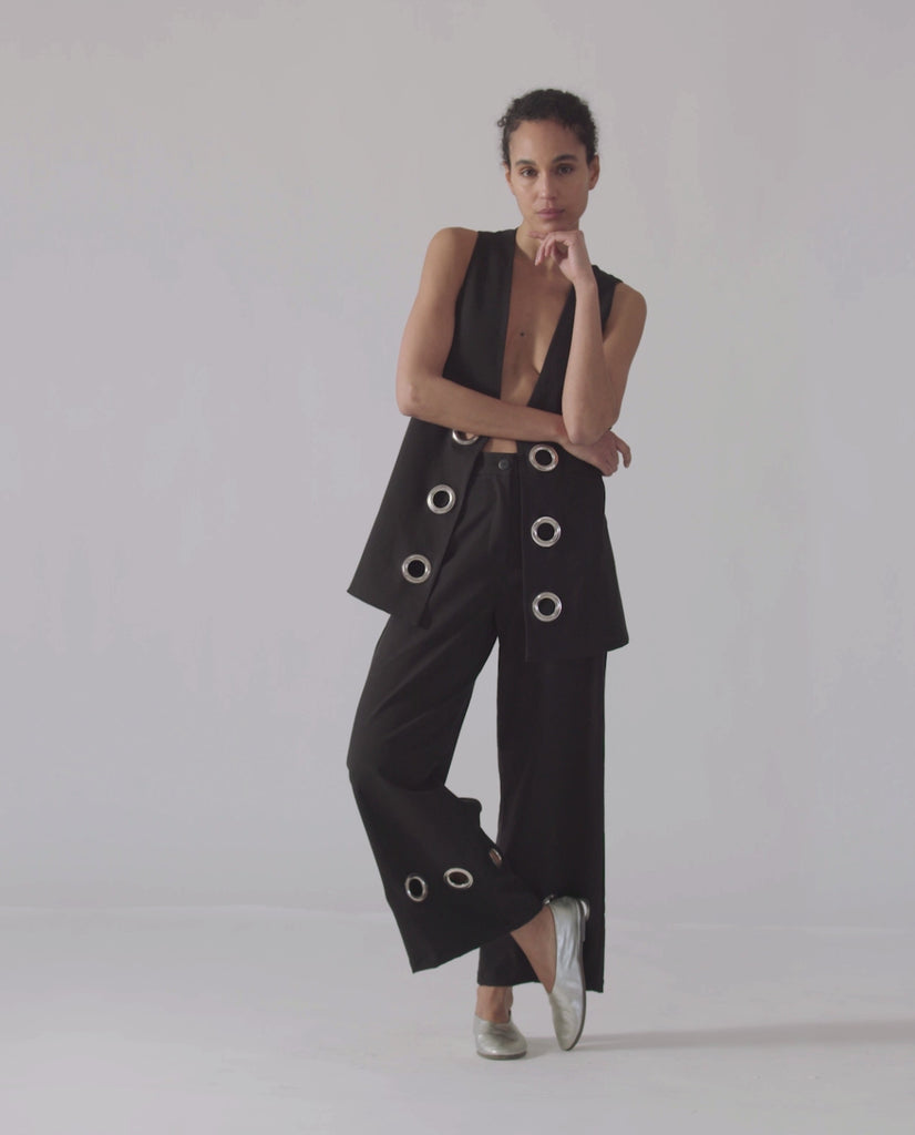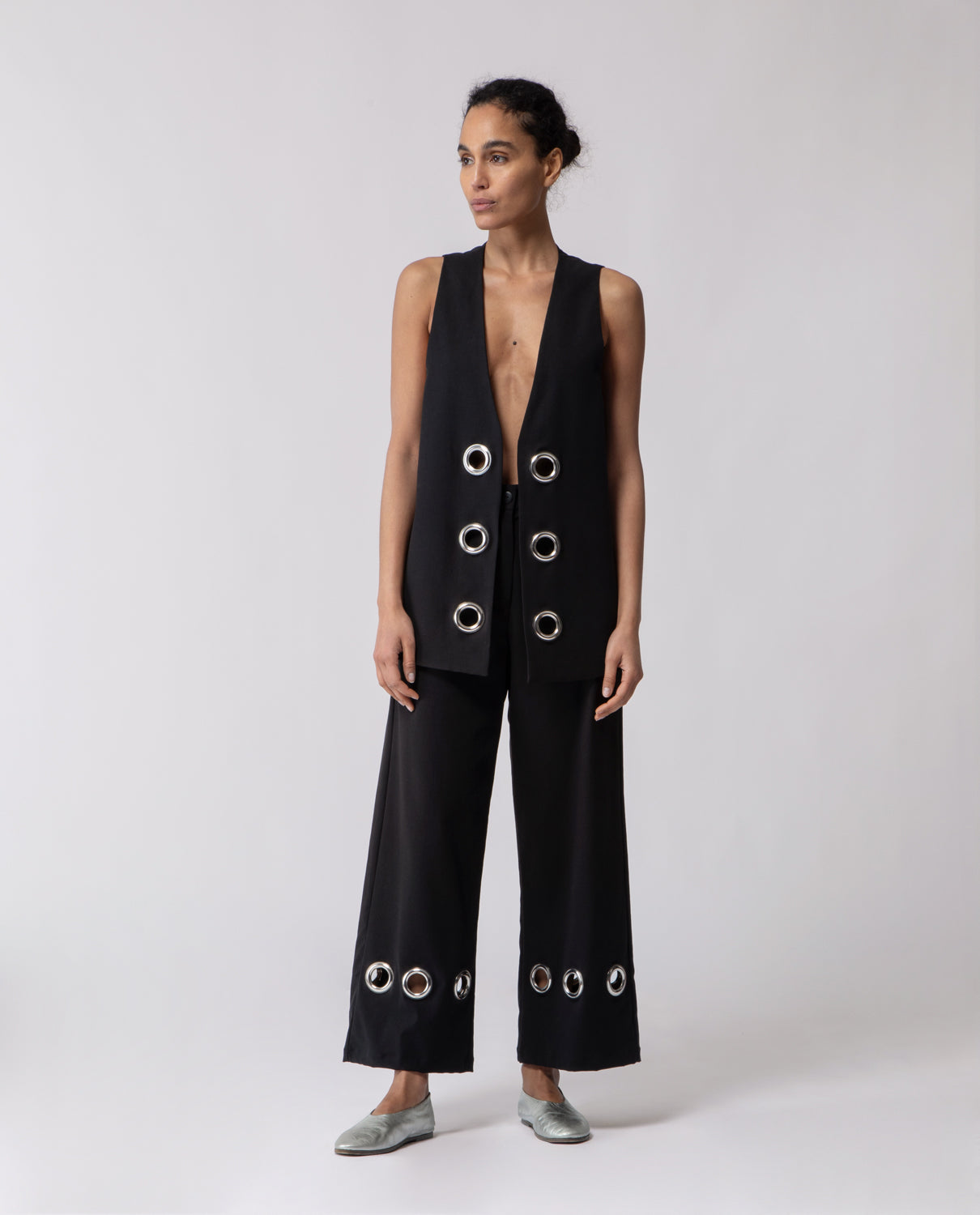 Trousers with a subtle flare beginning at the knee, featuring softly rounded pockets. They are accented with 1970s-inspired metal rings — a nod to the decade’s experimental approach to hardware, when functional elements evolved into decorative statements reflecting a spirit of freedom and modernity.