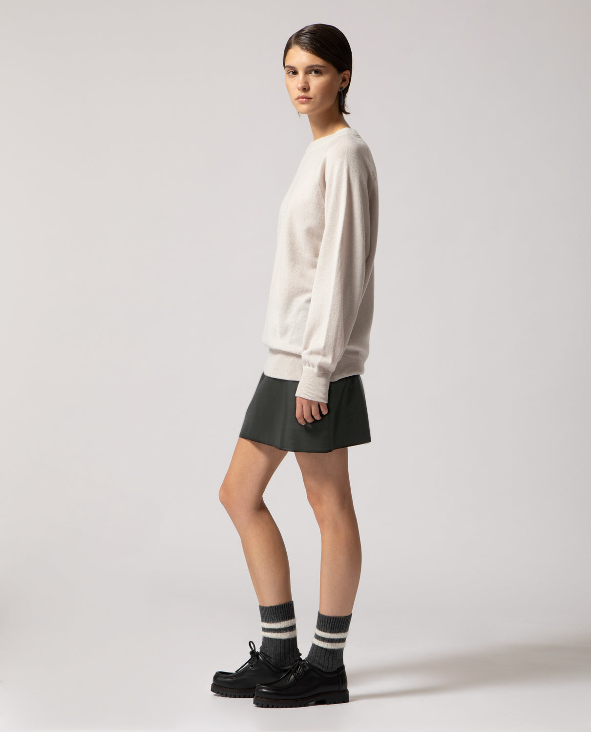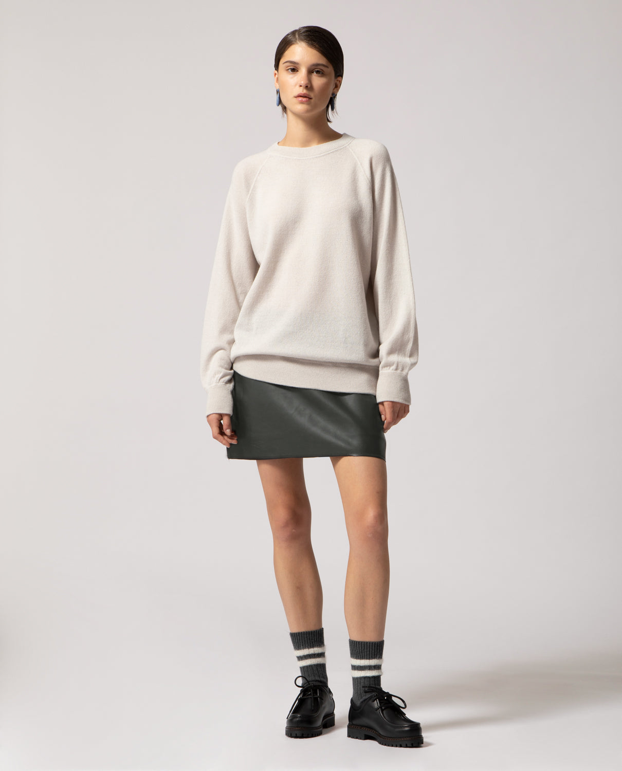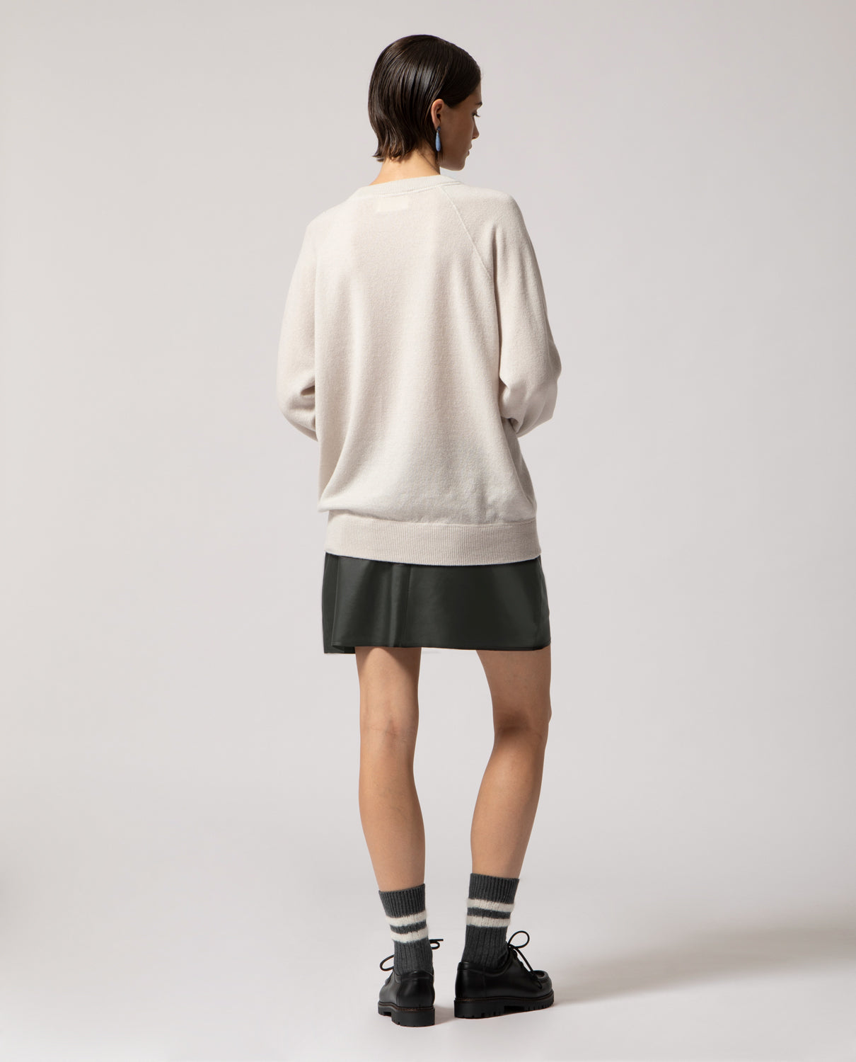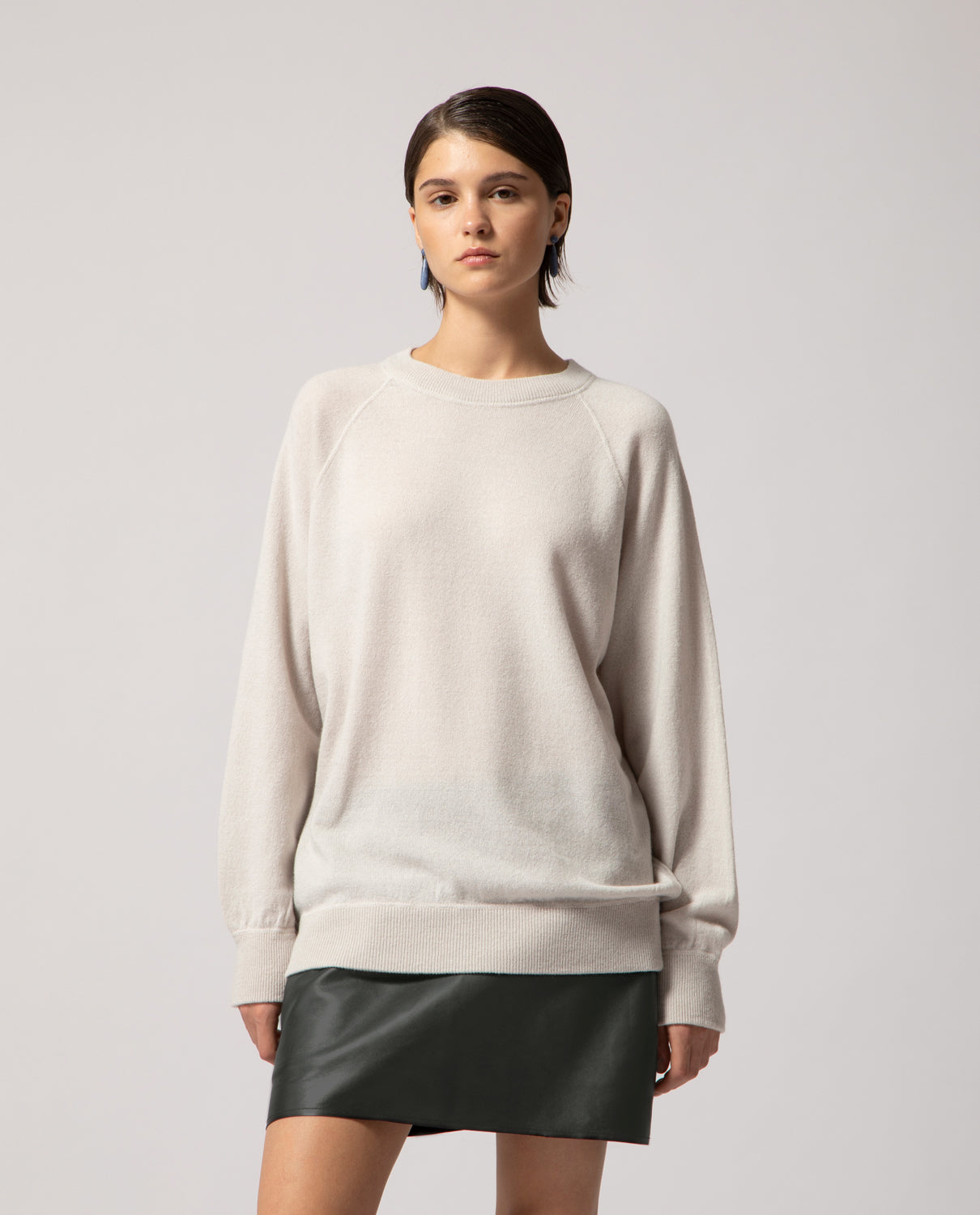 A raglan-sleeve sweater with a generous, oversized silhouette, designed in a one-size fit that comfortably adapts from S to L. Knitted in a soft blend of 30% cashmere and 70% merino wool, it is exceptionally warm, lightweight, and enveloping.