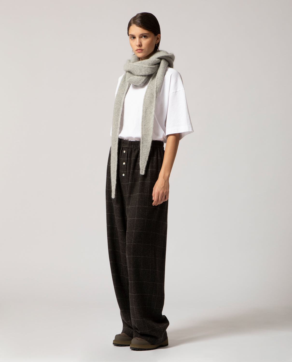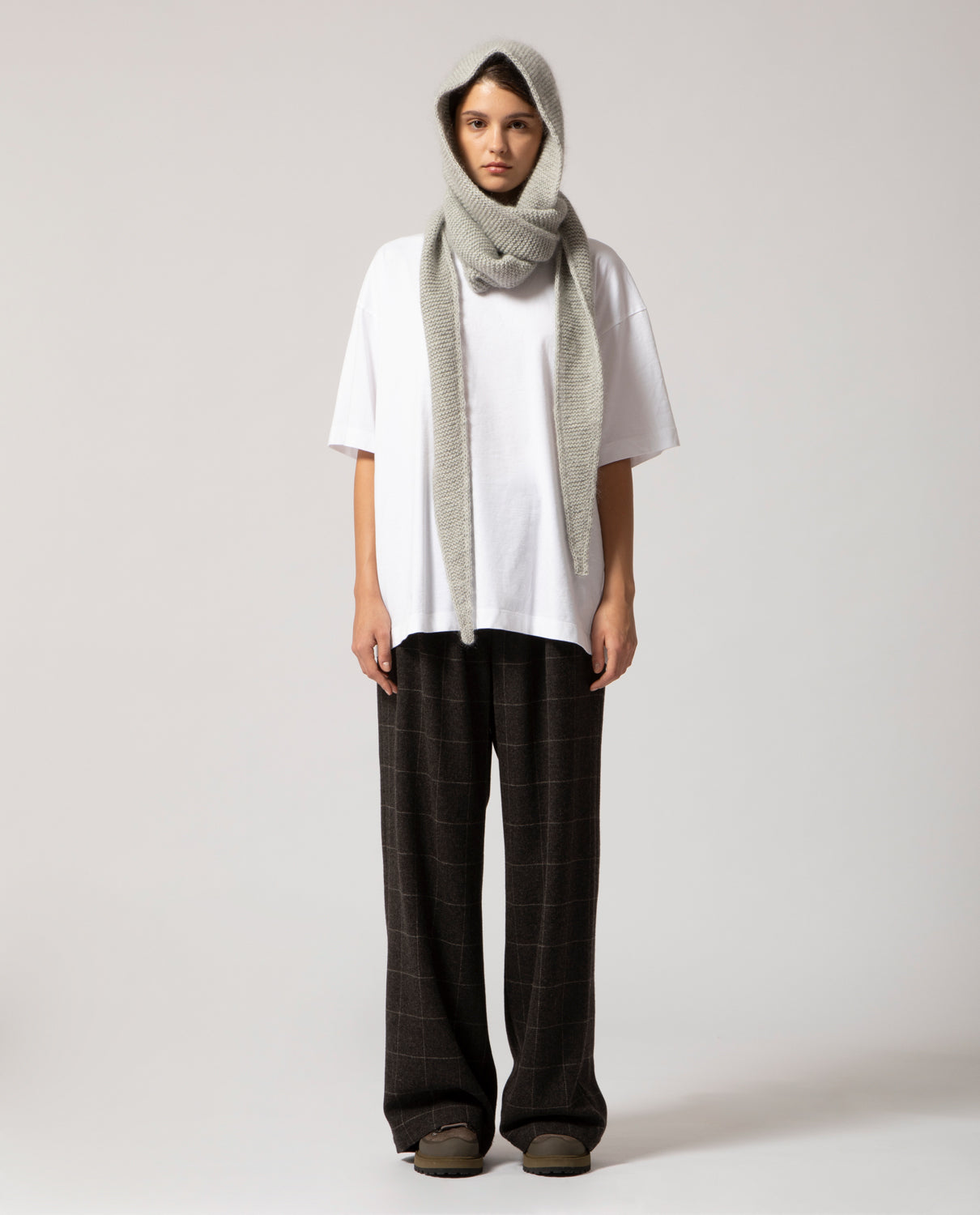 Handcrafted from soft Merino wool, this warm scarf features an integrated hood, combining comfort with versatile wear.