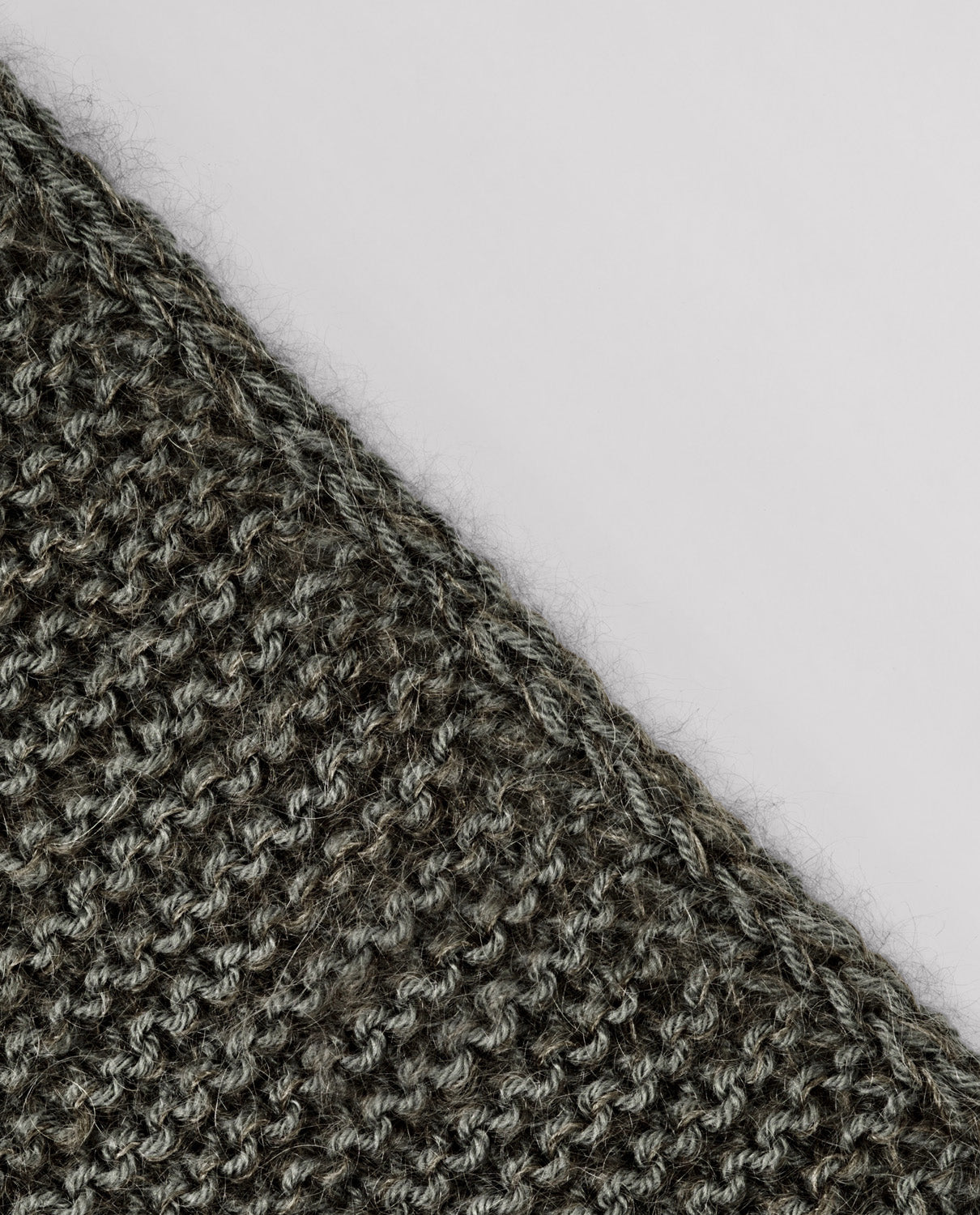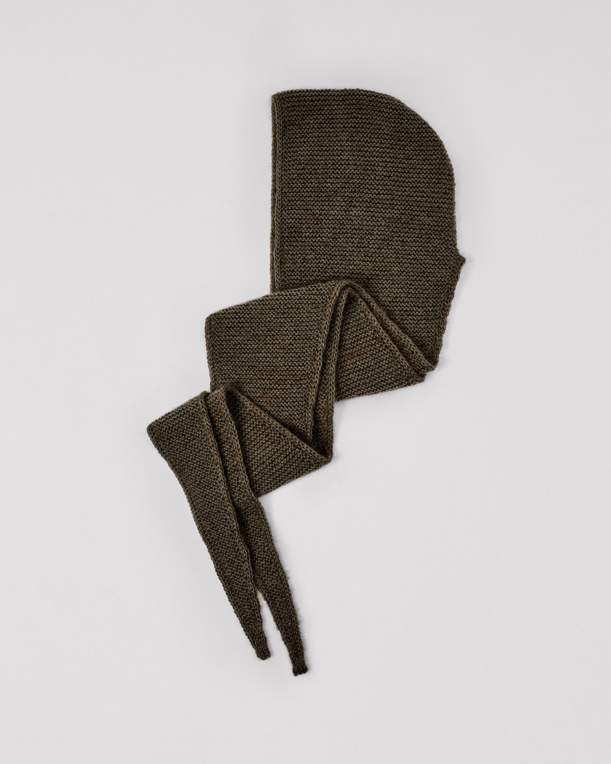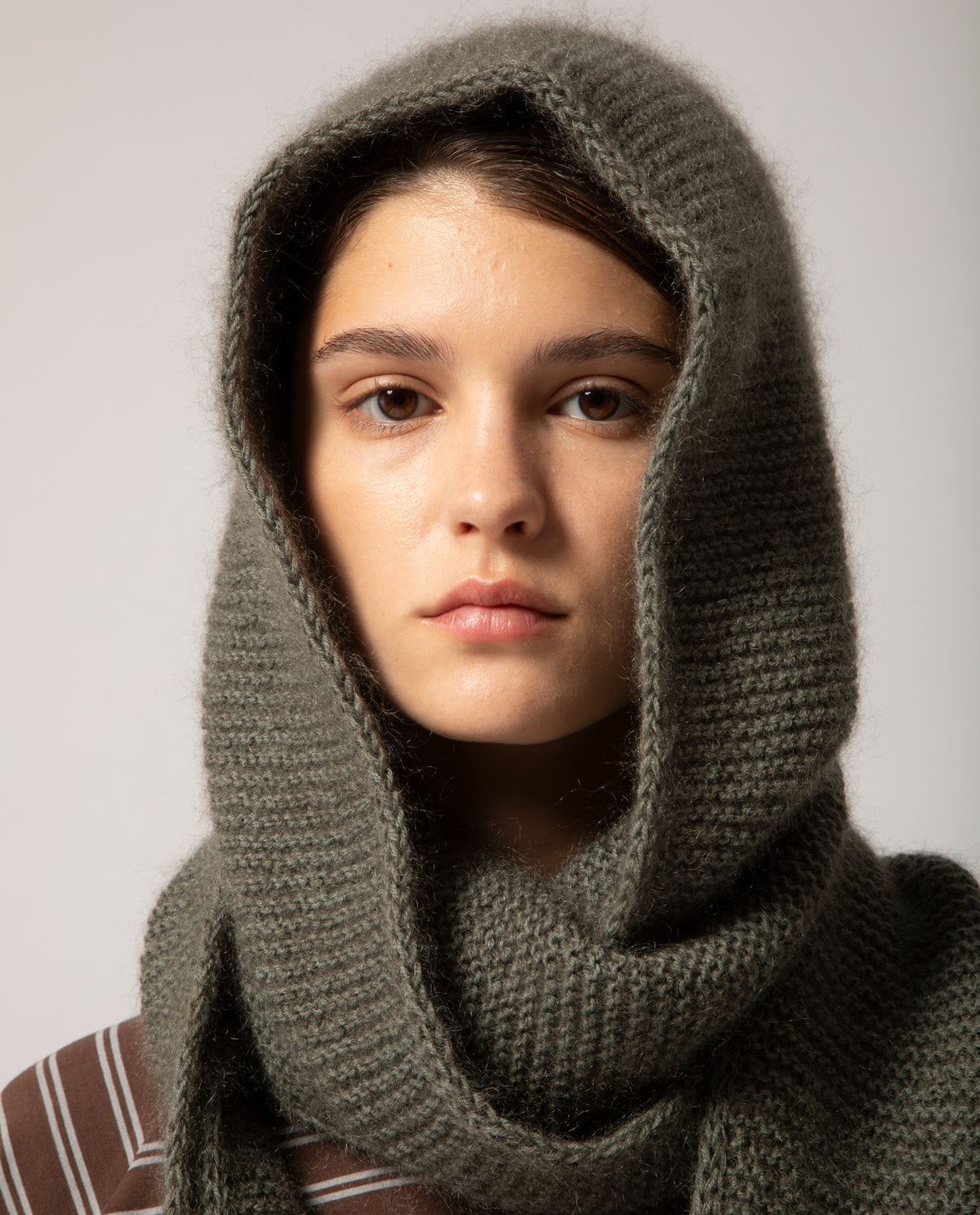 Handcrafted from soft Merino wool, this warm scarf features an integrated hood, combining comfort with versatile wear.