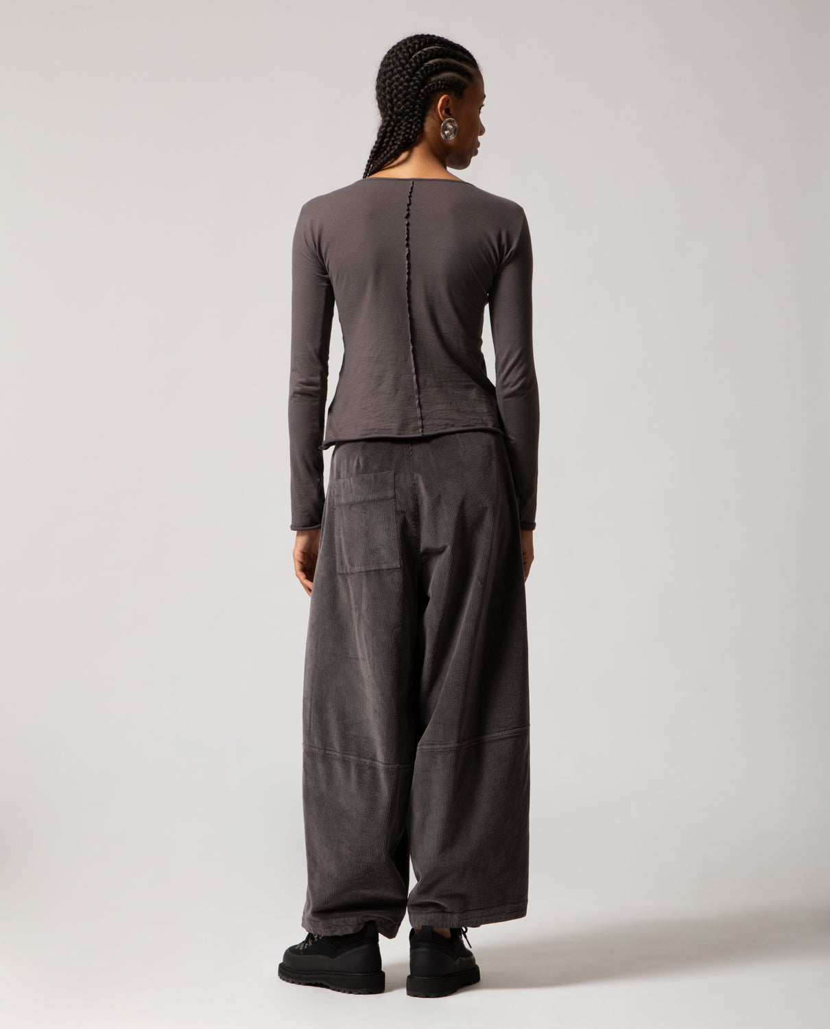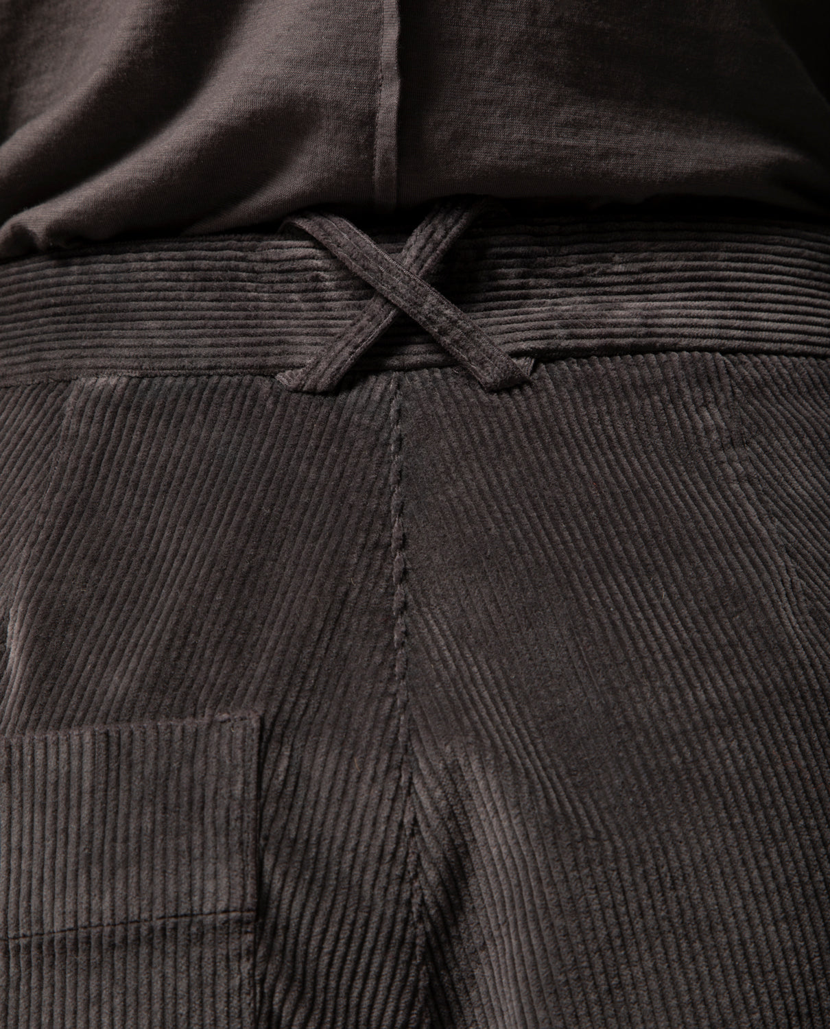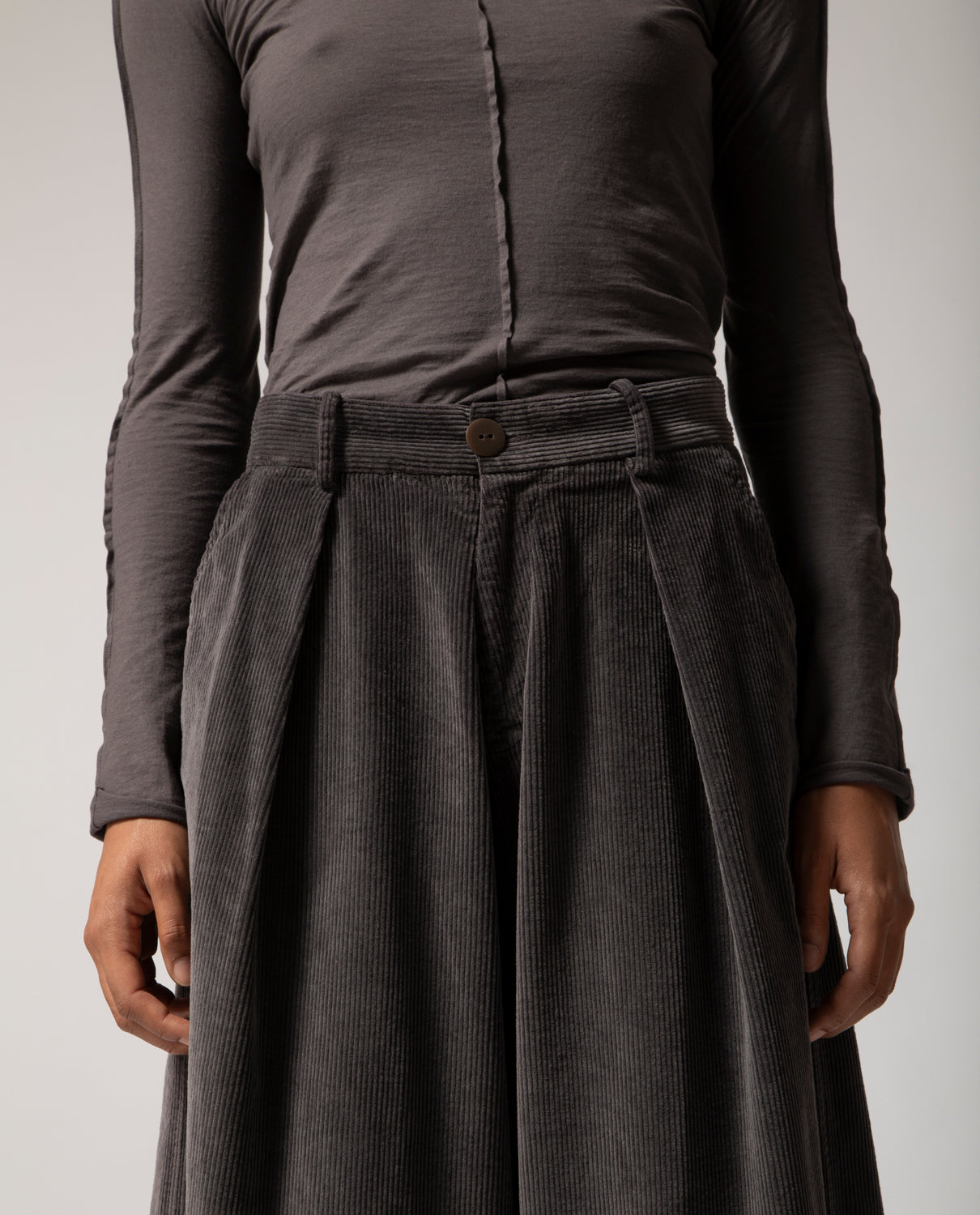 Low-rise, wide-leg trousers with a relaxed fit, inspired by traditional Japanese garments. Cut in wide-wale corduroy for structure and texture, this piece is marked by a topstitched seam below the knee.