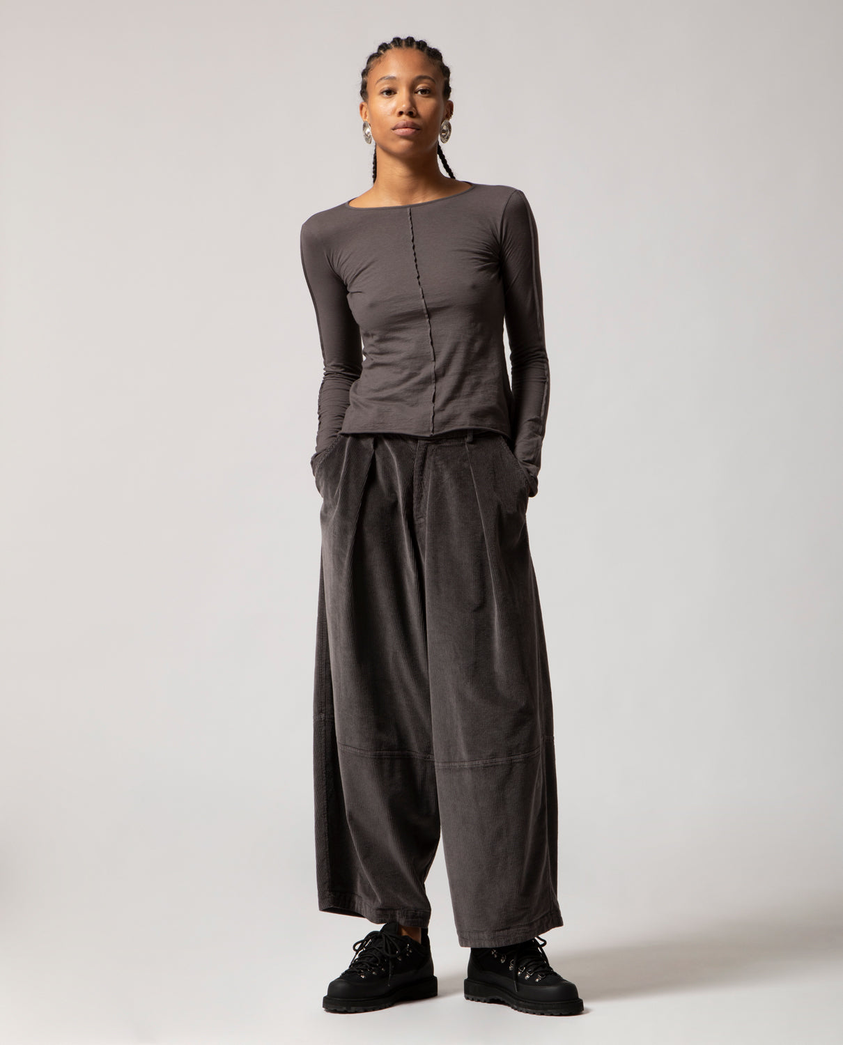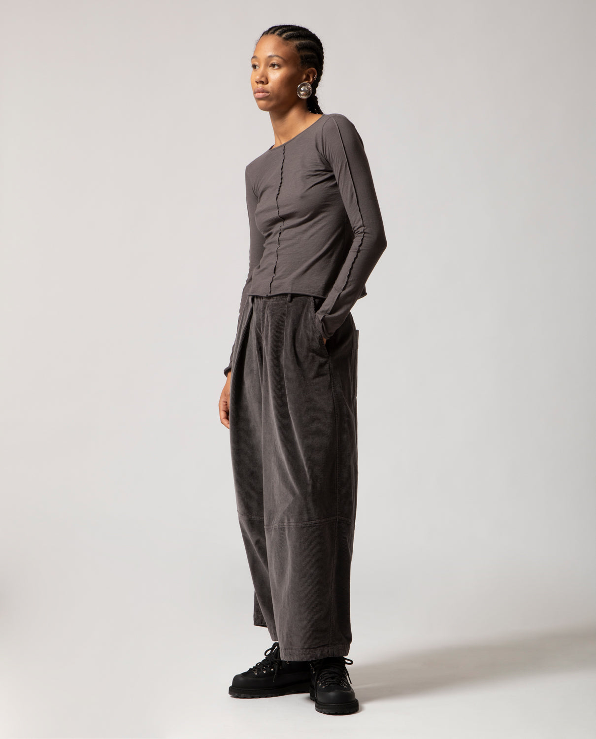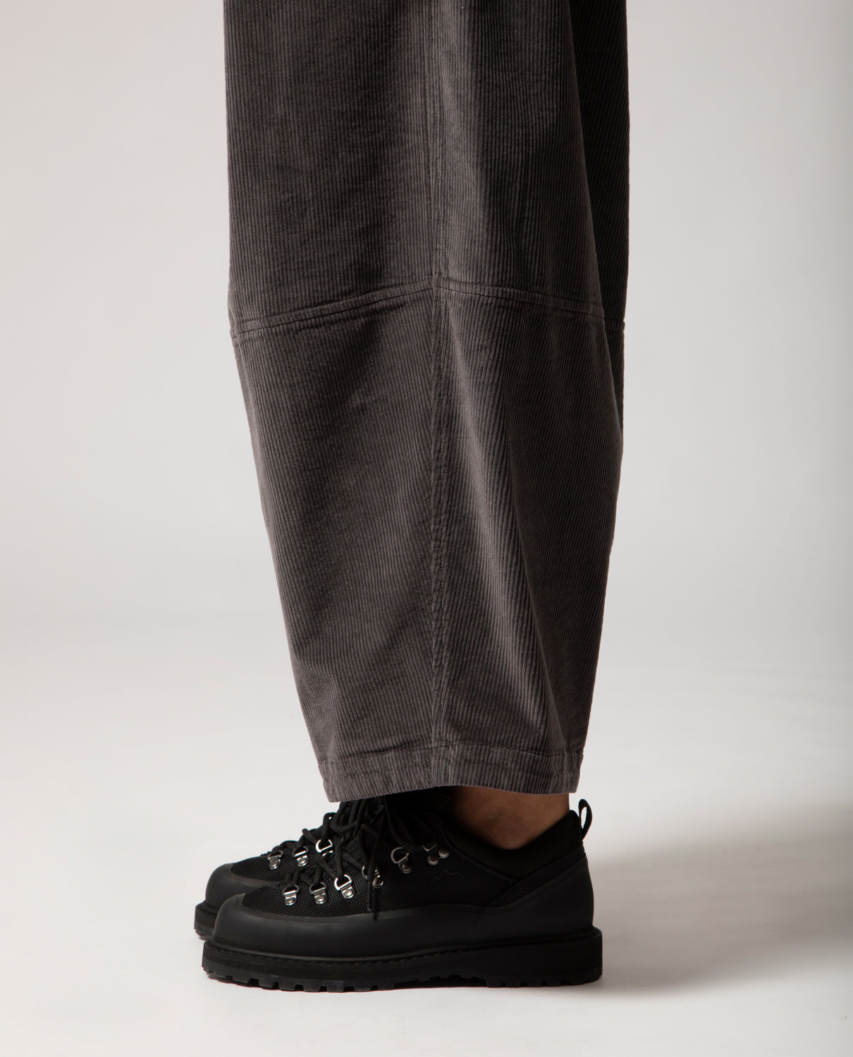 Low-rise, wide-leg trousers with a relaxed fit, inspired by traditional Japanese garments. Cut in wide-wale corduroy for structure and texture, this piece is marked by a topstitched seam below the knee.