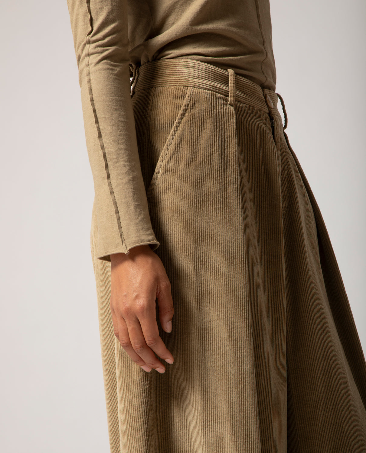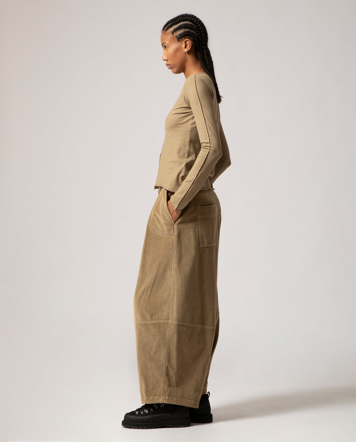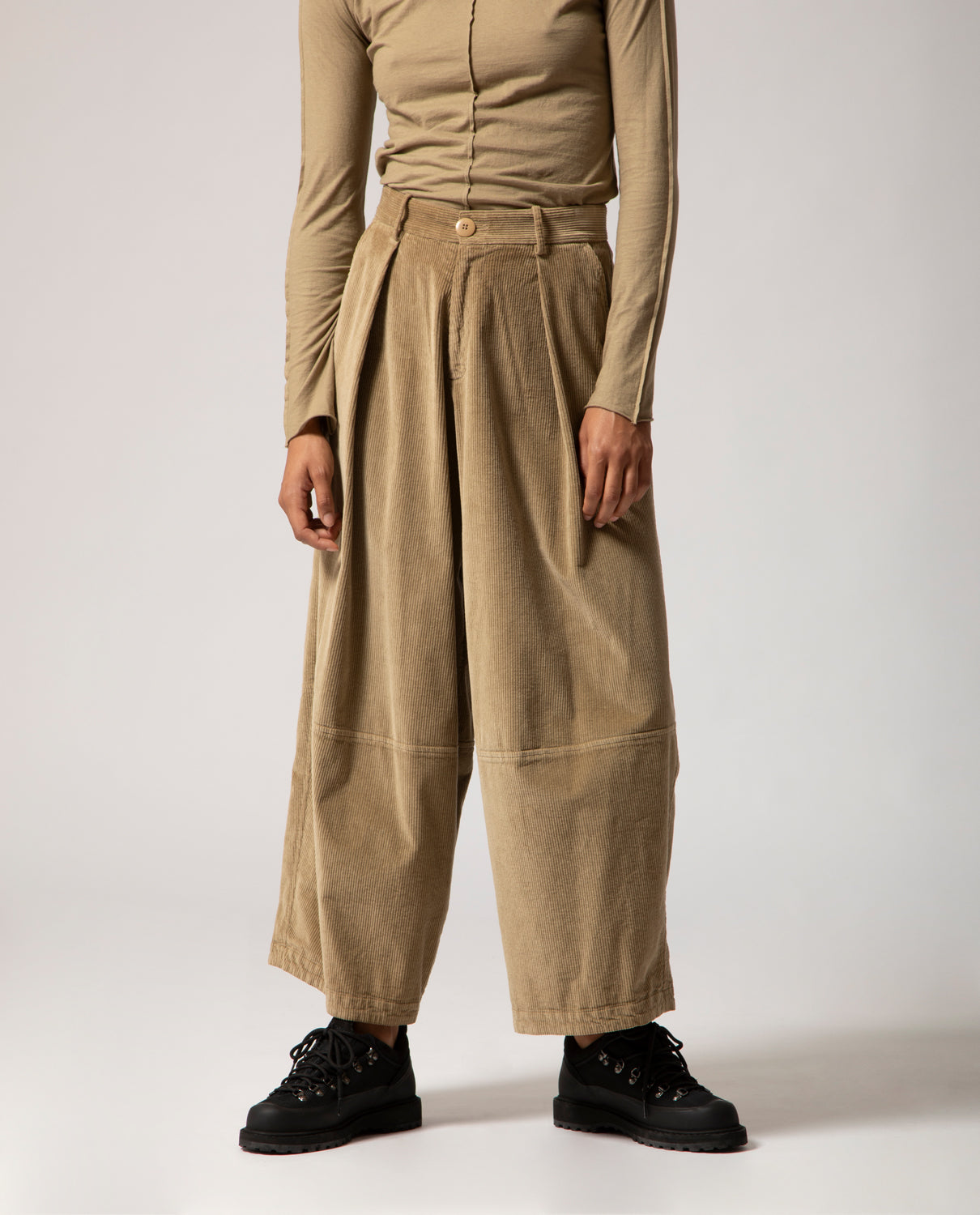 Low-rise, wide-leg trousers with a relaxed fit, inspired by traditional Japanese garments. Cut in wide-wale corduroy for structure and texture, this piece is marked by a topstitched seam below the knee.