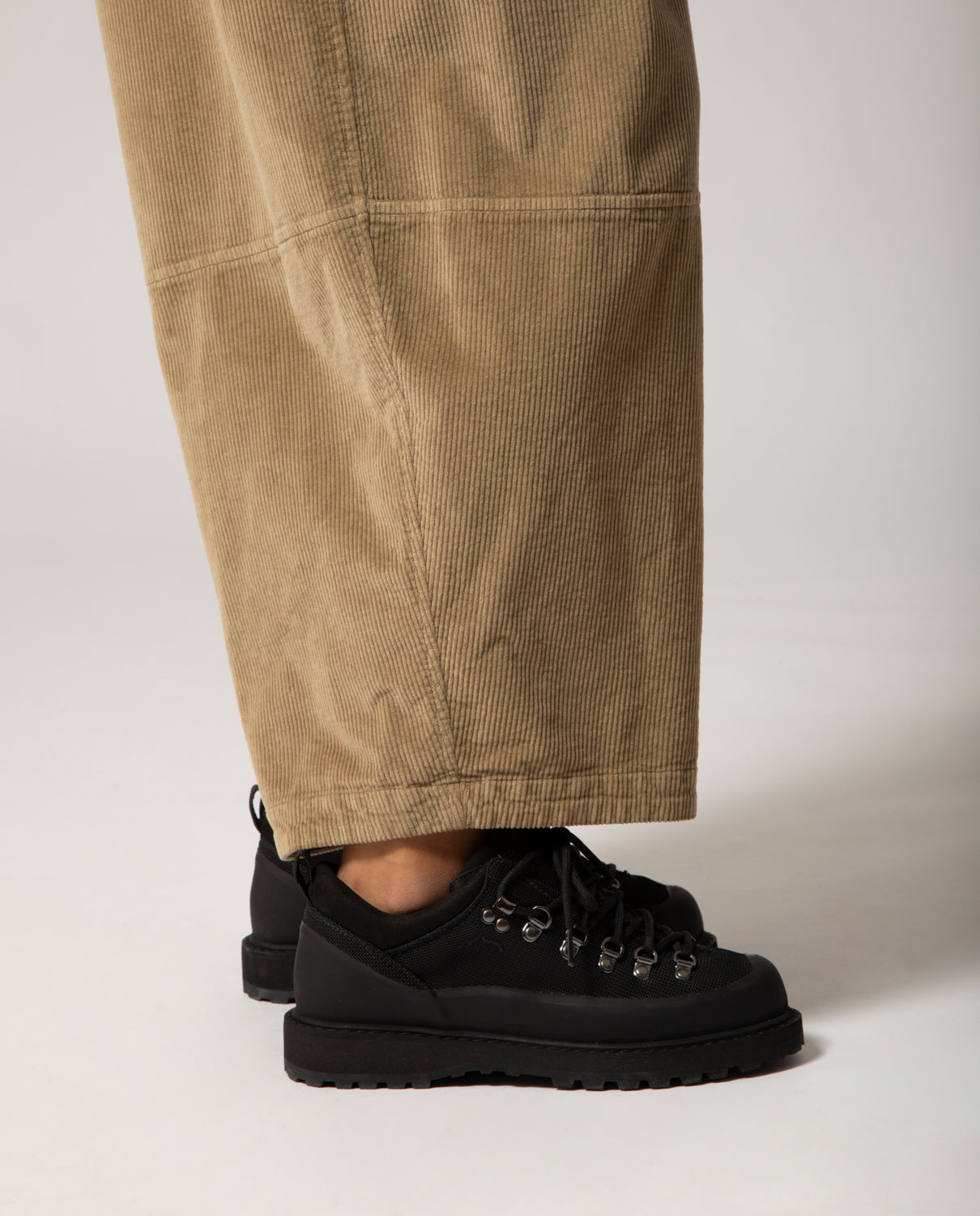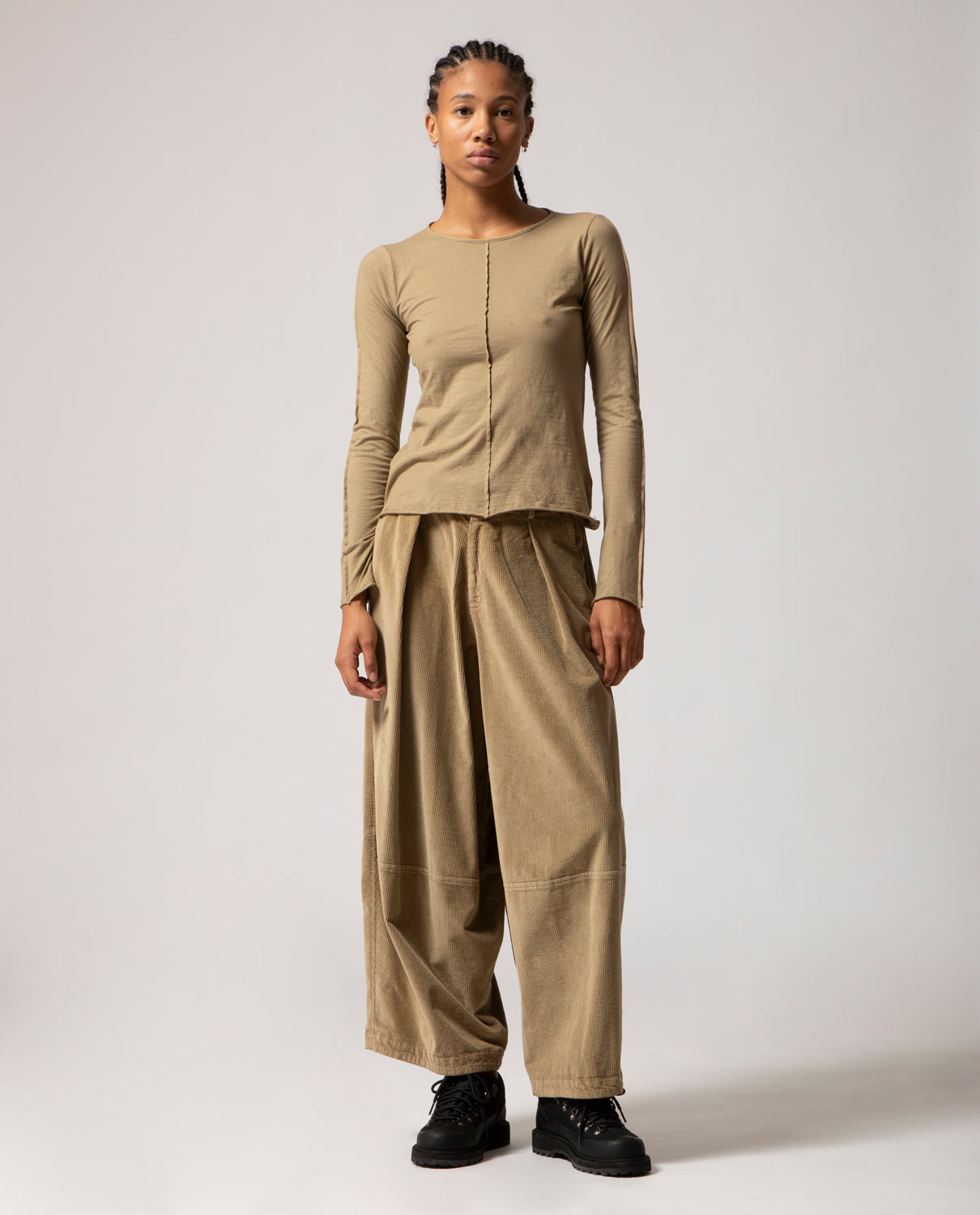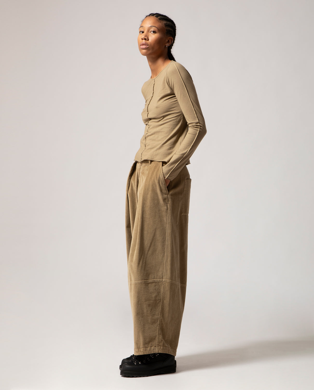 Low-rise, wide-leg trousers with a relaxed fit, inspired by traditional Japanese garments. Cut in wide-wale corduroy for structure and texture, this piece is marked by a topstitched seam below the knee.
