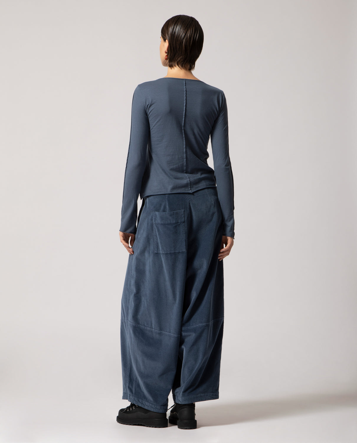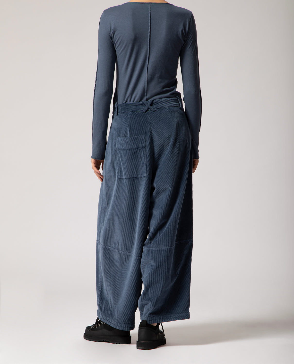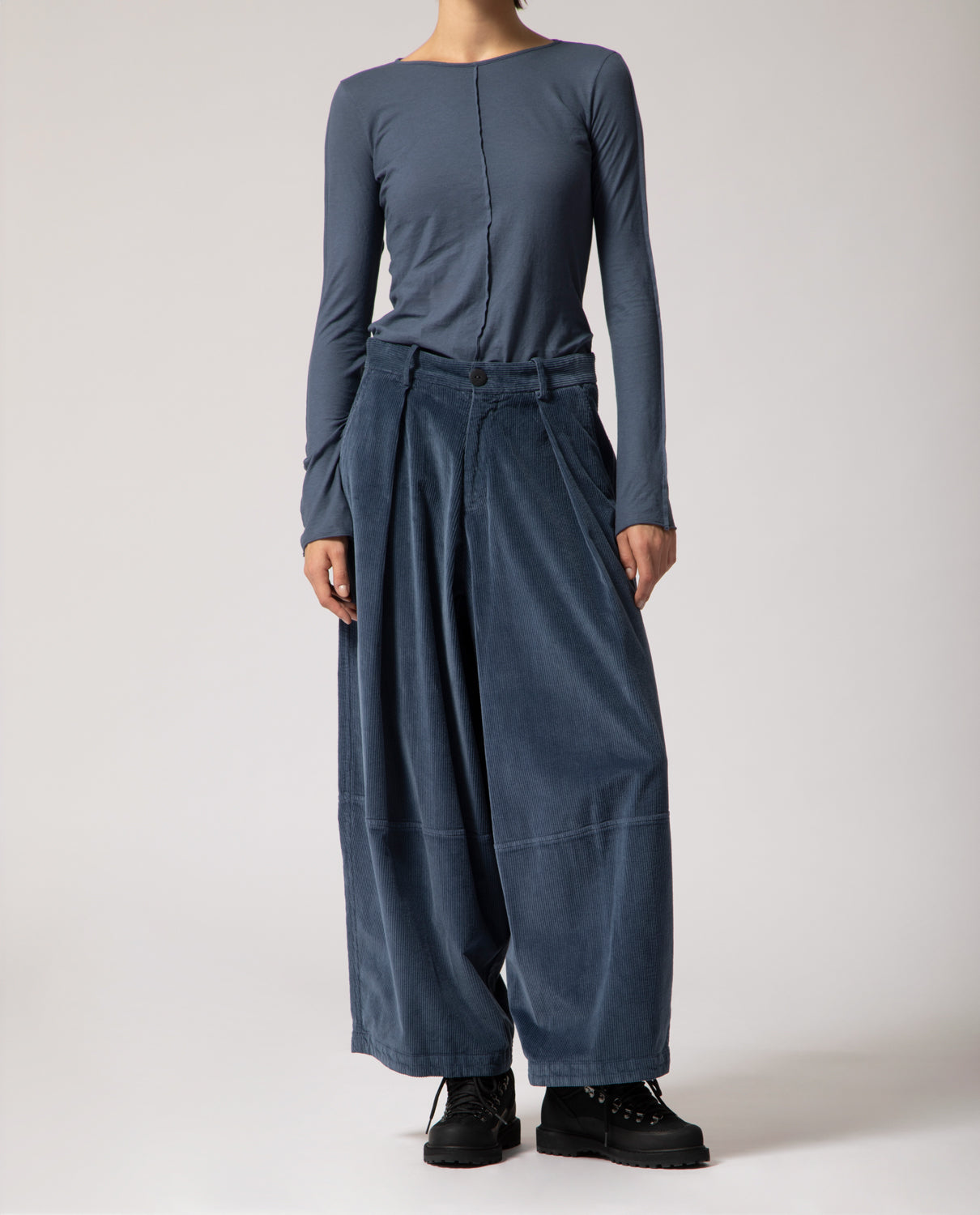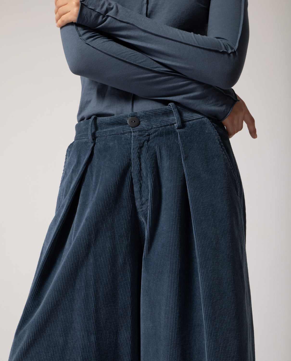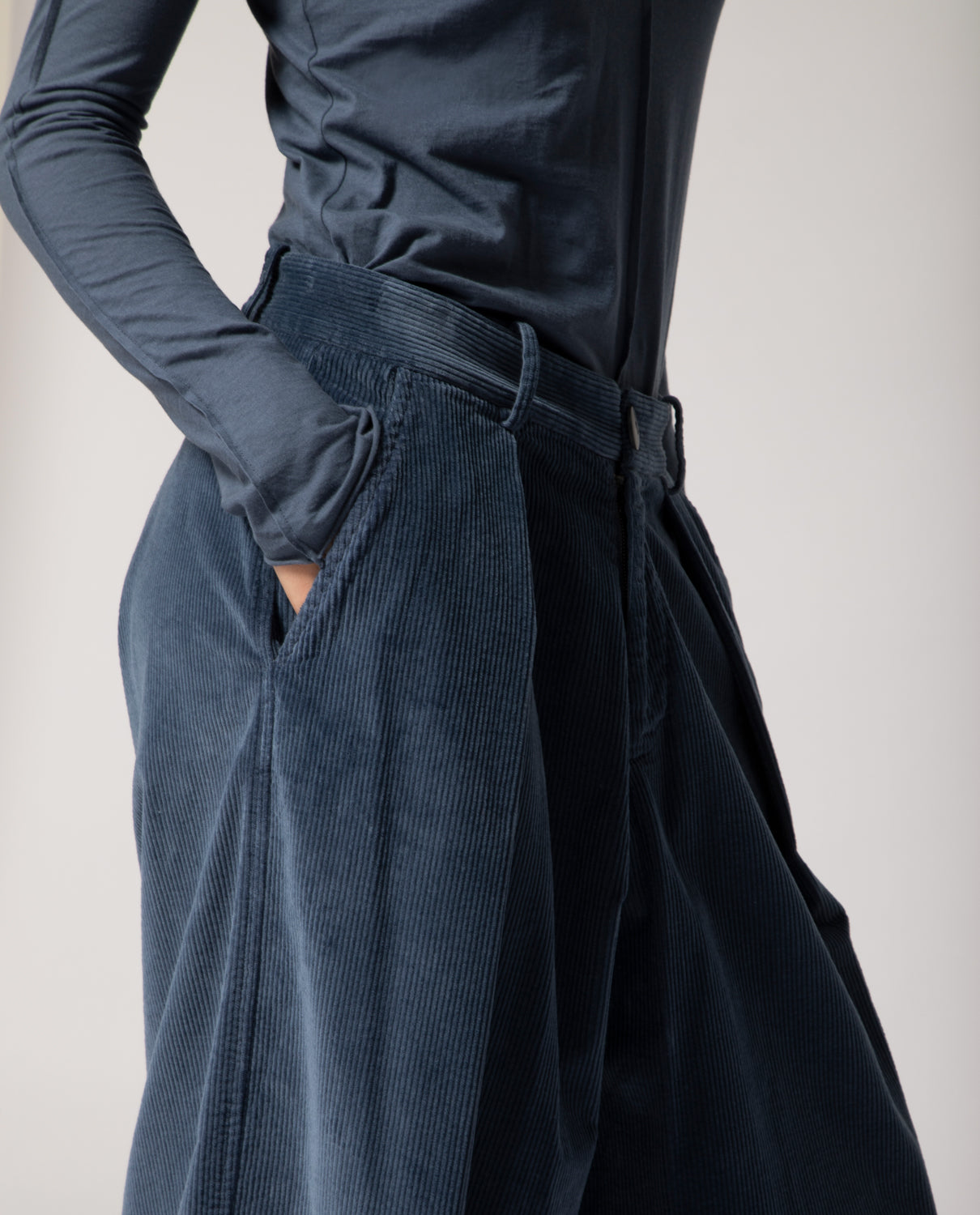 Low-rise, wide-leg trousers with a relaxed fit, inspired by traditional Japanese garments. Cut in wide-wale corduroy for structure and texture, this piece is marked by a topstitched seam below the knee.