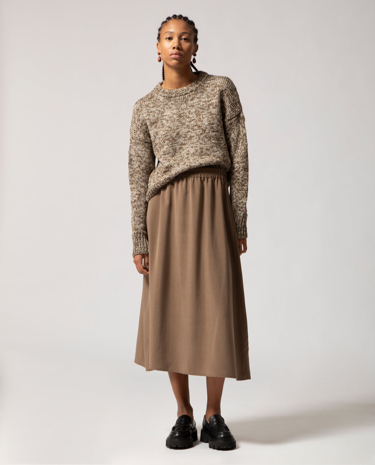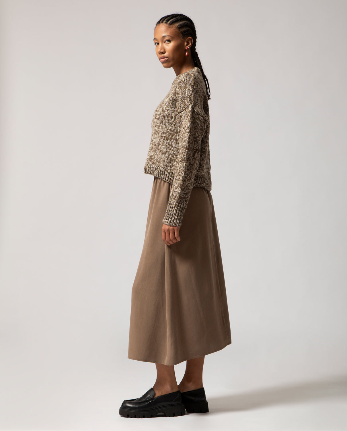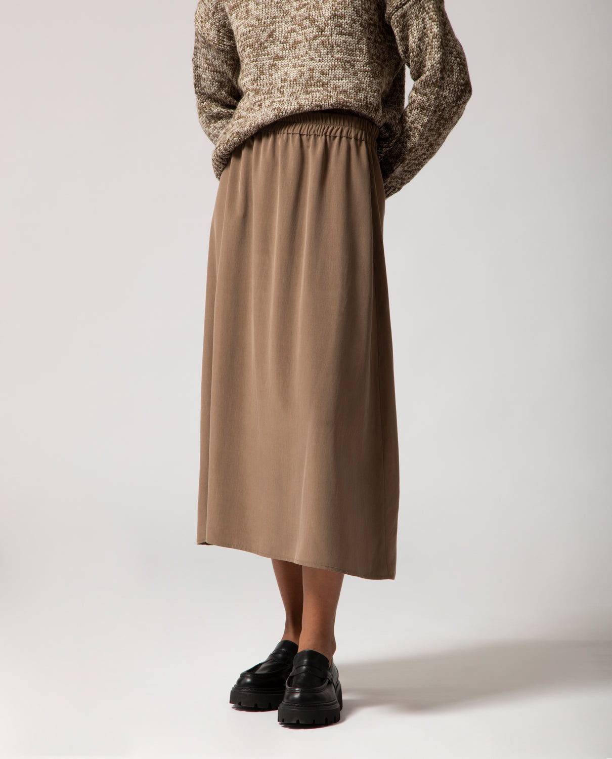 A midi-length silhouette detailed with a elastic waistband. 100% silk.