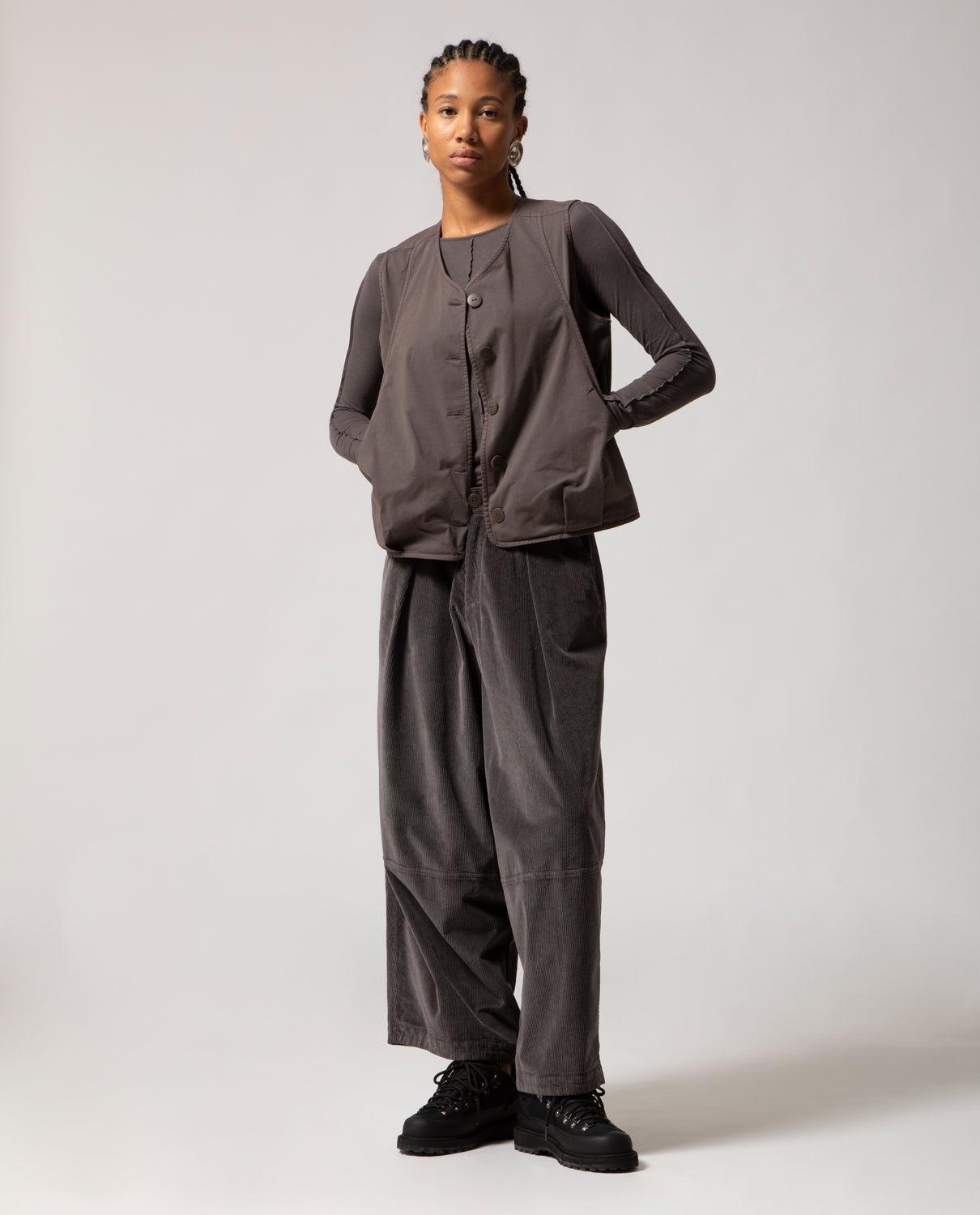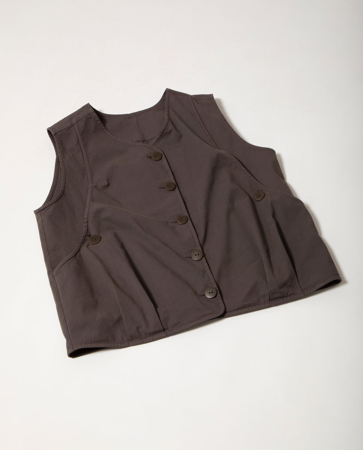 Designed in a relaxed fit vest featuring central buttons and buttoned pockets. Inspired by traditional workwear uniforms, it is finished with double topstitching, creating a second line that naturally leads into the pocket detail.