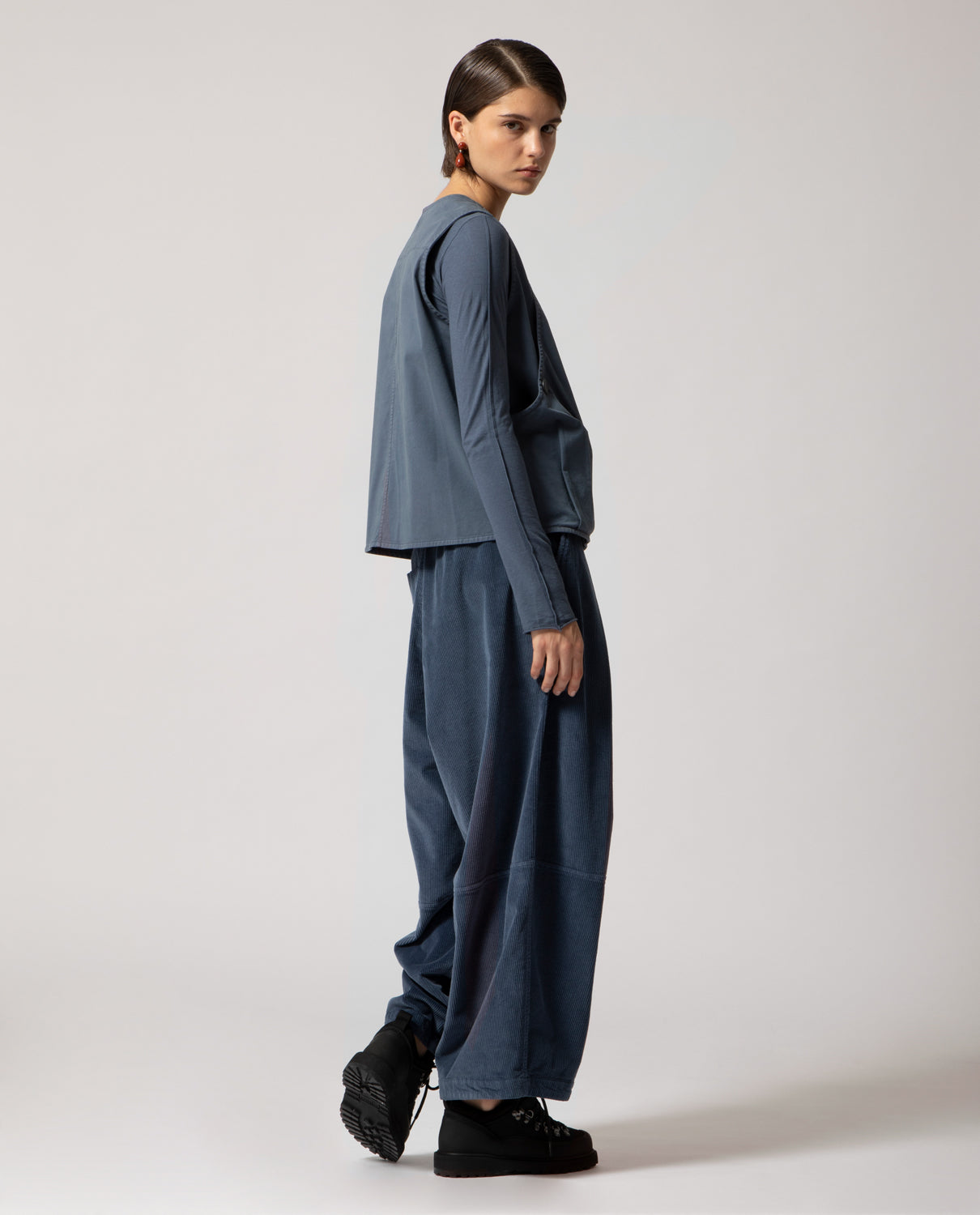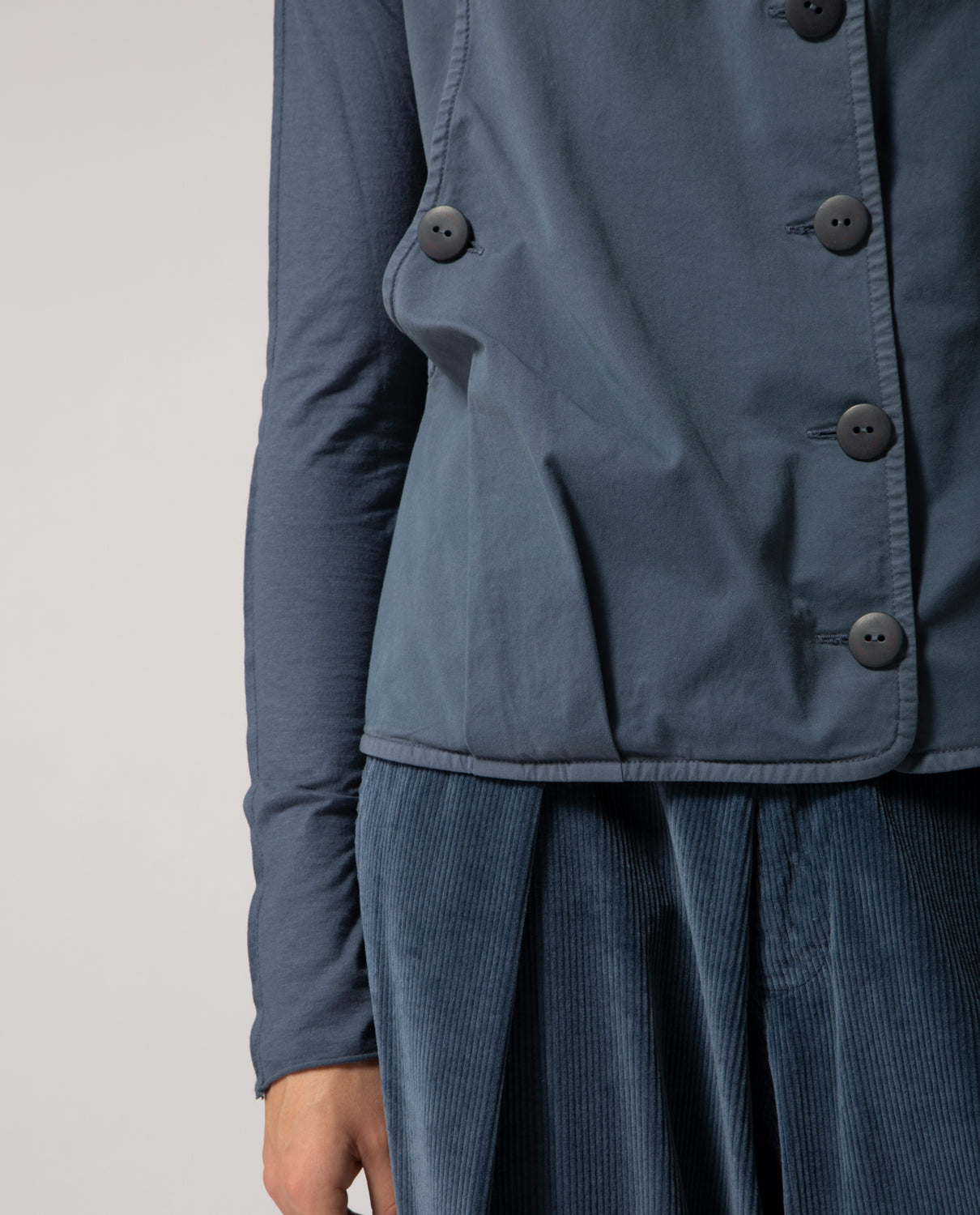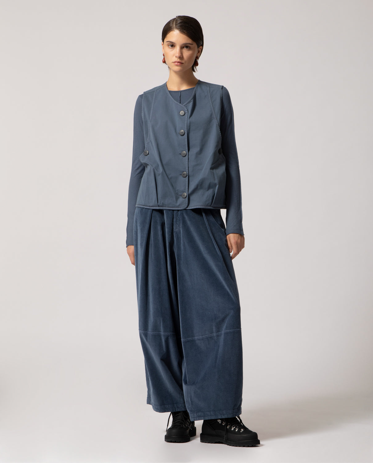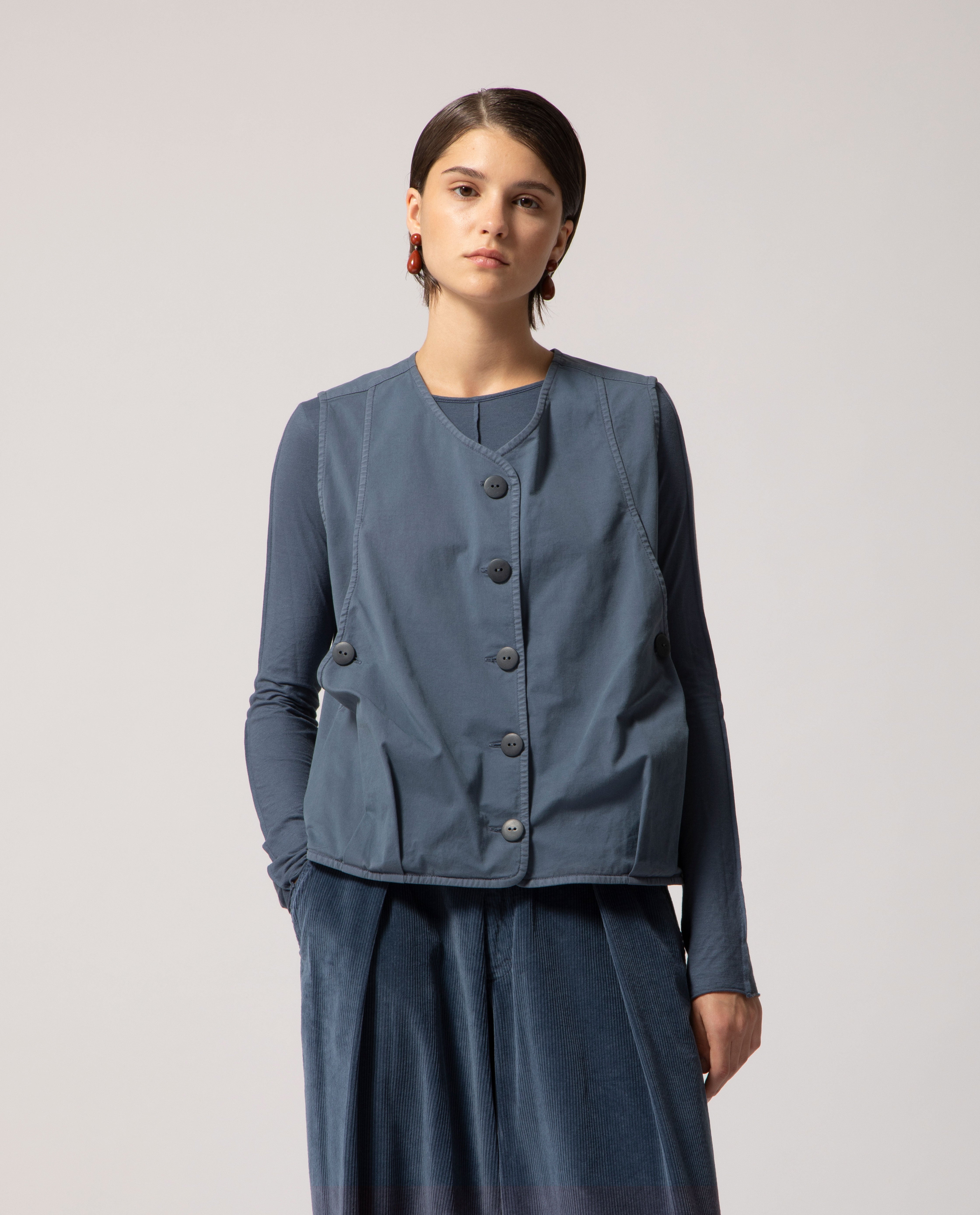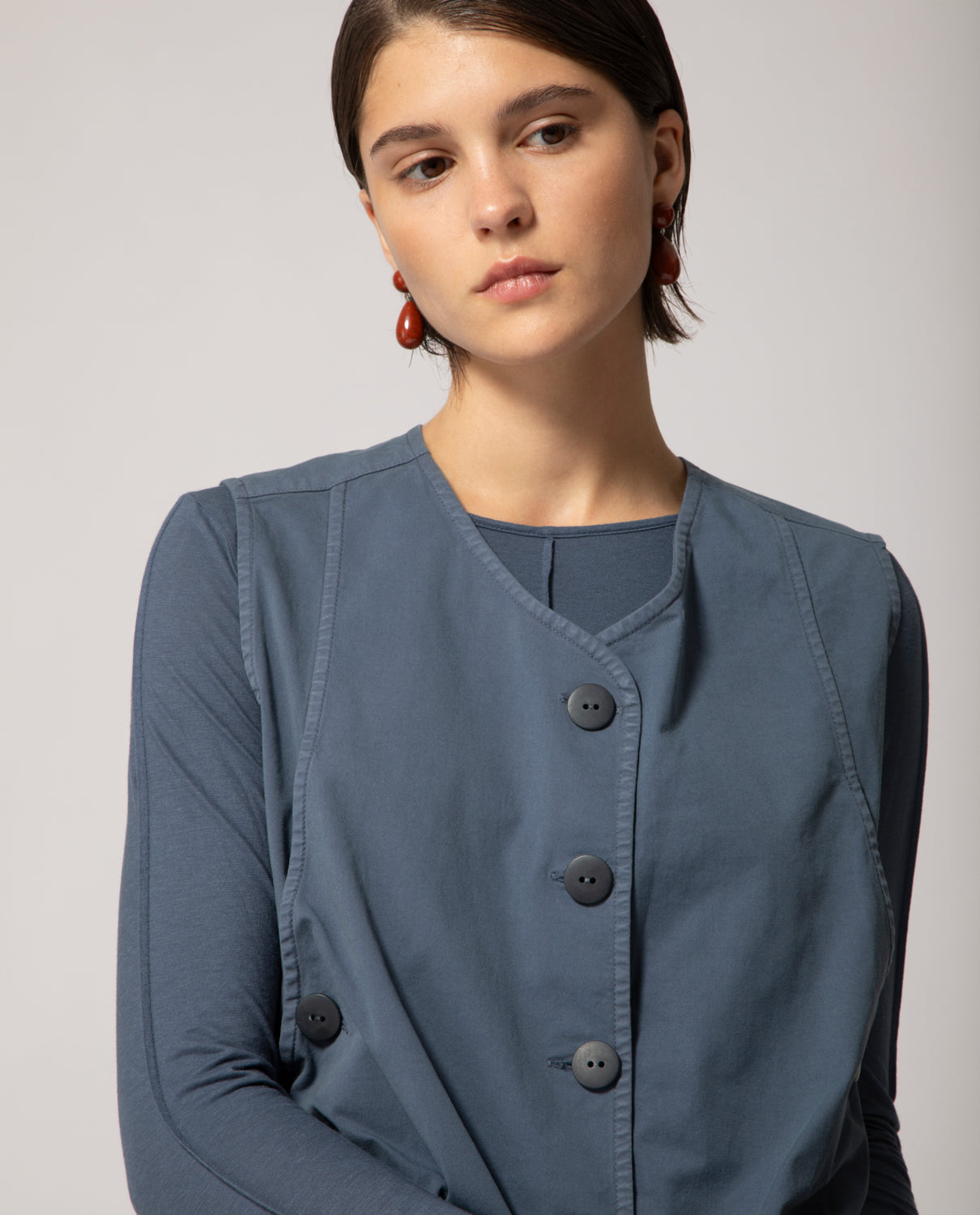 Designed in a relaxed fit vest featuring central buttons and buttoned pockets. Inspired by traditional workwear uniforms, it is finished with double topstitching, creating a second line that naturally leads into the pocket detail.