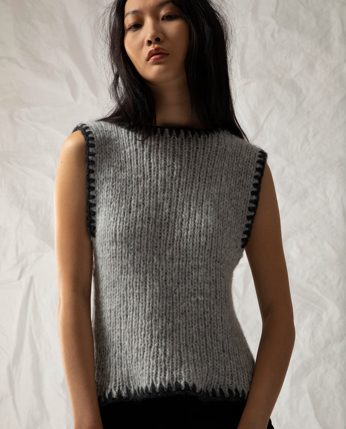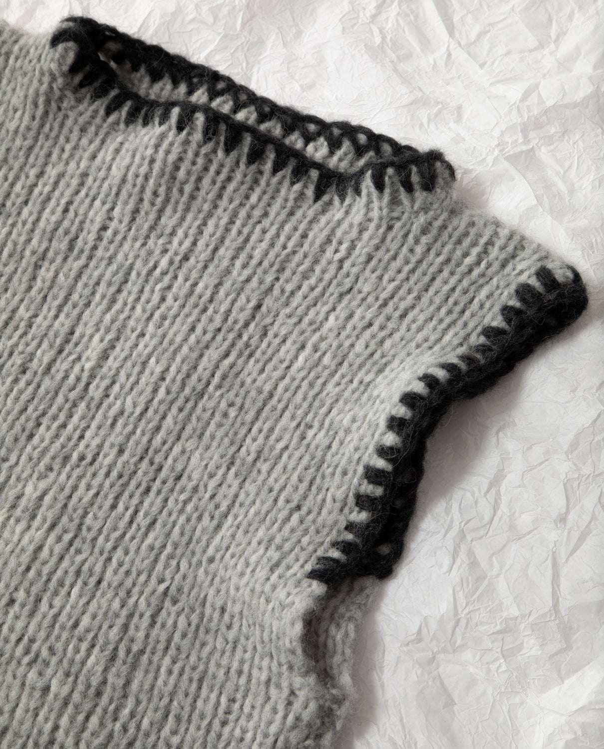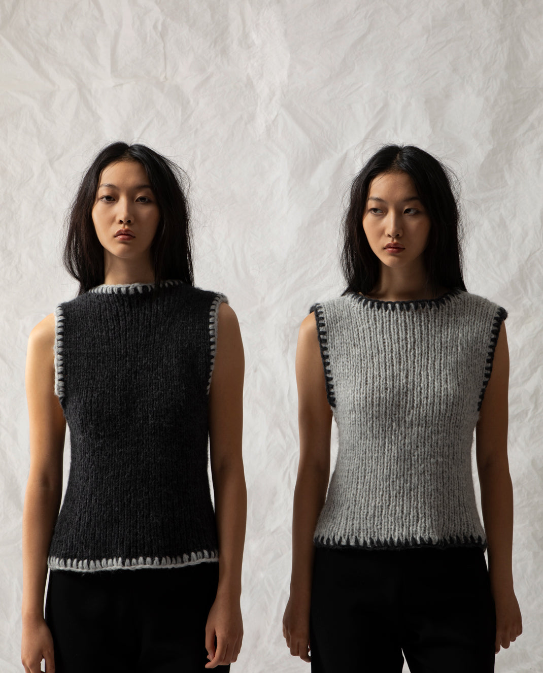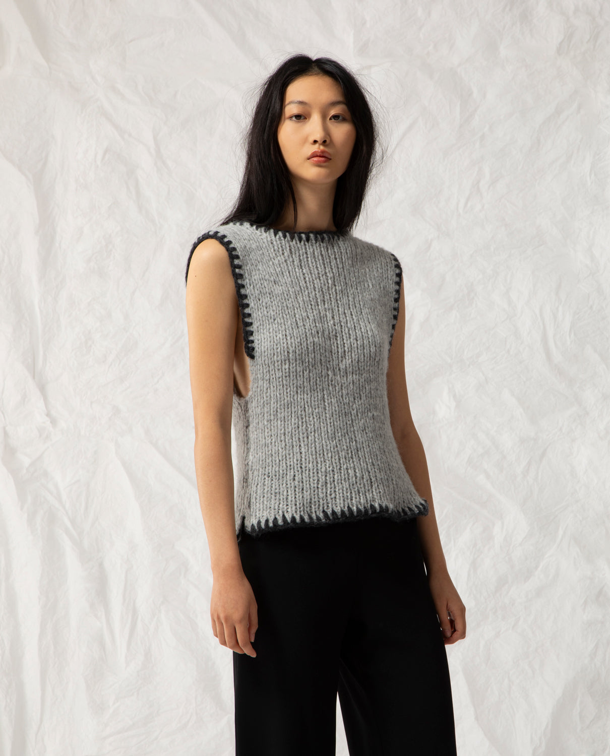 Soft and warm vest with contrasting details, hand-knitted in baby alpaca wool. Wear it alone or above your favourite shirt.