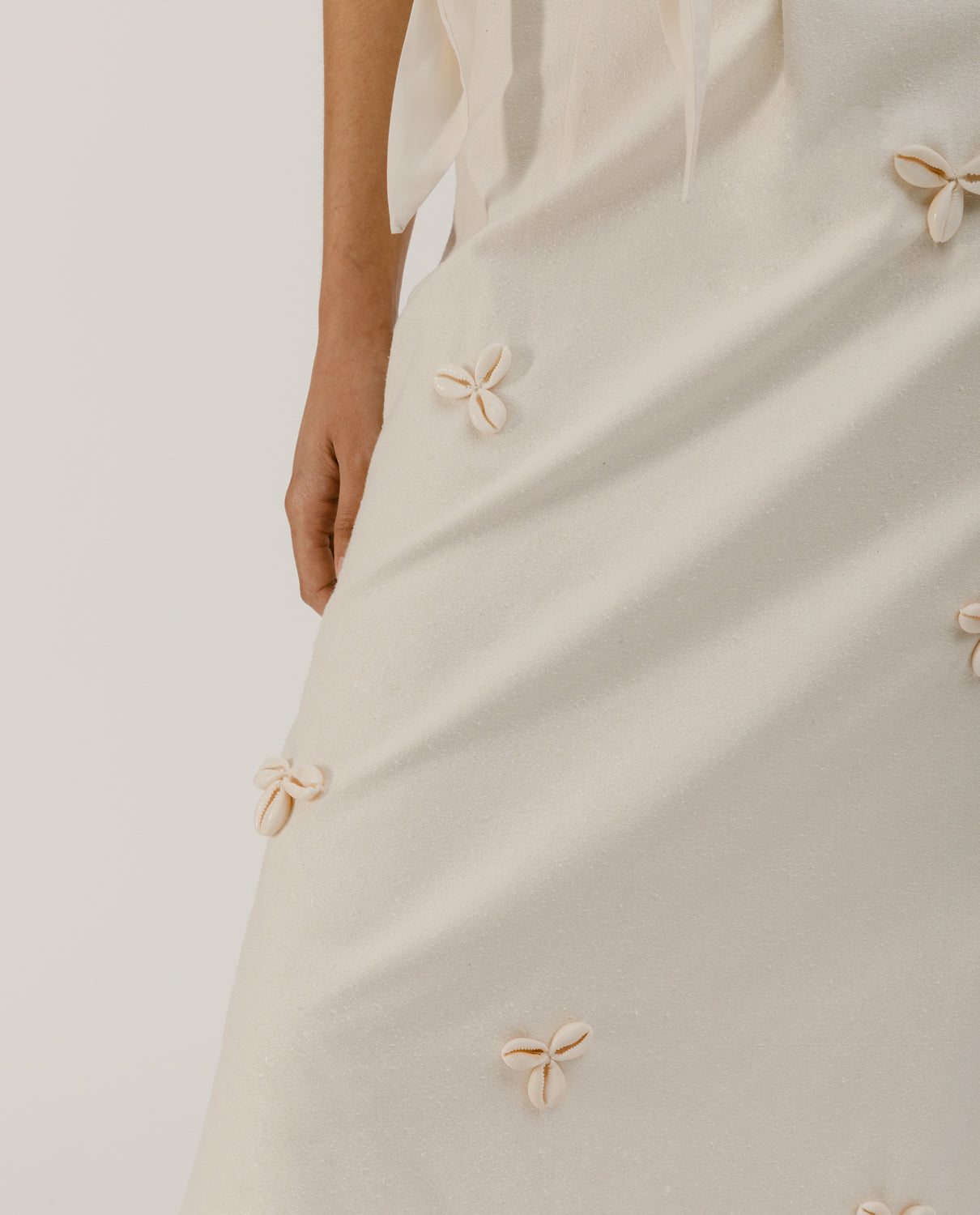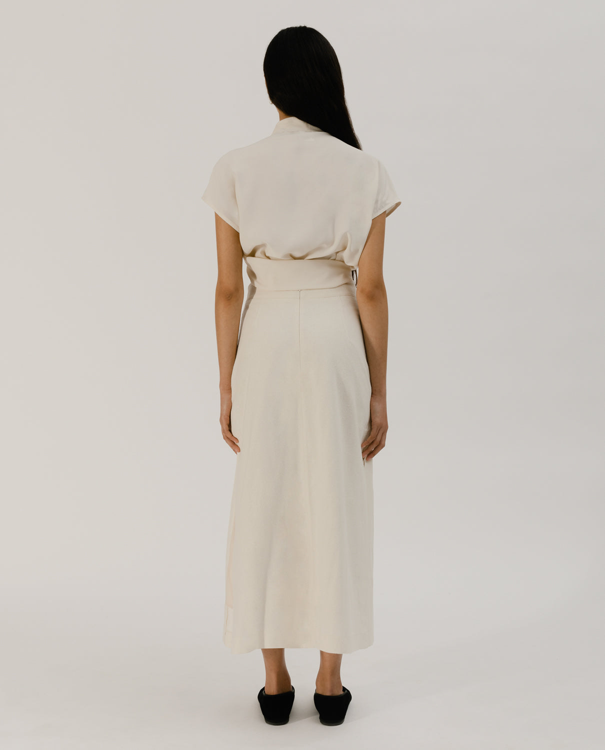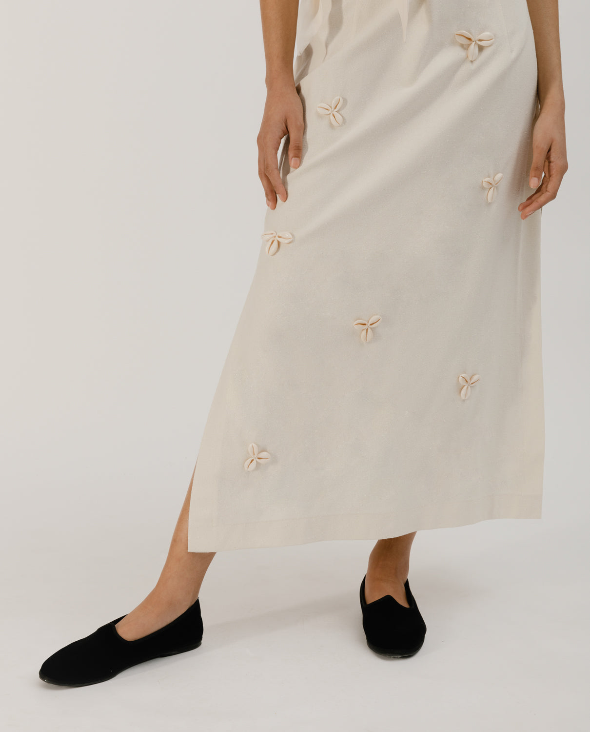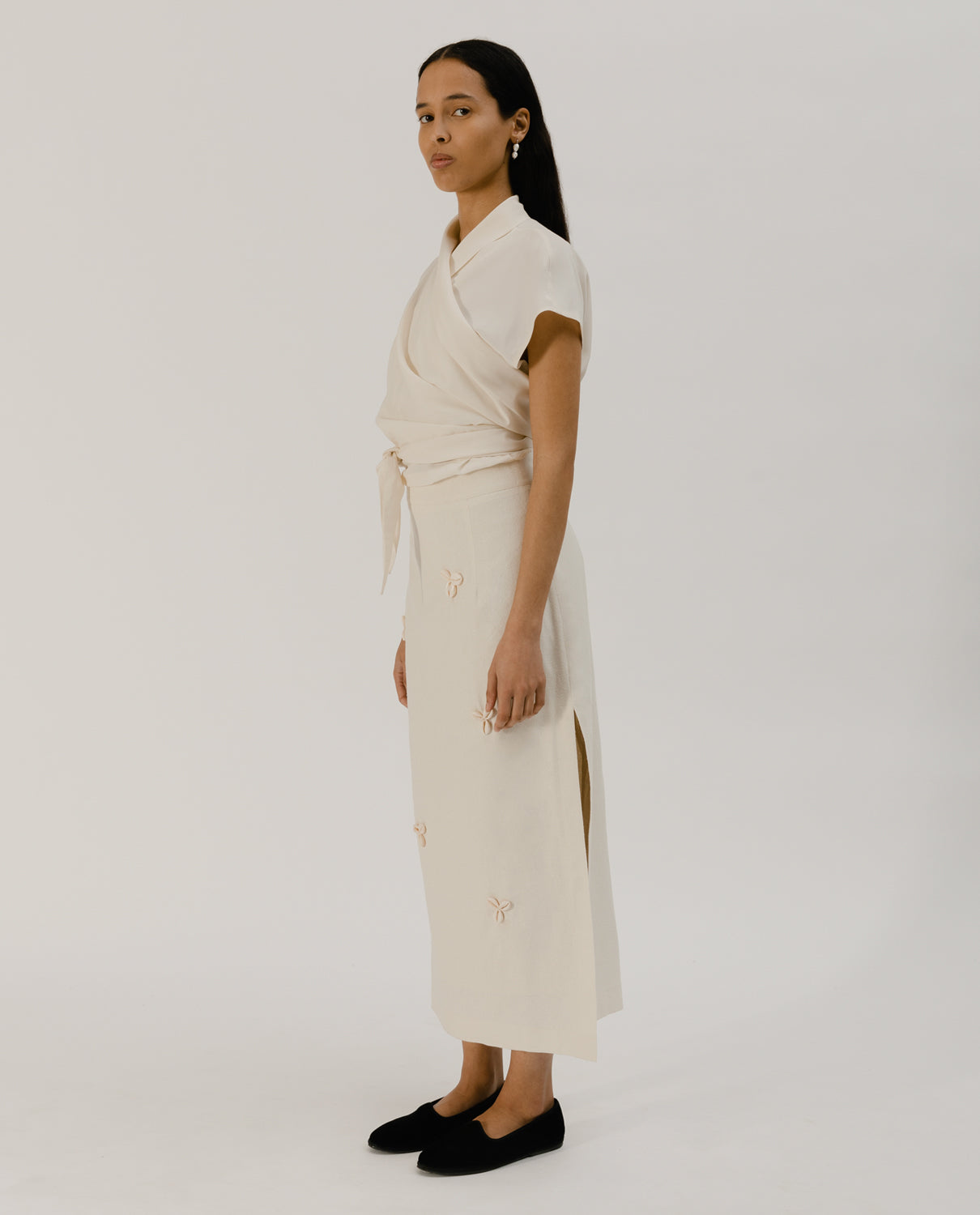 Long skirt with side slits inspired by the chinese qipao. rounded patches 100% silk.