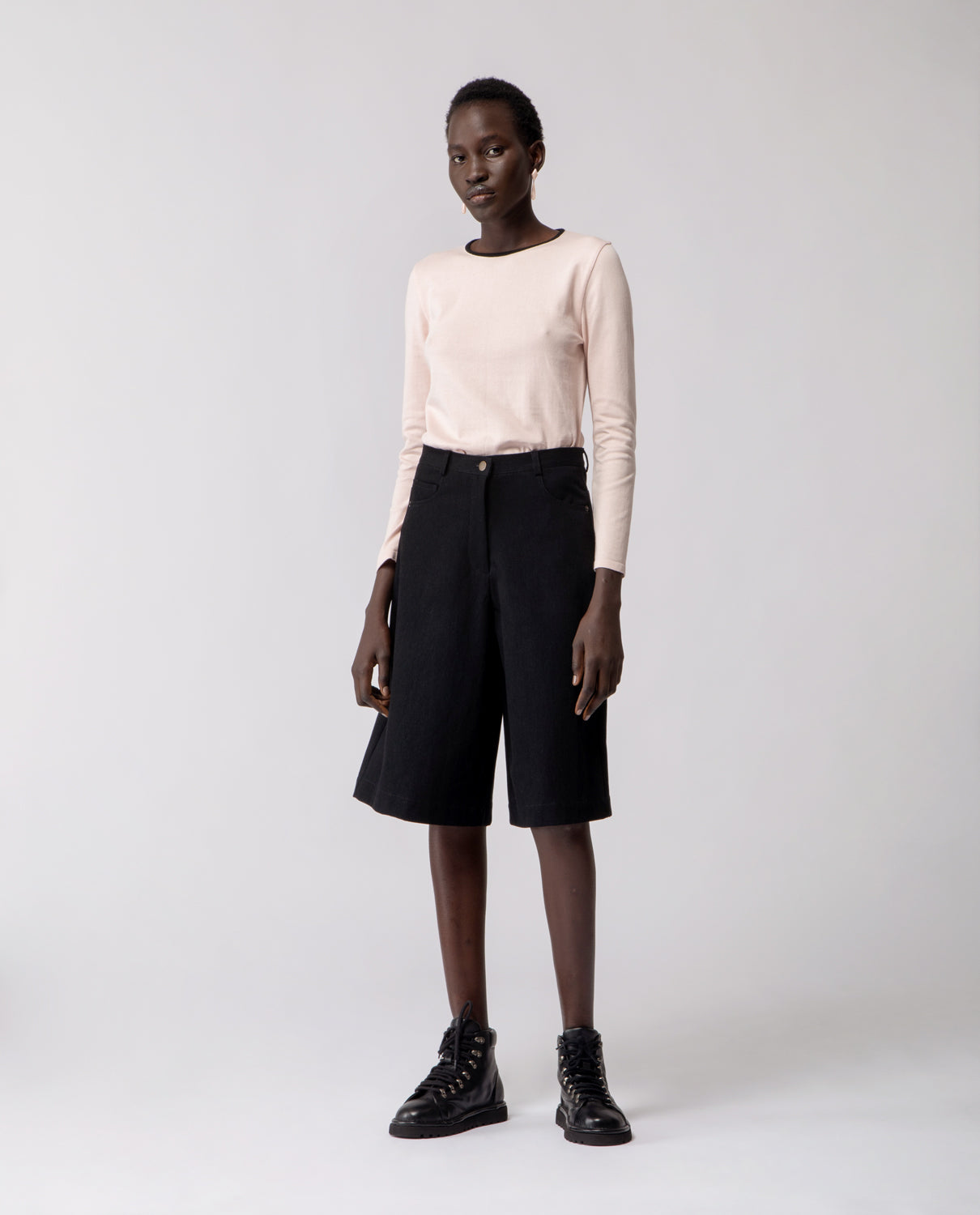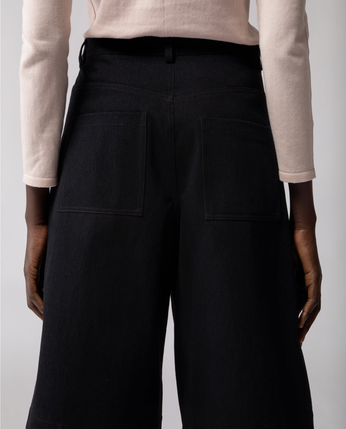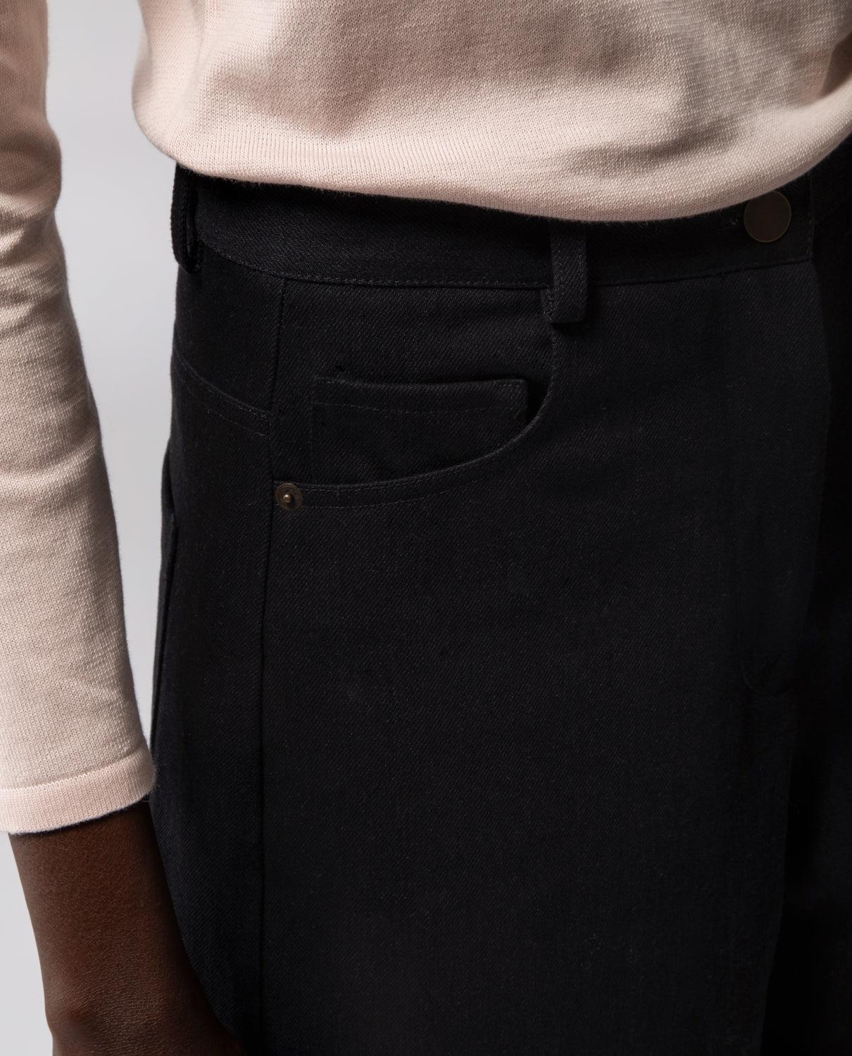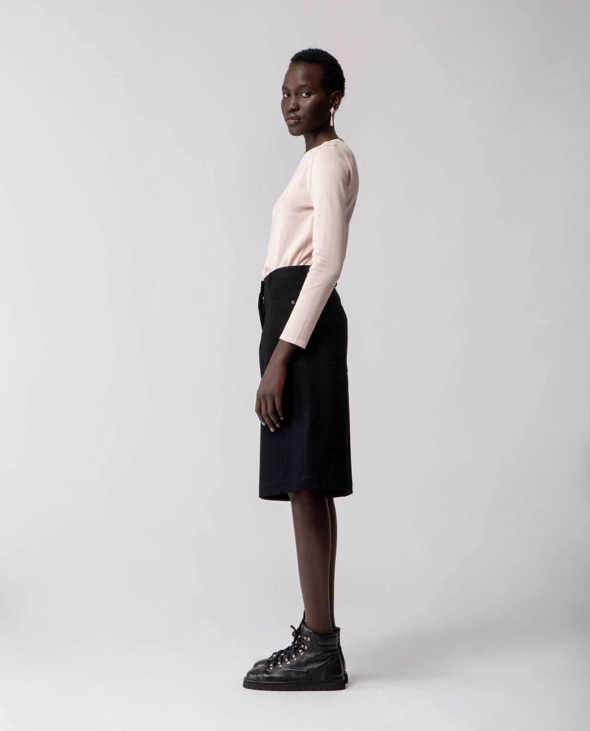 Soft jeans crafted from Japanese cotton, designed with a length that falls below the knee. The cut draws subtle references to traditional menswear and classic outdoor workwear, balancing functionality with a refined silhouette.