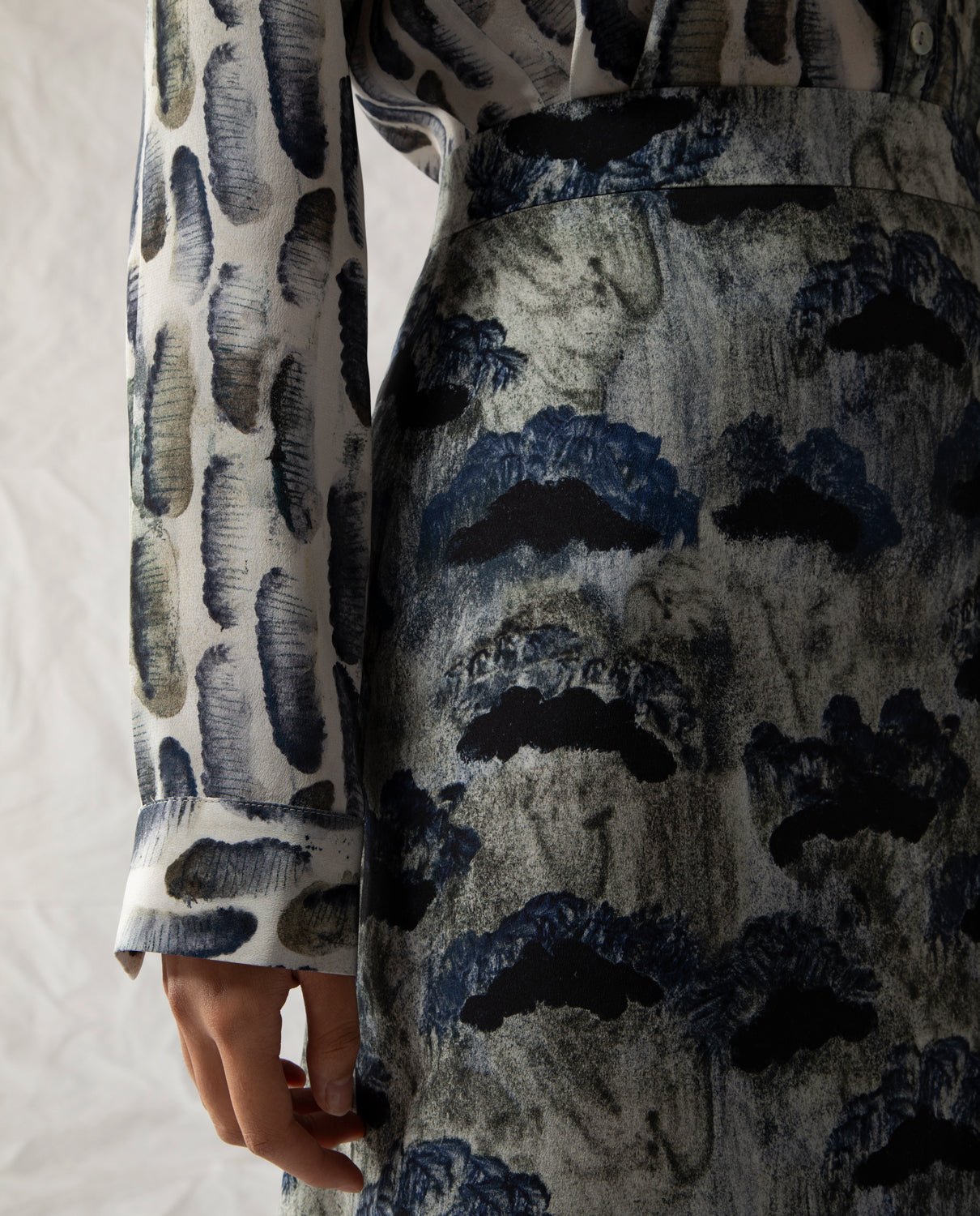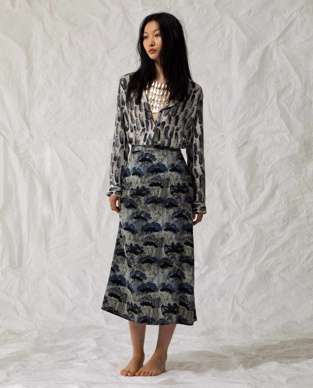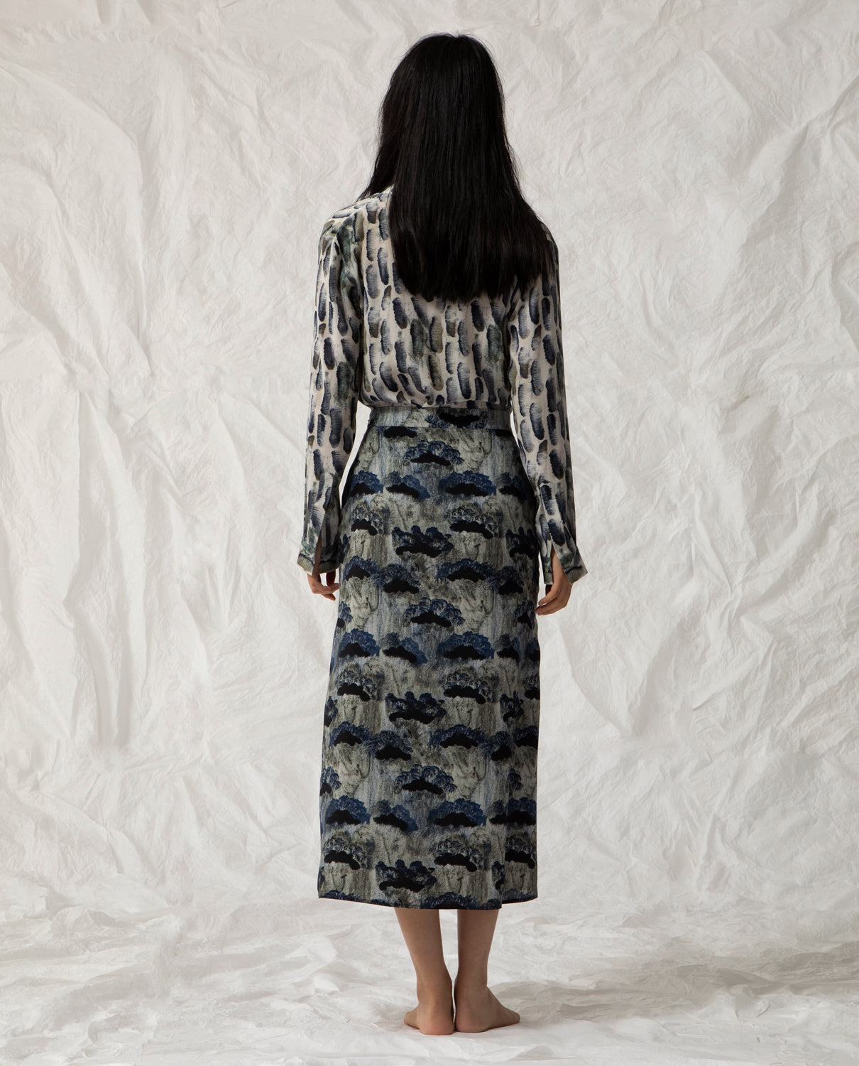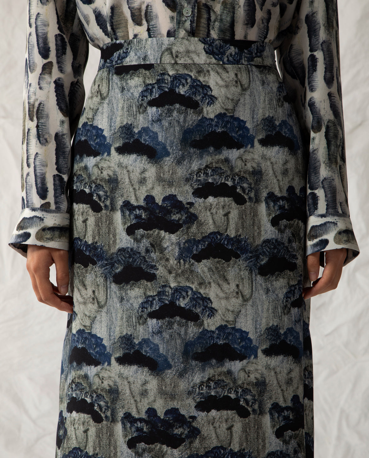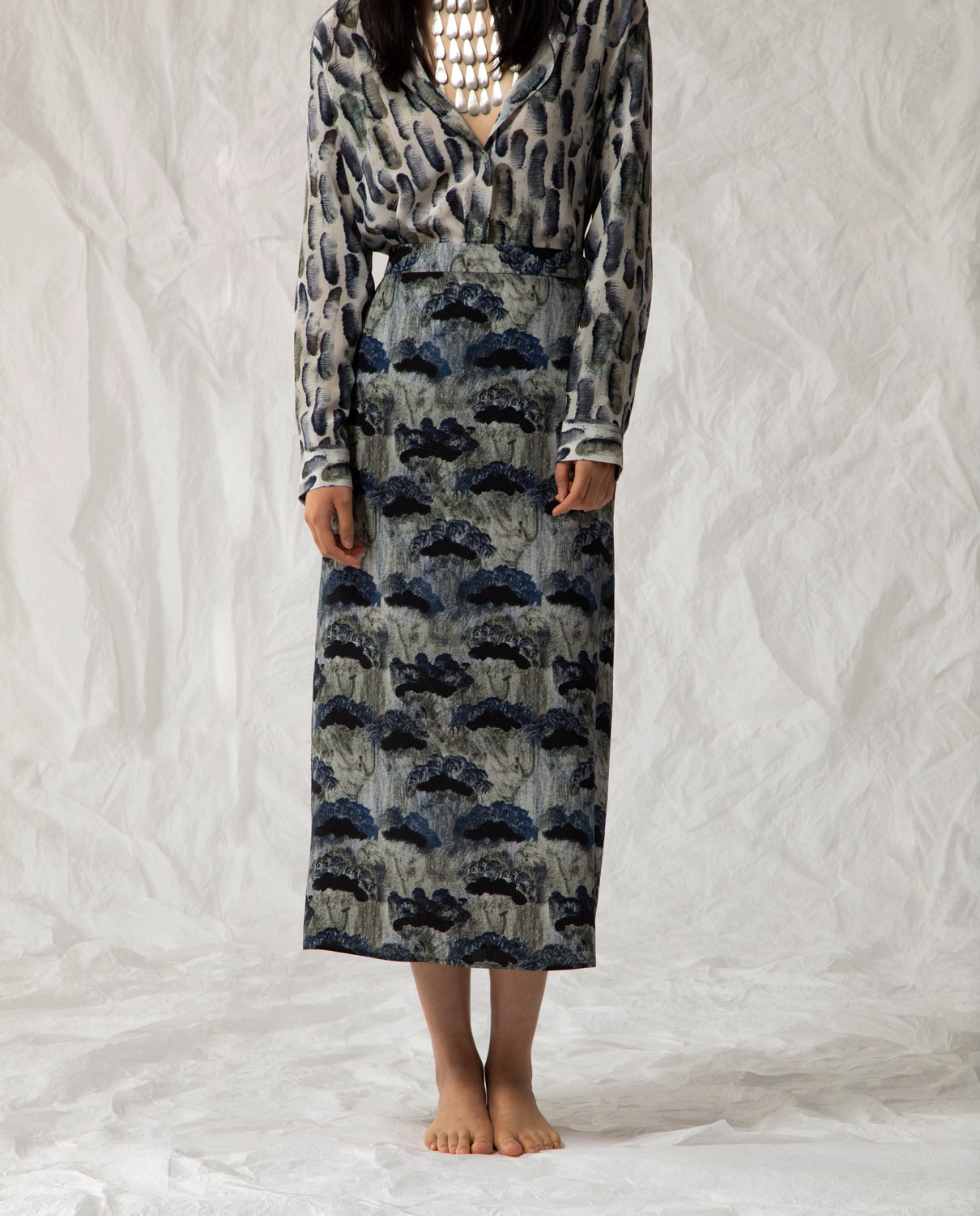 Midi skirt in pure silk with a side zip, featuring an exclusive print designed by Beatrice Alemagna.