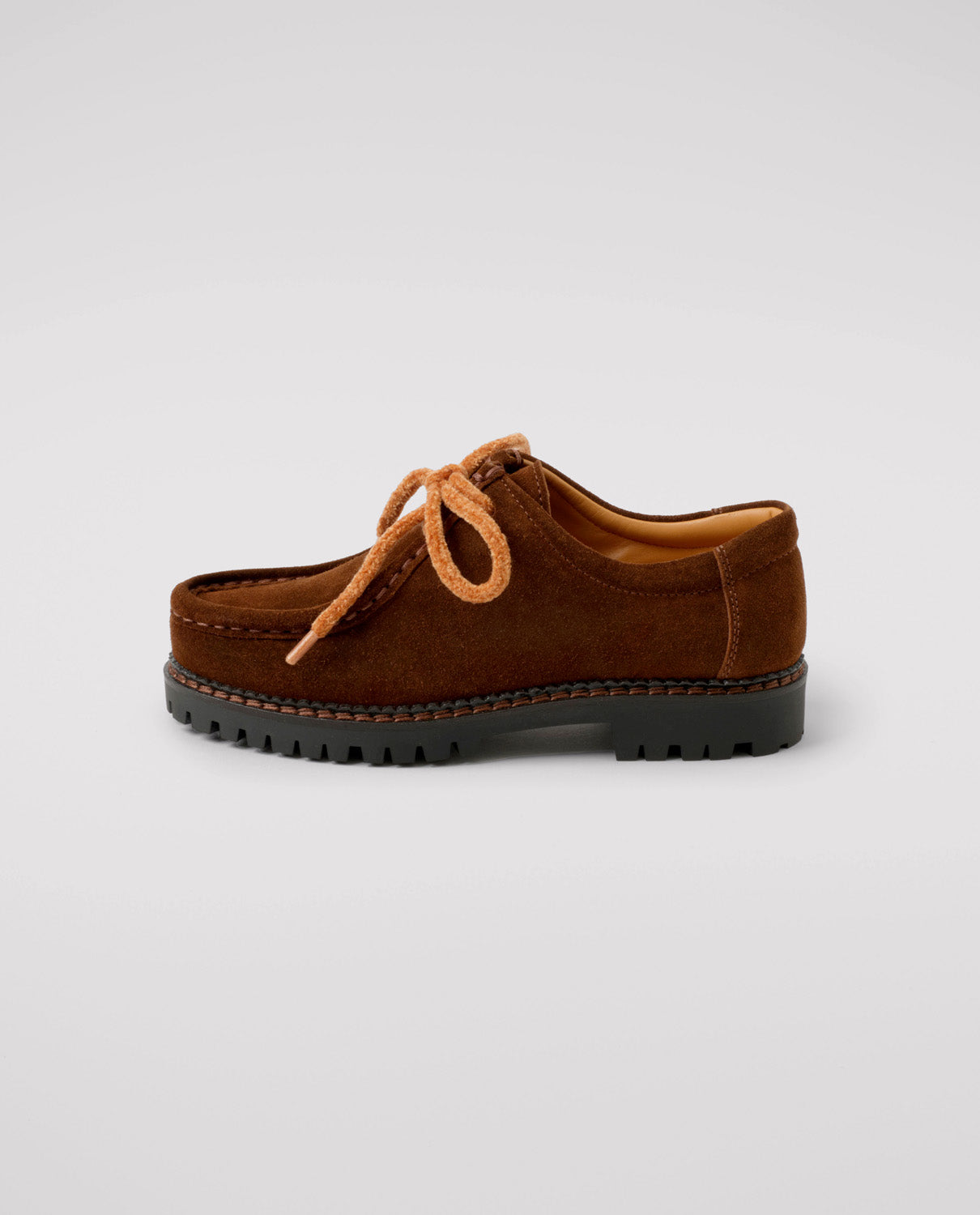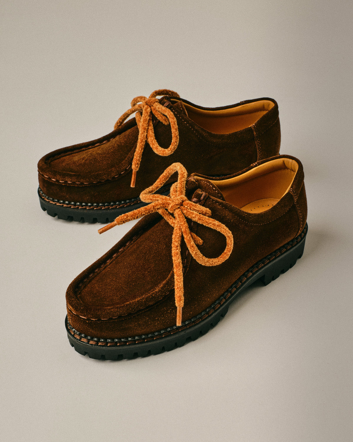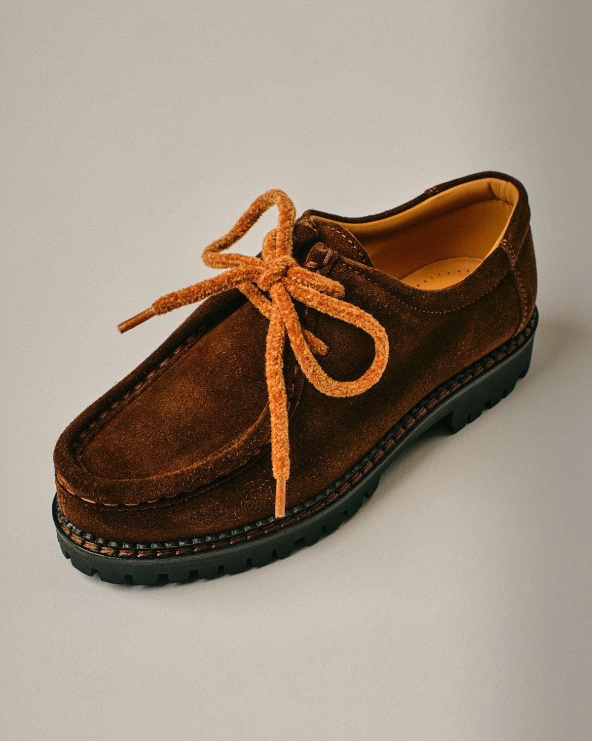 Maze's derby inspired by classic French shoes, reimagined with Italian craftsmanship. Defined by exposed stitching, a full shape, and a lug sole, it blends outdoor attitude with urban sophistication. This brown velour split-calfskin version adds softness and a matte, velvety finish — versatile for both casual and city looks. The pair comes with complementary regular matching-brown laces.