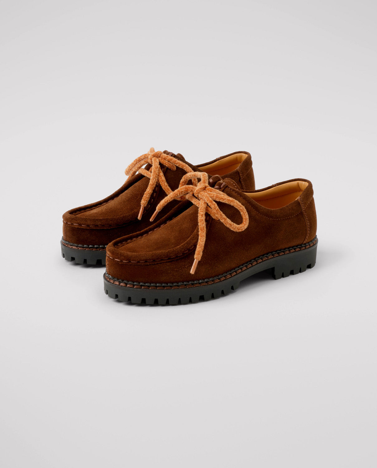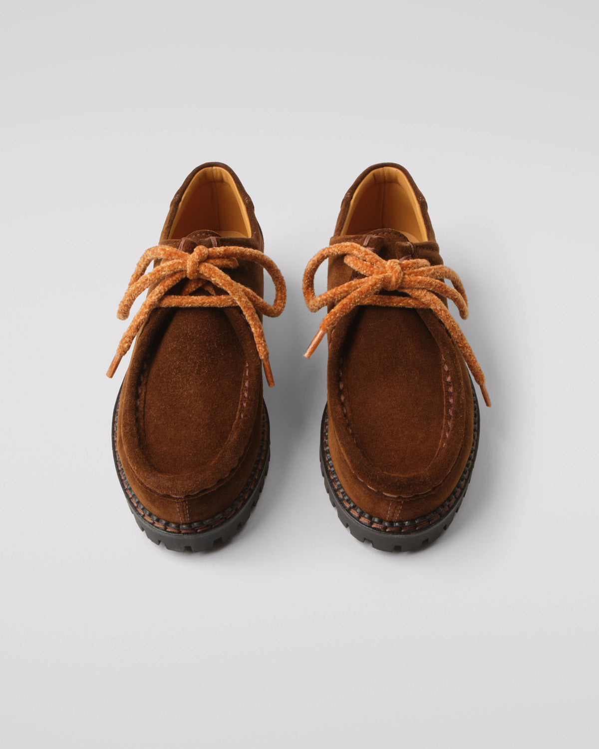 Maze's derby inspired by classic French shoes, reimagined with Italian craftsmanship. Defined by exposed stitching, a full shape, and a lug sole, it blends outdoor attitude with urban sophistication. This brown velour split-calfskin version adds softness and a matte, velvety finish — versatile for both casual and city looks.