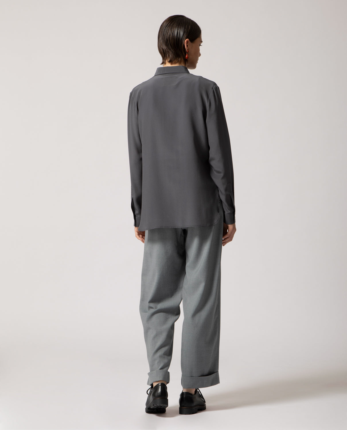 Tailored in a traditional masculine cut, these trousers feature front pleats and cuffed hems. At the back, welt pockets with button closures complete the design.