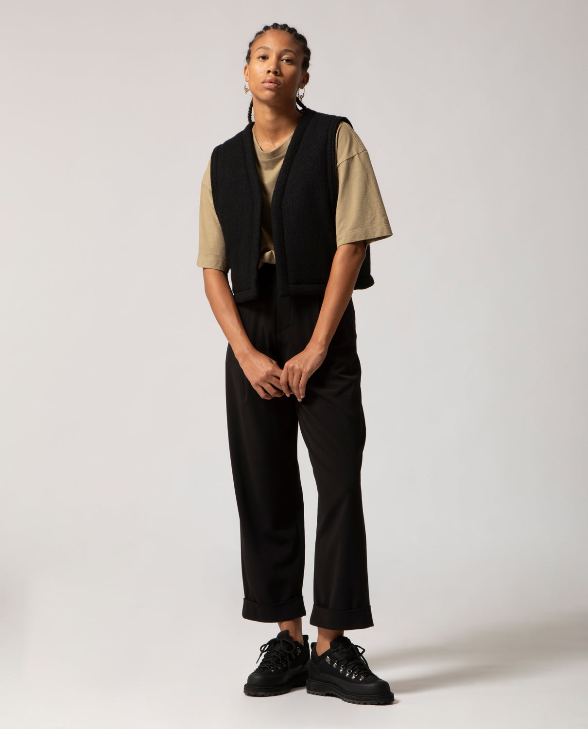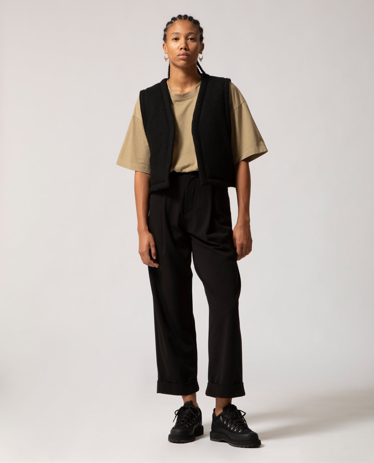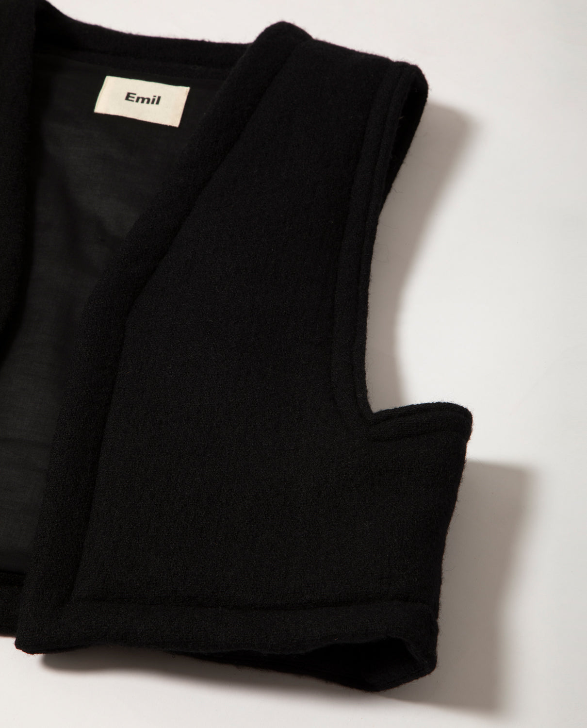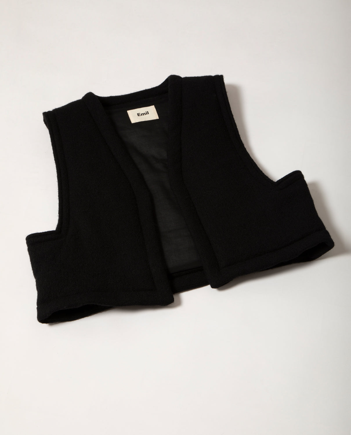 Crafted from 100% wool with a soft, warm padding, this gilet is designed to be worn open. It features a square, low armhole construction and is finished with full piping. The box fit gives it a structured yet relaxed silhouette.