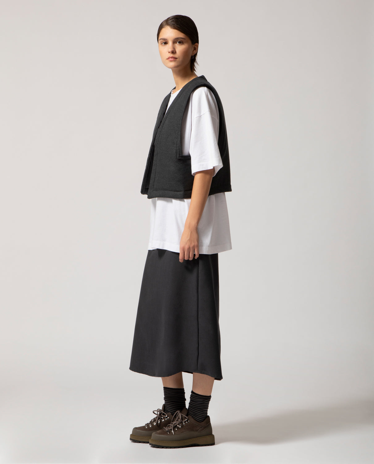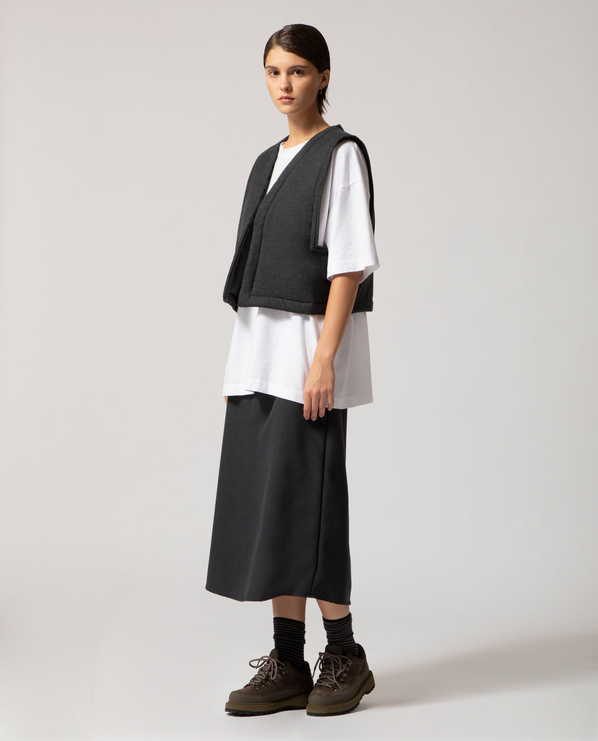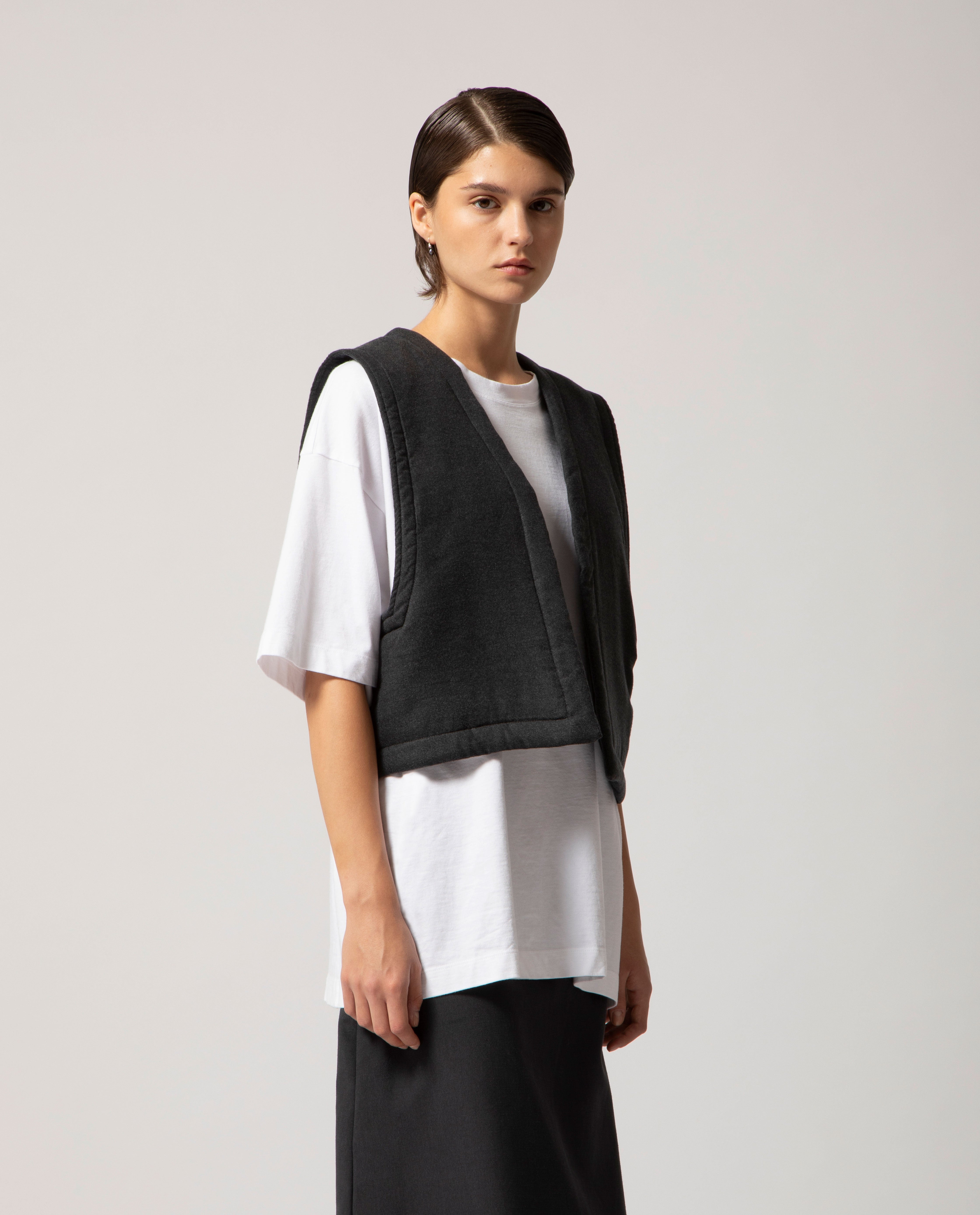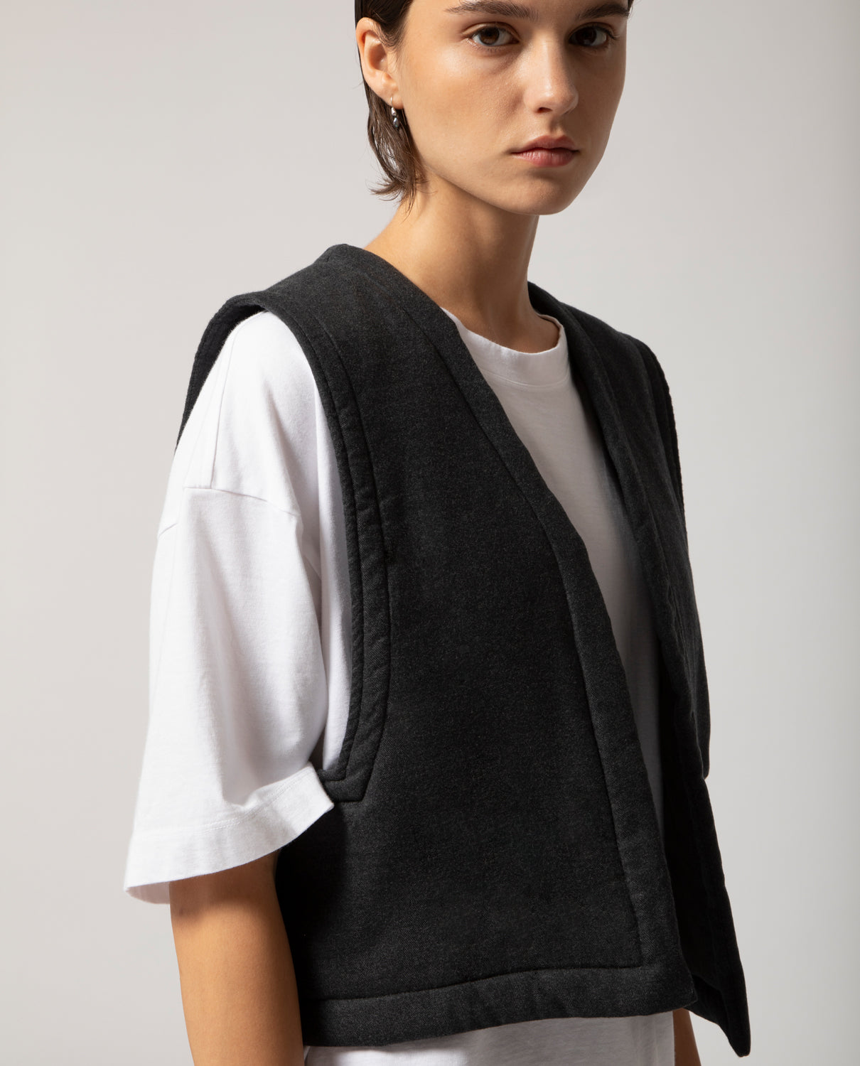 Crafted from 100% wool with a soft, warm padding, this gilet is designed to be worn open. It features a square, low armhole construction and is finished with full piping. The box fit gives it a structured yet relaxed silhouette.